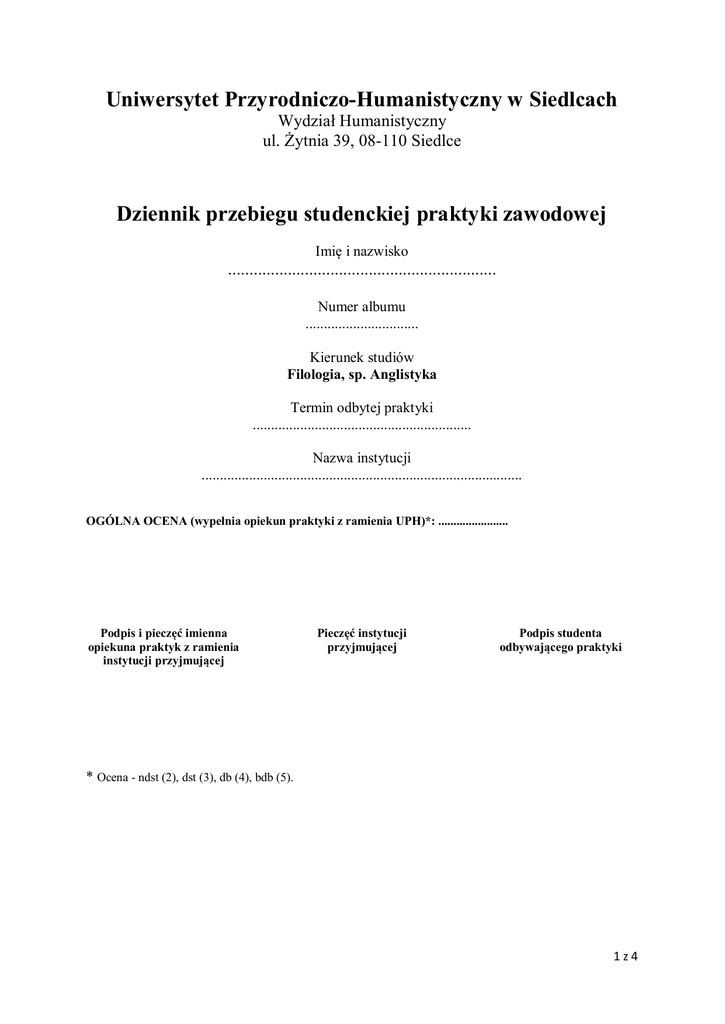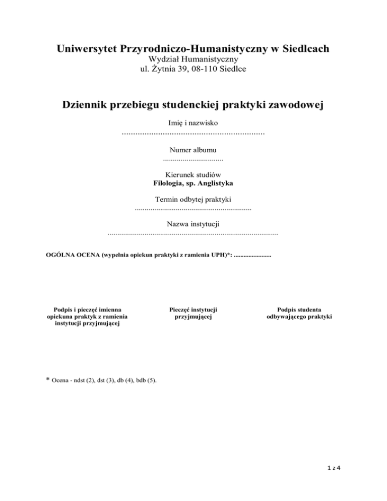 Uniwersytet Przyrodniczo-Humanistyczny w Siedlcach Wydział Humanistyczny ul. Żytnia 39, 08-110 Siedlce Dziennik przebiegu studenckiej praktyki zawodowej Imię i nazwisko ............................................................... Numer albumu ............................... Kierunek studiów Filologia, sp. Anglistyka Termin odbytej praktyki ............................................................ Nazwa instytucji ........................................................................................ OGÓLNA OCENA (wypełnia opiekun praktyki z ramienia UPH)*: ....................... Podpis i pieczęć imienna opiekuna praktyk z ramienia instytucji przyjmującej Pieczęć instytucji przyjmującej Podpis studenta odbywającego praktyki * Ocena - ndst (2), dst (3), db (4), bdb (5). 1z4 Tydzień 1 Pn Data: Wt Data: Śr Data: Czw Data: Pt Data: Tydzień 2 Pn Data: Wt Data: Śr Data: Czw Data: Pt Data: 2z4 Tydzień 3 Pn Data: Wt Data: Śr Data: Czw Data: Pt Data: Tydzień 4 Pn Data: Wt Data: Śr Data: Czw Data: Pt Data: 3z4 Ocena opisowa (wypełnia opiekun praktyk z ramienia instytucji przyjmującej): ………………………………………………………………………………………………………………………. ………………………………………………………………………………………………………………………. ………………………………………………………………………………………………………………………. ………………………………………………………………………………………………………………………. ………………………………………………………………………………………………………………………. ………………………………………………………………………………………………………………………. ………………………………………………………………………………………………………………………. ………………………………………………………………………………………………………………………. Ocena ogólna (wypełnia opiekun praktyk z ramienia instytucji przyjmującej)*: ……………………………………….. …………………………………… Podpis i pieczęć imienna opiekuna praktyk z ramienia instytucji przyjmującej * Ocena - ndst (2), dst (3), db (4), bdb (5). 4z4