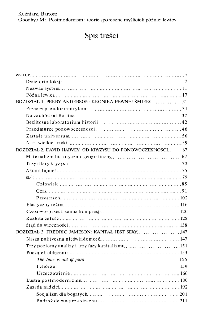 Kuźniarz, Bartosz Goodbye Mr. Postmodernism : teorie społeczne myślicieli później lewicy Spis treści WSTĘP 7 Dwie ortodoksje Nazwać system Późna lewica ROZDZIAŁ-1.-PERRY-ANDERSON:-KRONIKA-PEWNEJ-ŚMIERCI 7 11 17 31 Przeciw p s e u d o e m p i r y k o m Na zachód od Berlina Bezlitosne laboratorium historii 31 37 42 P r z e d m u r z e ponowoczesności 46 Zastałe u n i w e r s u m N u r t wielkiej rzeki 56 59 ROZDZIAŁ 2. DAVID HARVEY: OD KRYZYSU DO PONOWOCZESNOŚCI... Materializm historyczno-geograficzny 67 67 Trzy filary kryzysu 73 Akumulujcie! m/v 75 79 Człowiek 85 Czas Przestrzeń Elastyczny reżim 91 102 116 Czasowo-przestrzenna kompresja 120 Rozbita całość Stąd do wieczności 128 138 ROZDZIAŁ 3. FREDRIC JAMESON: KAPITAŁ JEST SEXY 147 Nasza polityczna nieświadomość 147 Trzy poziomy analizy i trzy fazy kapitalizmu Początek oblężenia 151 153 The-time-is-out-of-joint 155 Tchórzu! Urzeczowienie 159 166 Lustra p o s t m o d e r n i z m u Zasada nadziei 180 192 Socjalizm dla bogatych P o d r ó ż do wnętrza strachu 201 211 M o m e n t prawdy M a p y odnalezione w przyszłości ROZDZIAŁ 4. TERRY EAGLETON: SOCJALIZM I ODKUPIENIE Skrzyżowanie światów Cóż po teorii? Wola kontra ciało 227 236 241 241 245 259 Święci i psy 262 Nowe szaty cesarza Kultura i kultura 274 276 Iluzje p o s t m o d e r n i z m u Etyka socjalizmu 279 283 Miłość polityczna 301 ROZDZIAŁ 5. SLAVOJ ŽIŽEK: SOLA FIDE! Socjalizm na kozetce 315 315 G d y Boga nie ma 319 Ideologia p o n o w o c z e s n a Marksa F r e u d e m 324 336 Lacanowska krytyka Marksa 350 Korekta chrześcijaństwa Chrześcijaństwo k o n t r a j u d a i z m 364 370 Chrześcijaństwo k o n t r a b u d d y z m 382 Rewolucyjny czyn miłości 393 Niewidzialność i powtórzenie 403 ZAKOŃCZENIE: UTOPIA NIEMOŻLIWA BIBLIOGRAFIA 417 427 SUMMARY. GOODBYE MR. POSTMODERNISM. THE LATE LEFT, ITS THINKERS AND SOCIAL THEORIES INDEKS OSOBOWY 437 443