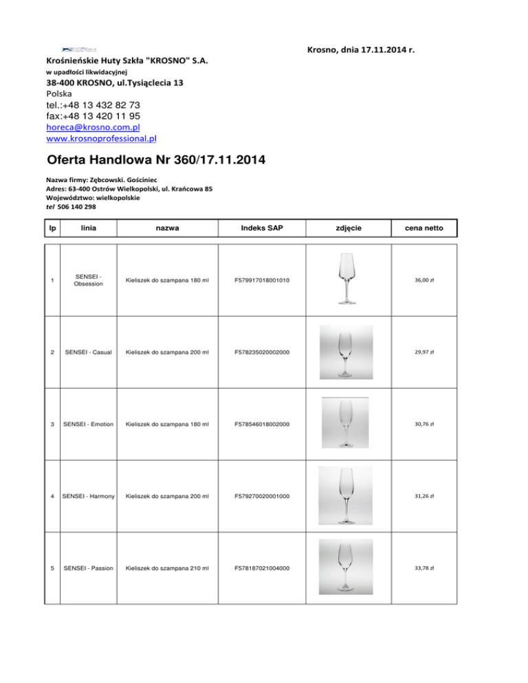 Krosno, dnia 17.11.2014 r. Krośnieńskie Huty Szkła "KROSNO" S.A. w upadłości likwidacyjnej 38-400 KROSNO, ul.Tysiąclecia 13 Polska tel.:+48 13 432 82 73 fax:+48 13 420 11 95 [email protected] www.krosnoprofessional.pl Oferta Handlowa Nr 360/17.11.2014 Nazwa firmy: Zębcowski. Gościniec Adres: 63-400 Ostrów Wielkopolski, ul. Krańcowa 85 Województwo: wielkopolskie tel 506 140 298 lp linia nazwa Indeks SAP zdjęcie cena netto 1 SENSEI Obsession Kieliszek do szampana 180 ml F579917018001010 36,00 zł 2 SENSEI - Casual Kieliszek do szampana 200 ml F578235020002000 29,97 zł 3 SENSEI - Emotion Kieliszek do szampana 180 ml F578546018002000 30,76 zł 4 SENSEI - Harmony Kieliszek do szampana 200 ml F579270020001000 31,26 zł 5 SENSEI - Passion Kieliszek do szampana 210 ml F578187021004000 33,78 zł 6 PRESTIGE Castello Kieliszek do szampana 180 ml F579326018001010 25,65 zł 7 PRESTIGE - Krista Kieliszek do szampana 150 ml F576030015006000 21,53 zł 8 PRESTIGE - Fiesta Kieliszek do szampana 160 ml F578435016001000 24,62 zł 9 LIFESTYLE Venezia Kieliszek do szampana 200 ml F575413020015000 23,59 zł 10 LIFESTYLE - Vivat Kieliszek do szampana wysoki 180 ml F573903018004000 15,53 zł 11 BASIC GLASS Kieliszek do szampana 170 ml FKMA357017001010 17,50 zł 12 KROSNO PROFESSIONAL Prima Kieliszek do szampana 160 ml F579956016001070 23,90 zł Termin ważności oferty do: 30.12.2014 r. Lub do wyczerpania zapasów Warunki dostawy: Darmowa wysyłka przy zamówieniu na kwotę 2000 netto na terenie kraju Forma płatności to przedpłata przed wysyłką towaru lub płatne przy odbiorze Przy zamówieniu na mniejszą kwotę koszt transportu jest ustalany indywidualnie. Do zamówień paletowych doliczany jest koszt palety 26,50 netto