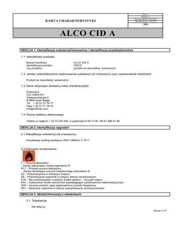 KARTA CHARAKTERYSTYKI Stron: 7 Wydanie: 5 Data sporządzenia: 15.07.2010 Data aktualizacji: 13.04.2011 395 ALCO CID A SEKCJA 1. Identyfikacja substancji/mieszaniny i identyfikacja przedsiębiorstwa 1.1 Identyfikator produktu Nazwa handlowa Identyfikacja produktu Typ produktu ALCO CID A CIECZ produkt do dezynfekcji powierzchni 1.2. Istotne zidentyfikowane zastosowanie substancji lub mieszaniny oraz zastosowania odradzane Produkt do dezynfekcji powierzchni 1.3 Dane dotyczące dostawcy karty charakterystyki Producent: CID LINES NV Waterpoortstraat 2 B-8900 Ieper Belgia Tel + 32 57 21 78 77 Faks + 32 57 21 78 79 [email protected] 1.4 Numer telefonu alarmowego Telefon w nagłych + 32 70 245 245, w godzinach 8.30-17.00 +48 61 896 81 90 SEKCJA 2. Identyfikacja zagrożeń 2.1 Klasyfikacja substancji lub mieszaniny Klasyfikacja według dyrektywy (WE) 1999/45: F; R11 2.2 Elementy oznakowania F – Wysoce łatwopalny - Zwroty wskazujące rodzaj zagrożenia R: R11 – Produkt wysoce łatwopalny. - Zwroty określające warunki bezpiecznego stosowania S: S3 – Przechowywać w chłodnym miejscu S9 – Przechowywać pojemnik w miejscu dobrze wentylowanym S16 – Nie przechowywać w pobliżu źródeł zapłonu – nie palić tytoniu S33 – Zastosować środki ostrożności zapobiegające wyładowaniom elektrostatycznym S35 – Usuwać produkt i jego opakowanie w sposób bezpieczny S51 – Stosować wyłącznie w dobrze wentylowanych pomieszczeniach SEKCJA 3. Skład/informacja o składnikach 3.1 Substancje Nie dotyczy Strona 1 z 7 Stron: 7 Wydanie: 5 Data sporządzenia: 15.07.2010 Data aktualizacji: 13.04.2011 KARTA CHARAKTERYSTYKI 395 ALCO CID A 3.2 Mieszaniny Nazwa substancji Zawartość [%] Etanol 80% Nr CAS Nr WE 64-17-5 200578-6 Nr indeksowy substancji 603-002-00-5 Nr rejestracyjny Klasyfikacja - F; R11 ------------ --------Flam. Liq. 2 (H225) SEKCJA 4. Środki pierwszej pomocy 4.1 Opis środków pierwszej pomocy - drogi oddechowe - kontakt ze skórą - kontakt z oczami - spożycie nie jest wymagana nie jest wymagana nie jest wymagana nie jest wymagana 4.2 Najważniejsze ostre i opóźnione objawy i skutki narażenia Brak danych. 4.3 Wskazania dotyczące wszelkiej natychmiastowej pomocy lekarskiej i szczególnego obchodzenia się z poszkodowanym Brak danych. SEKCJA 5. Postępowanie w przypadku pożaru 5.1 Środki gaśnicze Proszek gaśniczy, piasek, ditlenek węgla, woda. 5.2 Szczególne zagrożenia związane z substancją lub mieszaniną Opary łatwo mieszają się z powietrzem tworząc wybuchowe mieszaniny. 5.3 Informacje dla straży pożarnej Klasa palności Ochrona przed ogniem Zapobieganie Procedury specjalne produkt jest palny nie wchodzić w strefę pożaru bez odpowiedniej odzieży ochronnej oraz sprzętu ochrony dróg oddechowych – autonomicznego aparatu oddechowego zakaz używania otwartego ognia, palenia tytoniu. zachować szczególną ostrożność przy gaszeniu każdego pożaru chemikaliów Pojemniki znajdujące się w strefie pożaru schładzać mgłą wodną lub prądami wodnymi rozproszonymi SEKCJA 6. Postępowanie w przypadku niezamierzonego uwolnienia do środowiska Strona 2 z 7 KARTA CHARAKTERYSTYKI Stron: 7 Wydanie: 5 Data sporządzenia: 15.07.2010 Data aktualizacji: 13.04.2011 395 ALCO CID A 6.1 Indywidualne środki ostrożności, wyposażenie ochronne i procedury w sytuacjach awaryjnych Ochrona osobista: wyciek powinien być usunięty przez przeszkolony personel wyposażony w odpowiedni sprzęt ochrony dróg oddechowych i ochrony oczu 6.2 Środki ostrożności w zakresie ochrony środowiska W odniesieniu do środowiska nie dopuścić do przedostania się środka do kanalizacji i wód publicznych, a w razie zajścia takiego zdarzenia poinformować odpowiednie władze 6.3 Metody i materiały zapobiegające rozprzestrzenianiu się skażenia i służące do usuwania skażenia Sposób czyszczenia/zbierania wyciek usunąć do odpowiednich pojemników na odpady SEKCJA 7. Postępowanie z substancjami i mieszaninami oraz ich magazynowanie 7.1 Środki ostrożności dotyczące bezpiecznego postępowania Ogólne środki ostrożności Postępowanie/przenoszenie Ochrona osobista Techniczne środki ostrożności Środki ostrożności podczas stosowania /transportu zakaz używania otwartego ognia, palenia tytoniu. Przechowywać i postępować z produktem biorąc pod uwagę poważne potencjalne zagrożenie pożarem/wybuchem oraz zagrożenie dla zdrowia Przechowywać z dala od żywności, napojów, paszy dla zwierząt. Myć ręce i pozostałe narażone na kontakt części ciała delikatnym mydłem i wodą przed jedzeniem, piciem, paleniem i przed wyjściem z pracy. Należy ostrożnie obchodzić się z pustymi opakowaniami gdyż pary pozostałości produktu są łatwopalne. Postępować zgodnie z dobrą praktyką przemysłową oraz zasadami BHP. unikać jakiegokolwiek zbędnego narażenia, zapewnić możliwość szybkiego usunięcia produktu z oczu, skóry i ubrania zapewnić odpowiednią wentylację pomieszczeń ogólną, miejscową wyciągową. Zastosować środki ostrożności zapobiegające wyładowaniom elektrostatycznym, uziemienie Podczas stosowania mogą powstawać łatwopalne mieszaniny par produktu z powietrzem 7.2 Warunki bezpiecznego magazynowania, łącznie z informacjami dotyczącymi wszelkich wzajemnych niezgodności Magazynowanie Przechowywać z dala od: Przechowywać w ognioodpornym pomieszczeniu. Przechowywać w oryginalnym pojemniku w chłodnym, dobrze wentylowanym miejscu. Opakowanie powinno być zamknięte jeśli produkt nie jest w użyciu. Źródeł ciepła. Bezpośredniego światła słonecznego. 7.3 Szczególne zastosowanie(-a) końcowe Brak danych. SEKCJA 8. Kontrola narażenia / środki ochrony indywidualnej 8.1 Parametry dotyczące kontroli Strona 3 z 7 Stron: 7 Wydanie: 5 Data sporządzenia: 15.07.2010 Data aktualizacji: 13.04.2011 KARTA CHARAKTERYSTYKI 395 ALCO CID A Wartości NDS, NDSCh, NDSP mg/m³ NDS NDSCh NDSP Etanol 1900 - - 8.2 Kontrola narażenia Środki oc
