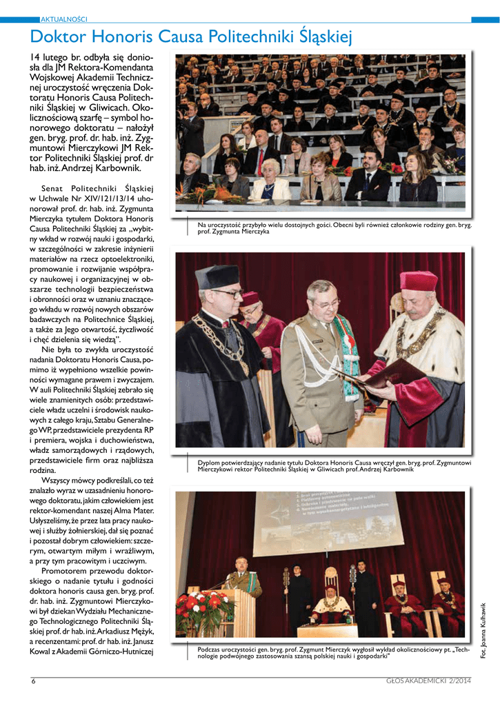 AKTUALNOŚCI Doktor Honoris Causa Politechniki Śląskiej 14 lutego br. odbyła się doniosła dla JM Rektora-Komendanta Wojskowej Akademii Technicznej uroczystość wręczenia Doktoratu Honoris Causa Politechniki Śląskiej w Gliwicach. Okolicznościową szarfę – symbol honorowego doktoratu – nałożył gen. bryg. prof. dr. hab. inż. Zygmuntowi Mierczykowi JM Rektor Politechniki Śląskiej prof. dr hab. inż. Andrzej Karbownik. 86 Na uroczystość przybyło wielu dostojnych gości. Obecni byli również członkowie rodziny gen. bryg. prof. Zygmunta Mierczyka Dyplom potwierdzający nadanie tytułu Doktora Honoris Causa wręczył gen. bryg. prof. Zygmuntowi Mierczykowi rektor Politechniki Śląskiej w Gliwicach prof. Andrzej Karbownik Podczas uroczystości gen. bryg. prof. Zygmunt Mierczyk wygłosił wykład okolicznościowy pt. Tech" nologie podwójnego zastosowania szansą polskiej nauki i gospodarki" GŁOS AKADEMICKI 2/2014 Fot. Joanna Kulhawik Senat Politechniki Śląskiej w Uchwale Nr XIV/121/13/14 uhonorował prof. dr. hab. inż. Zygmunta Mierczyka tytułem Doktora Honoris Causa Politechniki Śląskiej za „wybitny wkład w rozwój nauki i gospodarki, w szczególności w zakresie inżynierii materiałów na rzecz optoelektroniki, promowanie i rozwijanie współpracy naukowej i organizacyjnej w obszarze technologii bezpieczeństwa i obronności oraz w uznaniu znaczącego wkładu w rozwój nowych obszarów badawczych na Politechnice Śląskiej, a także za Jego otwartość, życzliwość i chęć dzielenia się wiedzą”. Nie była to zwykła uroczystość nadania Doktoratu Honoris Causa, pomimo iż wypełniono wszelkie powinności wymagane prawem i zwyczajem. W auli Politechniki Śląskiej zebrało się wiele znamienitych osób: przedstawiciele władz uczelni i środowisk naukowych z całego kraju, Sztabu Generalnego WP, przedstawiciele prezydenta RP i premiera, wojska i duchowieństwa, władz samorządowych i rządowych, przedstawiciele firm oraz najbliższa rodzina. Wszyscy mówcy podkreślali, co też znalazło wyraz w uzasadnieniu honorowego doktoratu, jakim człowiekiem jest rektor-komendant naszej Alma Mater. Usłyszeliśmy, że przez lata pracy naukowej i służby żołnierskiej, dał się poznać i pozostał dobrym człowiekiem: szczerym, otwartym miłym i wrażliwym, a przy tym pracowitym i uczciwym. Promotorem przewodu doktorskiego o nadanie tytułu i godności doktora honoris causa gen. bryg. prof. dr. hab. inż. Zygmuntowi Mierczykowi był dziekan Wydziału Mechanicznego Technologicznego Politechniki Śląskiej prof. dr hab. inż.Arkadiusz Mężyk, a recenzentami: prof. dr hab. inż. Janusz Kowal z Akademii Górniczo-Hutniczej AKTUALNOŚCI Vivat Akademia! Vivant Professores! Vivat Generał Mierczyk! – gratulował rektorowi-komendantowi WAT przewodniczący Konferencji Rektorów Akademickich Szkół Polskich, rektor Uniwersytetu Śląskiego w Katowicach prof. dr hab. Wiesław Banyś Fot. Joanna Kulhawik w Krakowie oraz prof. dr hab. inż. Włodzimierz Kurnik z Politechniki Warszawskiej. Opinię przewodu doktorskiego zatwierdziły Senaty PW i AGH. Z okazji wręczenia tytułu, okolicznościowe pisma wystosowali: prezydent RP Bronisław Komorowski, na uroczystości reprezentowany przez zastępcę szefa Biura Bezpieczeństwa Narodowego dr. Zbigniewa Włosowicza; prezes Rady Ministrów Donald Tusk, w imieniu którego gratulacje złożył poseł dr Borys Budka oraz szef Biskup polowy WP ks. bp dr Józef Guzdek w swoim wystapieniu podkreślał, że rektor-komendant WAT jest niekwestionowanym wzorem do naśladowania dla kolejnych, zwłaszcza młodych pokoleń naukowców Sztabu Generalnego WP gen. Mieczysław Gocuł, którego reprezentował zastępca szefa SG WP wiceadmirał Waldemar Głuszko. Vivat Akademia! Vivant Professores! Vivat Generał Mierczyk! Tymi słowami zakończył gratulacje przewodniczący Konferencji Rektorów Akademickich Szkół Polskich – rektor Uniwersytetu Śląskiego w Katowicach prof. dr hab.Wiesław Banyś, wzbudzając tym ogólny aplauz oraz oklaski na stojąco dla rektora-komendanta WAT. Najbardziej jednak zapadły w pamięć zebranym słowa wypowiedziane przez biskupa polowego Wojska Polskiego ks. bp. dr. Józefa Guzdka, który skonstatował: (…) Mają oczy, ale nie widzą, mają uszy, ale nie słyszą. Rektor i Senat Politechniki Śląskiej dostrzegli Proroka XXI wieku, człowieka, który widzi więcej, widzi przyszłość, z której będzie korzystał człowiek. Wiesław Grzegorzewski Gen. bryg. prof. Zygmunt Mierczyk w otoczeniu rektora Politechniki Śląskiej, promotora przewodu doktorskiego oraz obecnych na uroczystości rektorów wielu polskich uczelni cywilnych i wojskowych GŁOS AKADEMICKI 2/2014 97 AKTUALNOŚCI Magnificencjo Rektorze, Wysoki Senacie, Dostojny Doktorze Honorowy, Szanowni Państwo! wiedzialnej i lojalnej, o dużej skromności i bardzo wysokiej kulturze osobistej, należącej do grona najwybitniejszych postaci nauki polskiej w obszarze badań z zakresu fizyki i inżynierii materiałowej dla optoelektroniki, w tym techniki laserowej oraz badań na rzecz obronności i bezpieczeństwa kraju. Profesor Zygmunt Mierczyk urodził się na Górnym Śląsku w Katowicach. Ukończył studia na kierunku fizyka techniczna na Wydziale Chemii i Fizyki Technicznej Wojskowej Akademii Technicznej w Warszawie. Już w czasie studiów dwukrotnie otrzymał nagrodę specjalną sekretarza naukowego Polskiej Akademii Nauk w zakresie fizyki. Pracę naukowo-dydaktyczną rozpoczął w 1983 r., po odbyciu uprzednio rocznej praktyki w jednostce wojskowej. W Wojskowej Akademii Technicznej przeszedł kolejno wszystProf. dr hab. inż. Arkadiusz Mężyk, promotor honorowego doktoratu kie szczeble kariery gen. bryg. prof. dr. hab. inż. Zygmunta Mierczyka, w laudacji zwrócił uwagę na wzorową postawę etyczną rektora-komendanta naszej Alma naukowej: począwszy Mater od inżyniera, asystenPrzypadł mi w udziale ogromny zaszczyt, ta, adiunkta, kierowni
