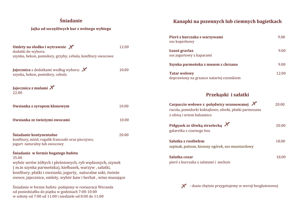 Śniadanie Kanapki na pszennych lub ciemnych bagietkach Jajka od szczęśliwych kur z wolnego wybiegu Omlety na słodko i wytrawnie dodatki do wyboru: szynka, bekon, pomidory, grzyby, cebula, konfitury owocowe Jajecznica z dodatkami według wyboru: szynka, bekon, pomidory, cebula 12.00 10.00 Jajecznica z mulami 22.00 10.00 Owsianka ze świeżymi owocami 10.00 20.00 Śniadanie w formie bogatego bufetu 35.00 wybór serów żółtych i pleśniowych, ryb wędzonych, szynek ( m.in szynka parmeńska), kiełbasek, warzyw , sałatki, konfitury, płatki i owsianki, jogurty, naturalne soki, świeże owoce, jajecznice, omlety, wybór kaw i herbat , wino musujące Śniadanie w formie bufetu podajemy w restauracji Weranda od poniedziałku do piątku w godzinach 7:00-10:00 w soboty od 7:00 od 11:00 i niedziele od 8:00 do 11:00 9.00 Łosoś gravlax sos jogurtowy z kaparami 9.00 Szynka parmeńska z musem z chrzanu 9.00 Tatar wołowy doprawiony na grzance natartej czosnkiem 12.00 Przekąski i sałatki Owsianka z syropem klonowym Śniadanie kontynentalne konfitury, miód, rogalik francuski oraz pieczywo, jogurt naturalny lub owocowy Pierś z kurczaka z warzywami sos koperkowy Carpaccio wołowe z polędwicy sezonowanej rucola, pomidorki koktajlowe, oliwki, płatki parmezanu z oliwą i octem balsamico 20.00 Półgęsek ze śliwką strzelecką galaretka z czarnego bzu 20.00 Sałatka z rostbefem szpinak, patison, kiszony ogórek, sos musztardowy 18.00 Sałatka cezar pierś z kurczaka z sałatami i anchois 18.00 - danie chętnie przygotujemy w wersji bezglutenowej Desery i lody Lunch od poniedziałku do piątku Sernik z gorącą konfiturą z wiśni 12.00 Chrupiąca beza z kremem z kasztanami i amaretto owoce 16.00 Fondue czekoladowe z owocami 16.00 Eton mess – tradycyjny angielski deser pokruszone bezy, śmietana, owoce 14.00 Dymiące cygaro z kremem kawowym z kieliszkiem rumu Havana Club 30.00 Gołąbki z dorsza, sos kurkowy, młode ziemniaki, marchewka i szparagi Suflet czekoladowy z sorbetem z porzeczek 20.00 Komosa ryżowa ze szparagami, pomidorami cherry i brokułem Domowe lody chałwowe owoce, kawior z truskawek 14.00 Praliny z lokalnych serów zagrodowych 18.00 Zupy Krem z kurek Tradycyjny polski żurek z jajkiem Rosół z perliczki, pierożki z perliczką, marchew i kolendra Chłodnik z botwinki Dania główne Sznycel drobiowy z jajkiem, młodymi ziemniakami galaretką z mizeri Udko z kaczki z pampuchem drożdżowym, karmelizowaną gruszką i młodą kapustą na słodko-kwaśno Deser Słodka niespodzianka 30.00zł ( wybrana zupa, danie główne, deser) Świeżo mielona kawa i czekolada na gorąco Herbaty liściaste Polecamy z konfiturą różaną lub malinami w syropie 5.00 Caffe creme 5.00 Espresso 5.00 Cappuccino 7.00 Herbata czarna- Darjeeling royal second flush 7.00 Kawa po wiedeńsku 9.00 Earl grey – szlachetna mieszanka z owocem bergamotki 7.00 Pomarańczowa caffe creme z bitą śmietaną Cointreau 20 ml, skórka pomarańczy 12.00 Rooibos vanilla - czerwonokrzew z dodatkiem kawałków wanilii 7.00 Kawa z advocatem i bitą śmietaną Advocat 40ml 12.00 Herbata zielona Sonne asiens royal 7.00 zielona Sencha wzbogacona trawą cytrynową i kwiatami Saflory Latte machiato z Baileisem Baileis 30 ml, espresso, mleko 12.00 Owoce letnie - kawalki jabłek i papai płatków hibiskusa, skórek dzikiej róży, owoców bzu 7.00 Irish coffee whiskey, bita śmietana, cukier trzcinowy 12.00 Ogród ziołowy- mieszanka ziołowa z trawy cytrynowej mięty Nana, czerwonokrzewu i korzenia lukrecji 7.00 Latte Machiato 200/350ml 8.00/12.00 warstwowa kawa na bazie espresso z delikatną mleczną pianą Herbata miętowa grubo krojone, aromatyczne liście mięty pieprzowej 7.00 Latte Machiato z syropem 200/350ml do wyboru: waniliowy, karmelowy lub amaretto Herbata czarna z laską cynamonu, anyżem, jabłkiem i pomarańczą 11.00 Herbata zielona z trawą cytrynową, z imbirem i limonką 11.00 Kawa zielona Czekolada na gorąco z bitą śmietaną 9.00/13.00 10.00 200/350ml 8.00/12.00 Napoje zimne Wina wytrawne 100ml Soki owocowe 200ml 5.00 Soki wyciskane z pomarańczy i grejpfrutów 200ml 10.00 Sok pomidorowy 200ml 5.00 Pepsi, Mirinda, 7up, Tonic 200ml 5.00 Woda Cisowianka gazowana/niegazowana 300/700ml 5.00/10.00 Piwo bezalkoholowe 300ml 8.00 Piwo Bydgoskie 400ml 8.00 Piwo pszeniczne 400ml 10.00 Wino białe, wytrawne 8.00 Wino czerwone, wytrawne 8.00 Wina deserowe 100ml Wino półsłodkie czerwone 10.00 Tokaj Aszu III puttonowy 20.00 Porto 20 Years Old Port Osborne 30.00 Koniak i Brandy 40ml Orzeźwiające drinki i koktajle Metaxa ******* 30.00 Calvados Boulard V.S.O.P . 35.00 Kir royal- wino musujące z creme de cassis 20.00 Armagnac Castarede V.S.O.P. 35.00 Sorbet brzoskwiniowy - wino musujące i brzoskwinie 20.00 Martel V.S. 30.00 Szprycer- wino wytrawne z wodą gazowaną i kostkami lodu 15.00 Remy Martin V.S.O.P. 35.00 Hennesy X.O. 70.00 Mojito – rum, woda gazowana, limonka, mięta, cukier trzcinowy 20.00 Mojito virgin–woda gazowana, limonka, mięta, cukier trzcinowy15.00 KAWIARNIA 10.00-15.00