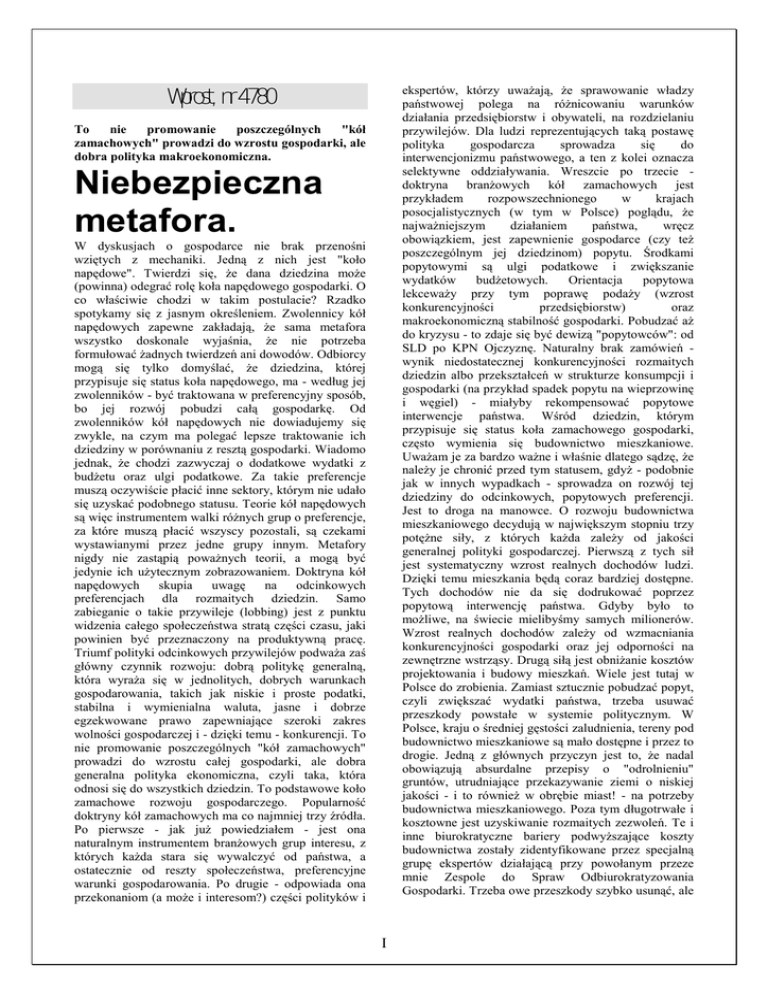 Wprost, nr 4780 ekspertów, którzy uważają, że sprawowanie władzy państwowej polega na różnicowaniu warunków działania przedsiębiorstw i obywateli, na rozdzielaniu przywilejów. Dla ludzi reprezentujących taką postawę polityka gospodarcza sprowadza się do interwencjonizmu państwowego, a ten z kolei oznacza selektywne oddziaływania. Wreszcie po trzecie doktryna branżowych kół zamachowych jest przykładem rozpowszechnionego w krajach posocjalistycznych (w tym w Polsce) poglądu, że najważniejszym działaniem państwa, wręcz obowiązkiem, jest zapewnienie gospodarce (czy też poszczególnym jej dziedzinom) popytu. Środkami popytowymi są ulgi podatkowe i zwiększanie wydatków budżetowych. Orientacja popytowa lekceważy przy tym poprawę podaży (wzrost konkurencyjności przedsiębiorstw) oraz makroekonomiczną stabilność gospodarki. Pobudzać aż do kryzysu - to zdaje się być dewizą "popytowców": od SLD po KPN Ojczyznę. Naturalny brak zamówień wynik niedostatecznej konkurencyjności rozmaitych dziedzin albo przekształceń w strukturze konsumpcji i gospodarki (na przykład spadek popytu na wieprzowinę i węgiel) - miałyby rekompensować popytowe interwencje państwa. Wśród dziedzin, którym przypisuje się status koła zamachowego gospodarki, często wymienia się budownictwo mieszkaniowe. Uważam je za bardzo ważne i właśnie dlatego sądzę, że należy je chronić przed tym statusem, gdyż - podobnie jak w innych wypadkach - sprowadza on rozwój tej dziedziny do odcinkowych, popytowych preferencji. Jest to droga na manowce. O rozwoju budownictwa mieszkaniowego decydują w największym stopniu trzy potężne siły, z których każda zależy od jakości generalnej polityki gospodarczej. Pierwszą z tych sił jest systematyczny wzrost realnych dochodów ludzi. Dzięki temu mieszkania będą coraz bardziej dostępne. Tych dochodów nie da się dodrukować poprzez popytową interwencję państwa. Gdyby było to możliwe, na świecie mielibyśmy samych milionerów. Wzrost realnych dochodów zależy od wzmacniania konkurencyjności gospodarki oraz jej odporności na zewnętrzne wstrząsy. Drugą siłą jest obniżanie kosztów projektowania i budowy mieszkań. Wiele jest tutaj w Polsce do zrobienia. Zamiast sztucznie pobudzać popyt, czyli zwiększać wydatki państwa, trzeba usuwać przeszkody powstałe w systemie politycznym. W Polsce, kraju o średniej gęstości zaludnienia, tereny pod budownictwo mieszkaniowe są mało dostępne i przez to drogie. Jedną z głównych przyczyn jest to, że nadal obowiązują absurdalne przepisy o "odrolnieniu" gruntów, utrudniające przekazywanie ziemi o niskiej jakości - i to również w obrębie miast! - na potrzeby budownictwa mieszkaniowego. Poza tym długotrwałe i kosztowne jest uzyskiwanie rozmaitych zezwoleń. Te i inne biurokratyczne bariery podwyższające koszty budownictwa zostały zidentyfikowane przez specjalną grupę ekspertów działającą przy powołanym przeze mnie Zespole do Spraw Odbiurokratyzowania Gospodarki. Trzeba owe przeszkody szybko usunąć, ale To nie promowanie poszczególnych "kół zamachowych" prowadzi do wzrostu gospodarki, ale dobra polityka makroekonomiczna. Niebezpieczna metafora. W dyskusjach o gospodarce nie brak przenośni wziętych z mechaniki. Jedną z nich jest "koło napędowe". Twierdzi się, że dana dziedzina może (powinna) odegrać rolę koła napędowego gospodarki. O co właściwie chodzi w takim postulacie? Rzadko spotykamy się z jasnym określeniem. Zwolennicy kół napędowych zapewne zakładają, że sama metafora wszystko doskonale wyjaśnia, że nie potrzeba formułować żadnych twierdzeń ani dowodów. Odbiorcy mogą się tylko domyślać, że dziedzina, której przypisuje się status koła napędowego, ma - według jej zwolenników - być traktowana w preferencyjny sposób, bo jej rozwój pobudzi całą gospodarkę. Od zwolenników kół napędowych nie dowiadujemy się zwykle, na czym ma polegać lepsze traktowanie ich dziedziny w porównaniu z resztą gospodarki. Wiadomo jednak, że chodzi zazwyczaj o dodatkowe wydatki z budżetu oraz ulgi podatkowe. Za takie preferencje muszą oczywiście płacić inne sektory, którym nie udało się uzyskać podobnego statusu. Teorie kół napędowych są więc instrumentem walki różnych grup o preferencje, za które muszą płacić wszyscy pozostali, są czekami wystawianymi przez jedne grupy innym. Metafory nigdy nie zastąpią poważnych teorii, a mogą być jedynie ich użytecznym zobrazowaniem. Doktryna kół napędowych skupia uwagę na odcinkowych preferencjach dla rozmaitych dziedzin. Samo zabieganie o takie przywileje (lobbing) jest z punktu widzenia całego społeczeństwa stratą części czasu, jaki powinien być przeznaczony na produktywną pracę. Triumf polityki odcinkowych przywilejów podważa zaś główny czynnik rozwoju: dobrą politykę generalną, która wyraża się w jednolitych, dobrych warunkach gospodarowania, takich jak niskie i proste podatki, stabilna i wymienialna waluta, jasne i dobrze egzekwowane prawo zapewniające szeroki zakres wolności gospodarczej i - dzięki temu - konkurencji. To nie promowanie poszczególnych "kół zamachowych" prowadzi do wzrostu całej gospodarki, ale dobra generalna polityka ekonomiczna, czyli taka, która odnosi się do wszystkich dziedzin. To podstawowe koło zamachowe rozwoju gospodarczego. Popularność doktryny kół zamachowych ma co najmniej trzy źródła. Po pierwsze - jak już powiedziałem - jest ona naturalnym instrumentem branżowych grup interesu, z których każda stara się wywalczyć od państwa, a ostatecznie od reszty społeczeństwa, preferencyjne warunki gospodarowania. Po drugie - odpowiada ona przekonaniom (a może i interesom?) części polityków i I do tego potrzebne jest skoncentrowane poparcie. Za obroną absurdów kryją się bowiem zwykle niemałe interesy i (lub) od dawna zwietrzałe poglądy. Niech energia społeczna sk