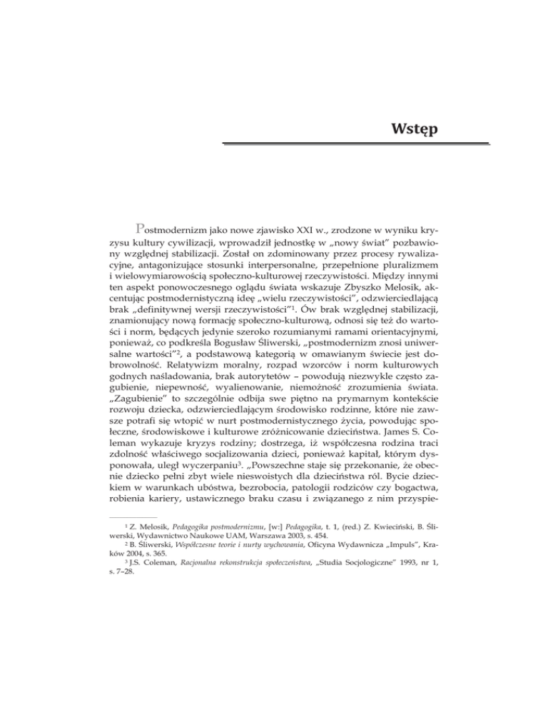 Wst¸p Postmodernizm jako nowe zjawisko XXI w., zrodzone w wyniku kryzysu kultury cywilizacji, wprowadziã jednostkč w „nowy Ĥwiat” pozbawiony wzglčdnej stabilizacji. Zostaã on zdominowany przez procesy rywalizacyjne, antagonizujĈce stosunki interpersonalne, przepeãnione pluralizmem i wielowymiarowoĤciĈ spoãeczno-kulturowej rzeczywistoĤci. Mičdzy innymi ten aspekt ponowoczesnego oglĈdu Ĥwiata wskazuje Zbyszko Melosik, akcentujĈc postmodernistycznĈ ideč „wielu rzeczywistoĤci”, odzwierciedlajĈcĈ brak „definitywnej wersji rzeczywistoĤci”1. Ów brak wzglčdnej stabilizacji, znamionujĈcy nowĈ formacjč spoãeczno-kulturowĈ, odnosi sič teİ do wartoĤci i norm, bčdĈcych jedynie szeroko rozumianymi ramami orientacyjnymi, poniewaİ, co podkreĤla Bogusãaw ģliwerski, „postmodernizm znosi uniwersalne wartoĤci”2, a podstawowĈ kategoriĈ w omawianym Ĥwiecie jest dobrowolnoĤþ. Relatywizm moralny, rozpad wzorców i norm kulturowych godnych naĤladowania, brak autorytetów – powodujĈ niezwykle czčsto zagubienie, niepewnoĤþ, wyalienowanie, niemoİnoĤþ zrozumienia Ĥwiata. „Zagubienie” to szczególnie odbija swe pičtno na prymarnym kontekĤcie rozwoju dziecka, odzwierciedlajĈcym Ĥrodowisko rodzinne, które nie zawsze potrafi sič wtopiþ w nurt postmodernistycznego İycia, powodujĈc spoãeczne, Ĥrodowiskowe i kulturowe zróİnicowanie dziecięstwa. James S. Coleman wykazuje kryzys rodziny; dostrzega, iİ wspóãczesna rodzina traci zdolnoĤþ wãaĤciwego socjalizowania dzieci, poniewaİ kapitaã, którym dysponowaãa, ulegã wyczerpaniu3. „Powszechne staje sič przekonanie, İe obecnie dziecko peãni zbyt wiele nieswoistych dla dziecięstwa ról. Bycie dzieckiem w warunkach ubóstwa, bezrobocia, patologii rodziców czy bogactwa, robienia kariery, ustawicznego braku czasu i zwiĈzanego z nim przyspie________________ 1 Z. Melosik, Pedagogika postmodernizmu, [w:] Pedagogika, t. 1, (red.) Z. Kwiecięski, B. ģliwerski, Wydawnictwo Naukowe UAM, Warszawa 2003, s. 454. 2 B. ģliwerski, Wspóãczesne teorie i nurty wychowania, Oficyna Wydawnicza „Impuls”, Kraków 2004, s. 365. 3 J.S. Coleman, Racjonalna rekonstrukcja spoãeczeęstwa, „Studia Socjologiczne” 1993, nr 1, s. 7–28. 8 Wstčp szenia, w kaİdym przypadku oznacza wzrastanie poza rodzinĈ – na ulicy lub w instytucjach”4. Ulrich Beck, analizujĈc dziecięstwo doĤwiadczane w nowoczesnym spoãeczeęstwie, wyróİniã cechy „supernowoczesnego” dziecka, bčdĈce przykãadem „refleksyjnej nowoczesnoĤci”. Znamionuje je mičdzy innymi: – koniecznoĤþ dostosowania sič do nowej formy İycia rodzinnego bez jednego lub obojga rodziców; – duİa samodzielnoĤþ – refleksyjnoĤþ poprzez uczestniczenie w obowiĈzkach domowych; – zdolnoĤþ do koordynowania – niezaleİnie od rodziców – róİnorodnych rodzajów aktywnoĤci, terminów zajčþ w czasie wolnym i znajdowania wãasnego, odrčbnego od rodziny rytmu czasu; jest to typ dziecięstwa charakterystyczny dla czasów póĮnej ponowoczesnoĤci; – rozwiničcie wãasnego spektrum aktywnoĤci, zwãaszcza podczas nieobecnoĤci obojga rodziców; – İycie na „wyspowych przestrzeniach” i inscenizowanie wãasnych kompleksowych stosunków spoãecznych (stosunki przyjaĮni, grupy); – wzrastajĈca samodzielnoĤþ ksztaãtowania wãasnej biografii (przebieg ksztaãcenia, przebieg İycia), refleksyjne opracowywanie, integrowanie wãasnej historii İycia; – brak moİliwoĤci wyboru, np. sytuacji rodzinnej; stanowi to powód wytworzenia sič samodzielnoĤci adekwatnej do sytuacji; – dĈİenie do sprostania wymaganiom ze strony dorosãych5. Postmodernistyczne dziecko zagroİone jest zatem z powodu narzuconej mu czčsto samodzielnoĤci, rozluĮnieniem wičzi biologicznej i emocjonalnej z rodzicami, zarówno w rodzinach biednych, jak i zasobnych (z powodu dezorganizacji rodziny wynikajĈcej z trudnych warunków materialnych, rozwodów, konfliktów, migracji zarobkowej rodziców, patologii wystčpujĈcych w rodzinie, ogromnego zaangaİowania rodziców w dziaãalnoĤþ zawodowĈ), co czčsto skutkuje mičdzy innymi: • poczuciem osamotnienia dzieci, ãĈczĈcego sič ze smutkiem, lčkiem, niejednokrotnie gniewem, rozczarowaniem, poczuciem nieszczčĤcia, wywoãujĈcym stany frustracyjne i stresowe prowadzĈce nieraz do ________________ 4 M. Nyczaj-DrĈg, Dzieci wysokiej jakoĤci w ponowoczesnym Ĥwiecie. Esej o koniecznoĤci i ryzyku instytucjonalizacji dziecięstwa, [w:] Wspóãprzestrzenie edukacji. Szkoãa – Rodzina – Spoãeczeęstwo – Kultura, (red.) M. Nyczaj-DrĈg, M. Gãaİewski, Oficyna Wydawnicza „Impuls”, Kraków 2005, s. 146. 5 Za: W. Danilewicz, Dziecięstwo w rodzinie migracyjnej, [w:] Dziecko a zagroİenia wspóãczesnego Ĥwiata, (red.) S. Guz, Wydawnictwo Uniwersytetu Marii Curie-Skãodowskiej, Lublin 2008, s. 139. Wstčp 9 okreĤlonych zaburzeę zachowania, a czasem takich wstrzĈsajĈcych zjawisk, jakimi sĈ samobójstwa; • naduİywaniem agresji, przemocy zarówno w stosunkach mičdzy dzieþmi, jak i krzywdzeniem dzieci przez rodziców; • potrzebĈ udzielania dzieciom i ich rodzicom wsparcia po to, by rodzina byãa wãaĤciwym Ĥrodowiskiem dla „zaspokajania podstawowych potrzeb oraz do uaktywniania i kultywowania wãasnych zdolnoĤci czy talentów, gdzie samorealizacja zarówno dzieci, jak i rodziców jest priorytetem, generujĈc konstruktywne postawy wobec spoãeczeęstwa pozarodzinnego”6. Niezwykle istotne jest zatem wprowadzenie zasadniczych zmian w İyciu rodziny, by, jak stwierdza David Elkind, wspóãczesna rodzina staãa sič „witalnĈ rodzinĈ”, wydolnĈ w speãnianiu swych funkcji opiekuęczo-wychowawczych oraz wykazujĈcĈ synergič edukacyjnĈ pomičdzy niĈ a placówkami oĤwiatowymi, do których uczčszczajĈ dzieci. Poniewaİ nie jest to ãatwe do speãnienia we wspóãczesnej rzeczywistoĤci, bardzo waİne jest rozwijanie podstawowych kompetencji zarówno dzieci,