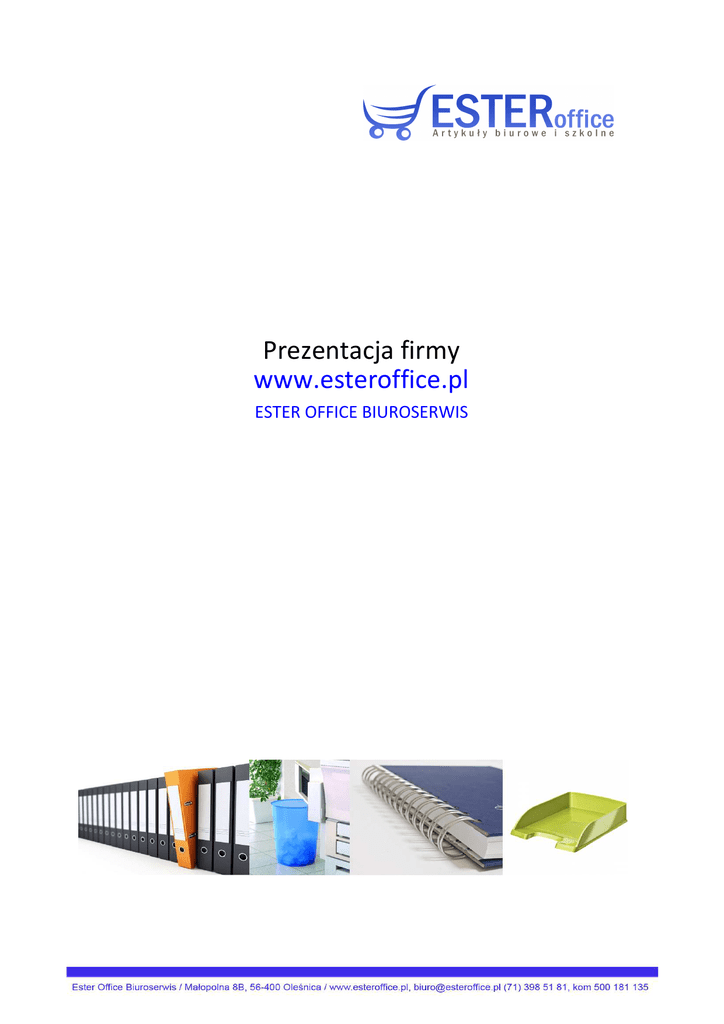 Prezentacja firmy www.esteroffice.pl ESTER OFFICE BIUROSERWIS Kim jesteśmy? Firma Ester s.c. powstała w roku 1998. Od początku działalności specjalizuje się w sprzedaży artykułów biurowych oraz szkolnych zaopatrując małe, średnie, duże przedsiębiorstwa oraz szkoły, sklepy detaliczne itd. Wieloletnie doświadczenie pozwala nam na oferowanie Państwu produktów znanych producentów z branży biurowej w atrakcyjnych cenach, przy zachowaniu profesjonalnej obsługi klienta. Do czego dążymy? Doświadczenie które zebraliśmy przez kilkanaście lat działalności pozwala nam sprawnie rozpoznawać, a następnie zaspokajać potrzeby klientów różnych branż. Dlatego dokładamy wszelkich starań, aby towary które proponujemy na naszej platformie sprzedażowej były zgodne z Państwa wymaganiami. Dzięki sugestią naszych Klientów często dodajemy nowe produktów do naszej oferty sklepu internetowego. Jak działamy? Zaopatrzymy każdą firmę w dowolnym mieście Polski. Posiadamy własny transport, oraz podpisaną umowę z kurierem, który dostarczy przesyłkę już w 24h, od dnia wysyłki. Dajemy Państwu możliwość składania zamówienia poprzez: - sklep on-line (nowoczesna platforma sprzedażowa) - e-mailowo ( wystarczy zrobić listę i wysłać na [email protected]) - telefonicznie lub faksem, pod nr (71) 398 51 81 - u przedstawiciela Asortyment produktów Tworząc naszą ofertę mieliśmy na względzie potrzeby naszych Klientów, oraz kilkunastoletnie doświadczenie. Oferujemy Państwu kilka tysięcy produktów, najpopularniejszych firm z całego świata, jak również lokalnych przedsiębiorstw. Dołożymy wszelkich starań, aby produkt którego Państwo szukacie znalazł się w naszej ofercie. Dlaczego Ester Office Biuroserwis? Jest wiele powodów... 1) gwarantujemy Państwu wysoką jakość obsługi 2) dostawa już w 24h 3) posiadamy bogate doświadczenie 4) działamy szybko i sprawnie 5) służymy pomocą 6) profesjonalnie podchodzimy do klienta 7) posiadamy towary zróżnicowane cenowo, dlatego każdy znajdzie coś dla siebie 8) posiadamy szeroką ofertę produktów, znane marki gwarantują najwyższą jakość 9) oferujemy konkurencyjne ceny! DANE FIRMY Ester Office Biuroserwis ul. Małopolna 8B 56-400 Oleśnica k. Wrocławia tel./faks: (71) 398 51 81 mail. [email protected] www.esteroffice.pl NIP: 911-16-73-801 ZAPRASZAMY DO WSPÓŁPRACY zespół Ester Office Masz pytanie? ZADZWOŃ!