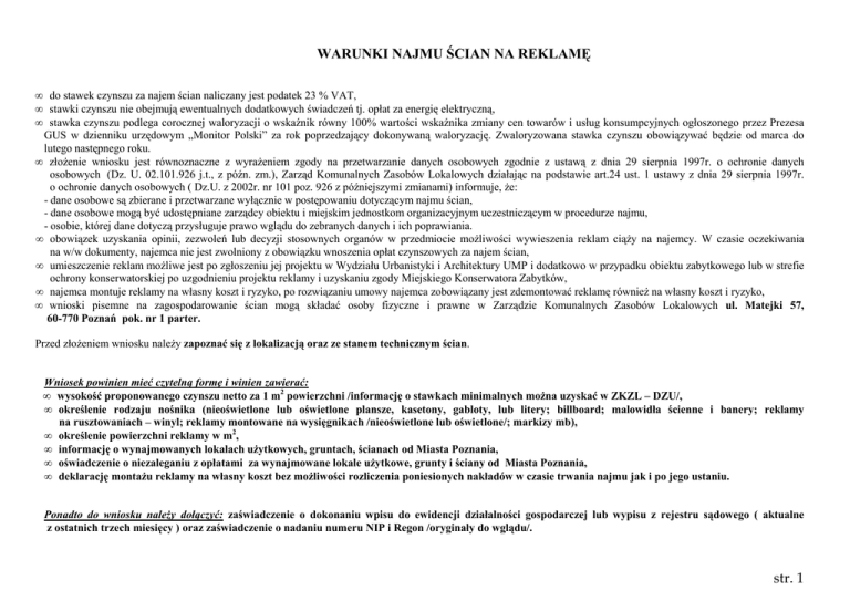 WARUNKI NAJMU ŚCIAN NA REKLAMĘ • do stawek czynszu za najem ścian naliczany jest podatek 23 % VAT, • stawki czynszu nie obejmują ewentualnych dodatkowych świadczeń tj. opłat za energię elektryczną, • stawka czynszu podlega corocznej waloryzacji o wskaźnik równy 100% wartości wskaźnika zmiany cen towarów i usług konsumpcyjnych ogłoszonego przez Prezesa GUS w dzienniku urzędowym „Monitor Polski” za rok poprzedzający dokonywaną waloryzację. Zwaloryzowana stawka czynszu obowiązywać będzie od marca do lutego następnego roku. • złoŜenie wniosku jest równoznaczne z wyraŜeniem zgody na przetwarzanie danych osobowych zgodnie z ustawą z dnia 29 sierpnia 1997r. o ochronie danych osobowych (Dz. U. 02.101.926 j.t., z późn. zm.), Zarząd Komunalnych Zasobów Lokalowych działając na podstawie art.24 ust. 1 ustawy z dnia 29 sierpnia 1997r. o ochronie danych osobowych ( Dz.U. z 2002r. nr 101 poz. 926 z późniejszymi zmianami) informuje, Ŝe: - dane osobowe są zbierane i przetwarzane wyłącznie w postępowaniu dotyczącym najmu ścian, - dane osobowe mogą być udostępniane zarządcy obiektu i miejskim jednostkom organizacyjnym uczestniczącym w procedurze najmu, - osobie, której dane dotyczą przysługuje prawo wglądu do zebranych danych i ich poprawiania. • obowiązek uzyskania opinii, zezwoleń lub decyzji stosownych organów w przedmiocie moŜliwości wywieszenia reklam ciąŜy na najemcy. W czasie oczekiwania na w/w dokumenty, najemca nie jest zwolniony z obowiązku wnoszenia opłat czynszowych za najem ścian, • umieszczenie reklam moŜliwe jest po zgłoszeniu jej projektu w Wydziału Urbanistyki i Architektury UMP i dodatkowo w przypadku obiektu zabytkowego lub w strefie ochrony konserwatorskiej po uzgodnieniu projektu reklamy i uzyskaniu zgody Miejskiego Konserwatora Zabytków, • najemca montuje reklamy na własny koszt i ryzyko, po rozwiązaniu umowy najemca zobowiązany jest zdemontować reklamę równieŜ na własny koszt i ryzyko, • wnioski pisemne na zagospodarowanie ścian mogą składać osoby fizyczne i prawne w Zarządzie Komunalnych Zasobów Lokalowych ul. Matejki 57, 60-770 Poznań pok. nr 1 parter. Przed złoŜeniem wniosku naleŜy zapoznać się z lokalizacją oraz ze stanem technicznym ścian. Wniosek powinien mieć czytelną formę i winien zawierać: • wysokość proponowanego czynszu netto za 1 m2 powierzchni /informację o stawkach minimalnych moŜna uzyskać w ZKZL – DZU/, • określenie rodzaju nośnika (nieoświetlone lub oświetlone plansze, kasetony, gabloty, lub litery; billboard; malowidła ścienne i banery; reklamy na rusztowaniach – winyl; reklamy montowane na wysięgnikach /nieoświetlone lub oświetlone/; markizy mb), • określenie powierzchni reklamy w m2, • informację o wynajmowanych lokalach uŜytkowych, gruntach, ścianach od Miasta Poznania, • oświadczenie o niezaleganiu z opłatami za wynajmowane lokale uŜytkowe, grunty i ściany od Miasta Poznania, • deklarację montaŜu reklamy na własny koszt bez moŜliwości rozliczenia poniesionych nakładów w czasie trwania najmu jak i po jego ustaniu. Ponadto do wniosku naleŜy dołączyć: zaświadczenie o dokonaniu wpisu do ewidencji działalności gospodarczej lub wypisu z rejestru sądowego ( aktualne z ostatnich trzech miesięcy ) oraz zaświadczenie o nadaniu numeru NIP i Regon /oryginały do wglądu/. str. 1 Warunkiem zawarcia umowy najmu jest : 1. przedłoŜenie u zarządcy /właściwego do miejsca połoŜenia ściany/ oświadczenia o nieistnieniu okoliczności mogących spowodować egzekucję z majątku osoby ubiegającej się o zawarcie umowy najmu, w tym równieŜ, Ŝe osoba ta nie posiada zaległości z tytułu zobowiązań publicznoprawnych; 2. wpłacenie na rachunek bankowy wynajmującego kaucji o wartości trzymiesięcznego czynszu brutto wraz z opłatami za korzystanie z przedmiotu najmu uzyskiwanymi za pośrednictwem wynajmującego. Kaucja podlega zwrotowi w ciągu miesiąca od dnia opróŜnienia przedmiotu najmu przez najemcę, po potrąceniu naleŜności wynajmującego z tytułu najmu. Kaucja podlega corocznej waloryzacji o wskaźnik równy 100 % wartości wskaźnika zmiany cen towarów i usług konsumpcyjnych, ogłoszonego przez Prezesa Głównego Urzędu Statystycznego w Dzienniku Urzędowym „Monitor Polski”, za rok poprzedzający dokonywaną waloryzację. Kaucję naleŜy wpłacać na rachunek bankowy Wynajmującego ING Bank Śląski 07 1050 1520 1000 0023 4950 8511. Zarząd Komunalnych Zasobów Lokalowych działając na podstawie art. 104 ust. 3 ustawy prawo bankowe z dnia 29 sierpnia 1997r. ( tj. Dz. U. 2002, Nr 72, poz.665 z późn. zm.) art. 24 ust. 1 ustawy z dnia 9 kwietnia 2010r. o udostępnianiu informacji gospodarczych i wymianie danych gospodarczych ( Dz. U. Nr 81, poz. 530 z późn. zm.) informuje, Ŝe oferenci, których oferta zostanie wybrana składają upowaŜnienie do wystąpienia i uzyskania z InfoMonitora Biura Informacji Gospodarczej S.A. z siedzibą w Warszawie przy ul. Canaletta 4 (,,InfoMonitor”) informacji gospodarczych o zobowiązaniach, w tym stanowiących tajemnicę bankową, uzyskanych przez InfoMonitor od Związku Banków Polskich. str. 2