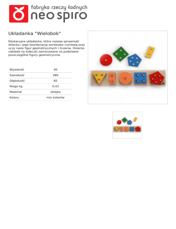Układanka "Wielobok" Edukacyjna układanka, która rozwija sprawność dziecka i jego koordynację wzrokowo–ruchową oraz uczy nazw figur geometrycznych i liczenia. Dziecko nakłada na kołeczki zamocowane na podstawie poszczególne figury geometryczne. Wysokość 40 Szerokość 380 Głębokość 85 Waga kg 0,43 Materiał sklejka Kolory Powered by TCPDF (www.tcpdf.org) mix kolorów