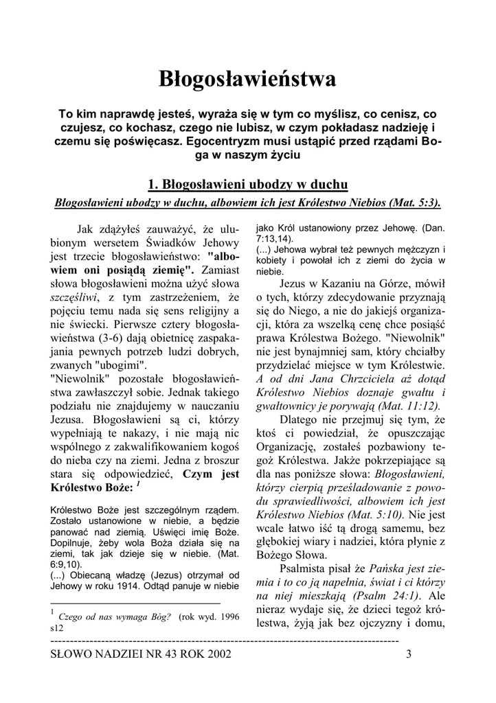 Błogosławieństwa To kim naprawdę jesteś, wyraża się w tym co myślisz, co cenisz, co czujesz, co kochasz, czego nie lubisz, w czym pokładasz nadzieję i czemu się poświęcasz. Egocentryzm musi ustąpić przed rządami Boga w naszym życiu 1. Błogosławieni ubodzy w duchu Błogosławieni ubodzy w duchu, albowiem ich jest Królestwo Niebios (Mat. 5:3). Jak zdążyłeś zauważyć, że ulubionym wersetem Świadków Jehowy jest trzecie błogosławieństwo: "albowiem oni posiądą ziemię". Zamiast słowa błogosławieni można użyć słowa szczęśliwi, z tym zastrzeżeniem, że pojęciu temu nada się sens religijny a nie świecki. Pierwsze cztery błogosławieństwa (3-6) dają obietnicę zaspakajania pewnych potrzeb ludzi dobrych, zwanych "ubogimi". "Niewolnik" pozostałe błogosławieństwa zawłaszczył sobie. Jednak takiego podziału nie znajdujemy w nauczaniu Jezusa. Błogosławieni są ci, którzy wypełniają te nakazy, i nie mają nic wspólnego z zakwalifikowaniem kogoś do nieba czy na ziemi. Jedna z broszur stara się odpowiedzieć, Czym jest Królestwo Boże: 1 jako Król ustanowiony przez Jehowę. (Dan. 7:13,14). (...) Jehowa wybrał też pewnych mężczyzn i kobiety i powołał ich z ziemi do życia w niebie. Jezus w Kazaniu na Górze, mówił o tych, którzy zdecydowanie przyznają się do Niego, a nie do jakiejś organizacji, która za wszelką cenę chce posiąść prawa Królestwa Bożego. "Niewolnik" nie jest bynajmniej sam, który chciałby przydzielać miejsce w tym Królestwie. A od dni Jana Chrzciciela aż dotąd Królestwo Niebios doznaje gwałtu i gwałtownicy je porywają (Mat. 11:12). Dlatego nie przejmuj się tym, że ktoś ci powiedział, że opuszczając Organizację, zostałeś pozbawiony tegoż Królestwa. Jakże pokrzepiające są dla nas poniższe słowa: Błogosławieni, którzy cierpią prześladowanie z powodu sprawiedliwości, albowiem ich jest Królestwo Boże jest szczególnym rządem. Królestwo Niebios (Mat. 5:10). Nie jest Zostało ustanowione w niebie, a będzie wcale łatwo iść tą drogą samemu, bez panować nad ziemią. Uświęci imię Boże. głębokiej wiary i nadziei, która płynie z Dopilnuje, żeby wola Boża działa się na ziemi, tak jak dzieje się w niebie. (Mat. Bożego Słowa. 6:9,10). Psalmista pisał że Pańska jest zie(...) Obiecaną władzę (Jezus) otrzymał od mia i to co ją napełnia, świat i ci którzy Jehowy w roku 1914. Odtąd panuje w niebie na niej mieszkają (Psalm 24:1). Ale nieraz wydaje się, że dzieci tegoż kró1 Czego od nas wymaga Bóg? (rok wyd. 1996 lestwa, żyją jak bez ojczyzny i domu, s12 ----------------------------------------------------------------------------------------SŁOWO NADZIEI NR 43 ROK 2002 3 samotni, ale nie opuszczeni. Choćby ojciec i matka mnie opuścili, Pan jednak mnie przygarnie (Psalm 27:10). Nie zapominajmy, że skarb ten jest umieszczony w kruchych naczyniach. Bóg swoje wielkie sprawy realizuje przez ręce niedoskonałych ludzi. Jak uczy nas doświadczenie, że im bardziej szlachetne naczynie, tym więcej potrzebują czyszczenia. Przydałem dla nas jest autor poniższych słów: Mamy zaś ten skarb w naczyniach glinianych, aby się okazało, że moc, która wszystko przewyższa, jest z Boga, a nie z nas. Zewsząd uciskani, nie jesteśmy jednak pognębieni, zakłopotani, ale nie zrozpaczeni. Prześladowani, ale nie opuszczeni, powaleni, ale nie pokonani. Zawsze śmierć Jezusa na ciele swoim noszący, aby i życie Jezusa na ciele naszym się ujawniło ( 2 Kor. 4:7-11). Choć skarb ten jest w kruchych naczyniach glinianych, może to wszystko przetrzymać, nie dzięki własnej sile ani pomysłowi, ale dzięki mocy Boga. I zwoławszy dwunastu, dał im moc i władzę nad wszystkimi demonami i moc uzdrawiania chorób. I posłał ich, aby głosili Królestwo Boże i uzdrawiali (Łuk. 9:1-2). Przyjdzie zapowiadany czas, o którym mówi Pismo, że z ziemi tej zostanie usunięty szatan, wraz z jego rządem, a wówczas wszystko powróci do Bożego planu. Gdy obserwujemy to, co dzieje się na świecie, wydaje się, że wszystko stoi na głowie, ale czyż nie mamy być jak te dzieci, które bezgranicznie ufają swym rodzicom w różnych chwilach swego życia? Wielki apostoł narodów pisał o sobie: Kiedy jestem słaby, wtedy jestem mocny (2 Kor. 12:10). Czy te słowa nie są zaprzeczeniem logiki? Ależ nie! Paweł wielokrotnie w swej służbie doświadczał takich sytuacji z których nie widział żadnego wyjścia. Często jednak przekonywał się, że gdy sam już nic nie jest w stanie zrobić, Bóg odpowiadał na dany problem w taki sposób i w takim czasie, że sam w najśmielszych przypuszczeniach nie byłby wstanie tego tak rozwiązać. Każdy bowiem, kto się wywyższa, będzie poniżony, a kto się poniża, będzie wywyższony (Łuk. 14:11; zobacz Mat. 18:1-6). Wy zaś nie tak, lecz kto jest największy wśród was, niech będzie jako najmniejszy, a ten, który przewodzi, niech będzie jako usługujący (Łuk.22:26). Bóg przez swoje Słowo obiecuje pełnię tym, którzy przeszli przez proces zapierania się siebie: (...) Jeśli kto pragnie, niech przyjdzie do mnie i pije. Kto wierzy we mnie, jak powiada Pismo, z wnętrza jego popłyną rzeki wody żywej. A to mówił o Duchu, którego mieli otrzymać ci, którzy w niego uwierzyli; albowiem Duch Święty nie był jeszcze dany, gdyż Jezus nie był jeszcze uwielbiony (Jan 7:37-39). Choć według reguł ludzkich, bogactwo i ubóstwo leży na przeciwnych biegunach, w myśli Bożej być ubogim w duchu to, to samo, co być dziedzicem Królestwa. Z historii Kościoła wiemy, że jedni głosili, iż materialne ubóstwo jest źródłem błogosławieństwa, inni przekonywali, że jest nim dobrobyt. Prawdą jest, że dobra materialne mogą zagłuszyć sprawy królestwa i duchowy rozwój. Pan Jezus wyraźnie mówił o ubogich w Duchu. Zgodnie z tym, co pisze apostoł ---------------------------------------------------------------