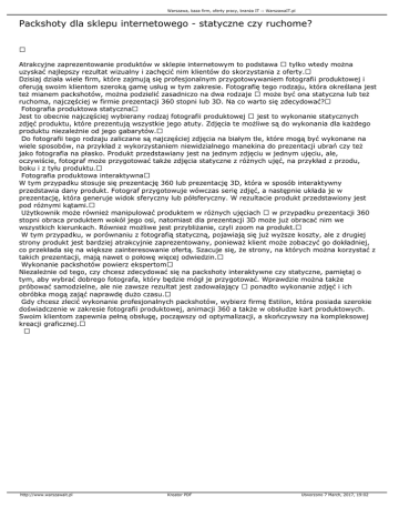 Warszawa, baza firm, oferty pracy, branża IT :: WarszawaIT.pl Packshoty dla sklepu internetowego - statyczne czy ruchome? Atrakcyjne zaprezentowanie produktów w sklepie internetowym to podstawa tylko wtedy można uzyskać najlepszy rezultat wizualny i zachęcić nim klientów do skorzystania z oferty. Dzisiaj działa wiele firm, które zajmują się profesjonalnym przygotowywaniem fotografii produktowej i oferują swoim klientom szeroką gamę usług w tym zakresie. Fotografię tego rodzaju, która określana jest też mianem packshotów, można podzielić zasadniczo na dwa rodzaje może być ona statyczna lub też ruchoma, najczęściej w firmie prezentacji 360 stopni lub 3D. Na co warto się zdecydować? Fotografia produktowa statyczna Jest to obecnie najczęściej wybierany rodzaj fotografii produktowej jest to wykonanie statycznych zdjęć produktu, które prezentują wszystkie jego atuty. Zdjęcia te możliwe są do wykonania dla każdego produktu niezależnie od jego gabarytów. Do fotografii tego rodzaju zaliczane są najczęściej zdjęcia na białym tle, które mogą być wykonane na wiele sposobów, na przykład z wykorzystaniem niewidzialnego manekina do prezentacji ubrań czy też jako fotografia na płasko. Produkt przedstawiany jest na jednym zdjęciu w jednym ujęciu, ale, oczywiście, fotograf może przygotować także zdjęcia statyczne z różnych ujęć, na przykład z przodu, boku i z tyłu produktu. Fotografia produktowa interaktywna W tym przypadku stosuje się prezentację 360 lub prezentację 3D, która w sposób interaktywny przedstawia dany produkt. Fotograf przygotowuje wówczas serię zdjęć, a następnie układa je w prezentację, która generuje widok sferyczny lub półsferyczny. W rezultacie produkt przedstawiony jest pod różnymi kątami. Użytkownik może również manipulować produktem w różnych ujęciach w przypadku prezentacji 360 stopni obraca produktem wokół jego osi, natomiast dla prezentacji 3D może już obracać nim we wszystkich kierunkach. Również możliwe jest przybliżanie, czyli zoom na produkt. W tym przypadku, w porównaniu z fotografią statyczną, pojawiają się już wyższe koszty, ale z drugiej strony produkt jest bardziej atrakcyjnie zaprezentowany, ponieważ klient może zobaczyć go dokładniej, co przekłada się na większe zainteresowanie ofertą. Szacuje się, że strony, na których można korzystać z takich prezentacji, mają nawet o połowę więcej odwiedzin. Wykonanie packshotów powierz ekspertom Niezależnie od tego, czy chcesz zdecydować się na packshoty interaktywne czy statyczne, pamiętaj o tym, aby wybrać dobrego fotografa, który będzie mógł je przygotować. Wprawdzie można także próbować samodzielne, ale nie zawsze rezultat jest zadowalający ponadto wykonanie zdjęć i ich obróbka mogą zająć naprawdę dużo czasu. Gdy chcesz zlecić wykonanie profesjonalnych packshotów, wybierz firmę Estilon, która posiada szerokie doświadczenie w zakresie fotografii produktowej, animacji 360 a także w obsłudze kart produktowych. Swoim klientom zapewnia pełną obsługę, począwszy od optymalizacji, a skończywszy na kompleksowej kreacji graficznej. http://www.warszawait.pl Kreator PDF Utworzono 7 March, 2017, 19:02