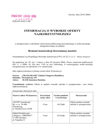 Krosno, dnia 28.03.2008r. PZD-DT-0342/11/08 INFORMACJA O WYBORZE OFERTY NAJKORZYSTNIEJSZEJ w postępowaniu o udzielenie zamówienia publicznego prowadzonego w trybie przetargu nieograniczonego na zadanie: Remont konstrukcji drewnianej mostów Nomenklatura wg Wspólnego Słownika Zamówień (CPV): 45.22.11.11-3 – Mosty drogowe. Na podstawie art. 92. ust. 1 ustawy z dnia 29 stycznia 2004r. Prawo zamówień publicznych (Dz. U. z 2006r. Nr 164, poz. 1163 ze zm.) informuję, iŜ rozstrzygnięty został przetarg nieograniczony na udzielenie w/w zamówienia. Jako najkorzystniejsza wybrana został oferta Wykonawcy: Nazwa: „TRANS-HAND” Zakład Usługowo-Handlowy Siedziba: Orzechówka 197 Adres: 36-220 Jasienica Rosielna Uzasadnienie wyboru: Oferta ta spełnia warunki udziału w postępowaniu i jest ofertą najkorzystniejszą. Zestawienie złoŜonych ofert: Nazwa i adres Wykonawcy „INTOP Tarnobrzeg” Sp. z o.o. 39-400 Tarnobrzeg, ul. Sienkiewicza 145M Zakład Produkcyjno – Usługowy „DROMET” 37-500 Jarosław, ul. Pogodna 21 Kryterium oceny ofert Liczba punktów w kryterium Cena 44,53pkt Oferta spełnia warunki udziału w postępowaniu 82,41pkt Oferta spełnia warunki udziału w postępowaniu Cena Streszczenie „TRANS-HAND” Zakład Usługowo-Handlowy, Orzechówka 197, 36-220 Jasienica Rosielna PASADYN Zakład Usługowo-Handlowy, Marcin Pasadyn, 33-114 Rzuchowa 247 Zakład Usług Wiertniczych, Lublica 93 k/Jasła, 38-214 Bieździedza Cena 100pkt Oferta spełnia warunki udziału w postępowaniu i jest ofertą najkorzystniejszą. Cena 69,99pkt Oferta spełnia warunki udziału w postępowaniu Cena 81,39pkt Oferta spełnia warunki udziału w postępowaniu Na podstawie art. 27, ust. 2 ustawy Prawo zamówień publicznych proszę wszystkich Wykonawców o niezwłoczne potwierdzenie otrzymania wezwania poprzez odesłanie faksem niniejszego pisma z adnotacją „otrzymałem” i czytelnym podpisem osoby odbierającej. ............................................... (podpis i pieczątka kierownika zamawiającego lub osoby upowaŜnionej) Otrzymują: 1. „INTOP Tarnobrzeg” , Sp. z o.o. 39-400 Tarnobrzeg, ul. Sienkiewicza 145M 2. Zakład Produkcyjno – Usługowy „DROMET” , 37-500 Jarosław, ul. Pogodna 21 3. „TRANS-HAND” Zakład Usługowo-Handlowy, Orzechówka 197, 36-220 Jasienica Rosielna 4. PASADYN Zakład Usługowo-Handlowy, Marcin Pasadyn, 33-114 Rzuchowa 247 5. Zakład Usług Wiertniczych, Lublica 93 k/Jasła, 38-214 Bieździedza 6. A/a