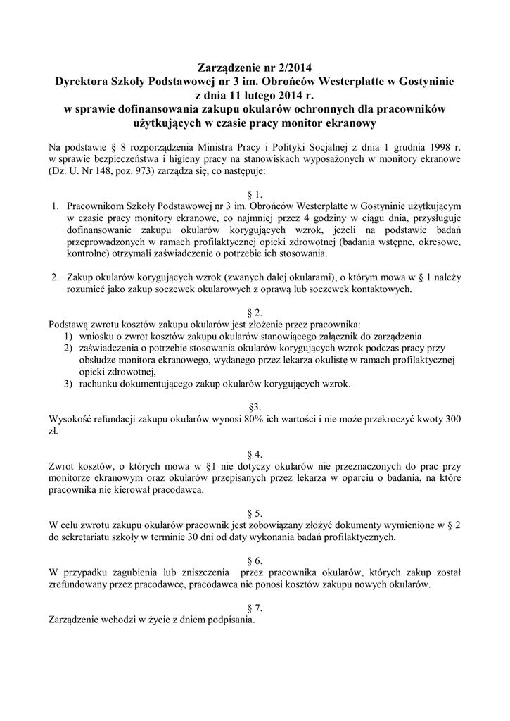 Zarządzenie nr 2/2014 Dyrektora Szkoły Podstawowej nr 3 im. Obrońców Westerplatte w Gostyninie z dnia 11 lutego 2014 r. w sprawie dofinansowania zakupu okularów ochronnych dla pracowników użytkujących w czasie pracy monitor ekranowy Na podstawie § 8 rozporządzenia Ministra Pracy i Polityki Socjalnej z dnia 1 grudnia 1998 r. w sprawie bezpieczeństwa i higieny pracy na stanowiskach wyposażonych w monitory ekranowe (Dz. U. Nr 148, poz. 973) zarządza się, co następuje: § 1. 1. Pracownikom Szkoły Podstawowej nr 3 im. Obrońców Westerplatte w Gostyninie użytkującym w czasie pracy monitory ekranowe, co najmniej przez 4 godziny w ciągu dnia, przysługuje dofinansowanie zakupu okularów korygujących wzrok, jeżeli na podstawie badań przeprowadzonych w ramach profilaktycznej opieki zdrowotnej (badania wstępne, okresowe, kontrolne) otrzymali zaświadczenie o potrzebie ich stosowania. 2. Zakup okularów korygujących wzrok (zwanych dalej okularami), o którym mowa w § 1 należy rozumieć jako zakup soczewek okularowych z oprawą lub soczewek kontaktowych. § 2. Podstawą zwrotu kosztów zakupu okularów jest złożenie przez pracownika: 1) wniosku o zwrot kosztów zakupu okularów stanowiącego załącznik do zarządzenia 2) zaświadczenia o potrzebie stosowania okularów korygujących wzrok podczas pracy przy obsłudze monitora ekranowego, wydanego przez lekarza okulistę w ramach profilaktycznej opieki zdrowotnej, 3) rachunku dokumentującego zakup okularów korygujących wzrok. §3. Wysokość refundacji zakupu okularów wynosi 80% ich wartości i nie może przekroczyć kwoty 300 zł. § 4. Zwrot kosztów, o których mowa w §1 nie dotyczy okularów nie przeznaczonych do prac przy monitorze ekranowym oraz okularów przepisanych przez lekarza w oparciu o badania, na które pracownika nie kierował pracodawca. § 5. W celu zwrotu zakupu okularów pracownik jest zobowiązany złożyć dokumenty wymienione w § 2 do sekretariatu szkoły w terminie 30 dni od daty wykonania badań profilaktycznych. § 6. W przypadku zagubienia lub zniszczenia przez pracownika okularów, których zakup został zrefundowany przez pracodawcę, pracodawca nie ponosi kosztów zakupu nowych okularów. § 7. Zarządzenie wchodzi w życie z dniem podpisania. WNIOSEK O ZWROT KOSZTÓW ZAKUPU OKULARÓW KORYGUJĄCYCH WZROK Na podstawie par. 8 ust. 2 rozporządzenia Ministra Pracy i Polityki Socjalnej z dnia 1 grudnia 1998 r. w sprawie bezpieczeństwa i higieny pracy na stanowiskach wyposażonych w monitory ekranowe (Dz. U. Nr 148, poz. 973) oraz Zarządzenia nr 2/2014 Dyrektora Szkoły Podstawowej nr 3 w Gostyninie z dnia 7 lutego 2014 r. w sprawie dofinansowania zakupu okularów ochronnych dla pracowników użytkujących w czasie pracy monitor ekranowy, proszę o zwrot kosztów zakupu okularów korygujących wzrok/ soczewek kontaktowych*) do pracy przy obsłudze monitora ekranowego. Oświadczam, że okulary/ soczewki*) zostały zakupione w oparciu o zalecenia lekarza medycyny pracy w ramach badań profilaktycznych. Do wniosku załączam: 1. rachunek z dnia ……………………. potwierdzający zakup okularów korygujących wzrok; 2. aktualne zaświadczenia wydane przez lekarza okulistę w ramach profilaktycznej opieki zdrowotnej zlecające stosowanie okularów korygujących wzrok podczas pracy przy obsłudze monitora ekranowego. (data, imię i nazwisko – podpis) *) niepotrzebne skreślić