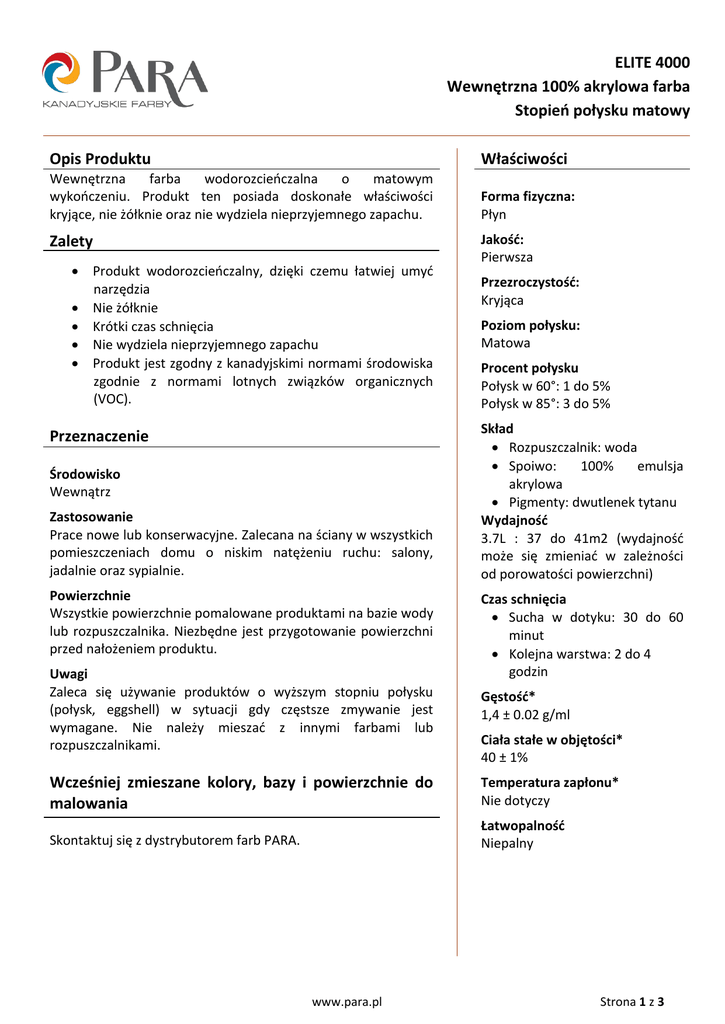 ELITE 4000 Wewnętrzna 100% akrylowa farba Stopień połysku matowy Opis Produktu Właściwości Wewnętrzna farba wodorozcieńczalna o matowym wykończeniu. Produkt ten posiada doskonałe właściwości kryjące, nie żółknie oraz nie wydziela nieprzyjemnego zapachu. Forma fizyczna: Płyn Zalety Produkt wodorozcieńczalny, dzięki czemu łatwiej umyć narzędzia Nie żółknie Krótki czas schnięcia Nie wydziela nieprzyjemnego zapachu Produkt jest zgodny z kanadyjskimi normami środowiska zgodnie z normami lotnych związków organicznych (VOC). Przeznaczenie Środowisko Wewnątrz Zastosowanie Prace nowe lub konserwacyjne. Zalecana na ściany w wszystkich pomieszczeniach domu o niskim natężeniu ruchu: salony, jadalnie oraz sypialnie. Powierzchnie Wszystkie powierzchnie pomalowane produktami na bazie wody lub rozpuszczalnika. Niezbędne jest przygotowanie powierzchni przed nałożeniem produktu. Uwagi Zaleca się używanie produktów o wyższym stopniu połysku (połysk, eggshell) w sytuacji gdy częstsze zmywanie jest wymagane. Nie należy mieszać z innymi farbami lub rozpuszczalnikami. Jakość: Pierwsza Przezroczystość: Kryjąca Poziom połysku: Matowa Procent połysku Połysk w 60°: 1 do 5% Połysk w 85°: 3 do 5% Skład Rozpuszczalnik: woda Spoiwo: 100% emulsja akrylowa Pigmenty: dwutlenek tytanu Wydajność 3.7L : 37 do 41m2 (wydajność może się zmieniać w zależności od porowatości powierzchni) Czas schnięcia Sucha w dotyku: 30 do 60 minut Kolejna warstwa: 2 do 4 godzin Gęstość* 1,4 ± 0.02 g/ml Ciała stałe w objętości* 40 ± 1% Wcześniej zmieszane kolory, bazy i powierzchnie do malowania Temperatura zapłonu* Nie dotyczy Skontaktuj się z dystrybutorem farb PARA. Łatwopalność Niepalny www.para.pl Strona 1 z 3 Przygotowanie powierzchni Zalecenia Przygotowanie powierzchni jest bardzo ważne. Większość problemów przypisywanych powłokom jest spowodowanych niewłaściwym przygotowaniem powierzchni. Powierzchnie muszą być czyste, twarde, nie zawierać kurzu, brudu, oleju, sadzy, wosku, pleśni, kredy, patyny, nie mogą się łuszczyć, itd. Aby odpowiednio przygotować powierzchnię, postępuj zgodnie z poniższymi krokami: Warunki dotyczące aplikacji Optymalna temperatura 15°C do 25 °C (60°F do 77°F). Wilgotność względna: Optymalnie 30 do 50%. Do stosowania wewnątrz należy zapewnić odpowiednią wentylację. Unikaj przeciągów. Narzędzia Pędzel: włosie nylonowopoliestrowe Wałek (np. Dynamic HB02206) : 10 - 13 mm Pistolet natryskowy wskazówka: 0,017 - 0,019 cm Wyczyść powierzchnię odpowiednim produktem. Aby usunąć pleśń, przemyj roztworem z wybielacza domowego (1 część wybielacza na 3 części wody). Jeśli drewno wydzieli żywicę, zdrap jej nadmiar i wyczyść powierzchnię alkoholem, lub rozcieńczalnikiem do farb. Oderwij lub zdrap luźne fragmenty farby. Przetrzyj powierzchnie papierem ściernym o grubości 100180. Odkurz resztki pozostałe po ścieraniu. (Środki bezpieczeństwa: czynności takie, jak ścieranie papierem ściernym na sucho, lub palenie warstwy farby mogą wytworzyć pył i szkodliwe opary. Jeżeli to możliwe, zastosuj ścieranie papierem ściernym na mokro. Jeżeli nie można uniknąć narażenia za pomocą lokalnej wentylacji, należy mieć na twarzy maskę). Wypełnij dziury i pęknięcia masą wypełniającą odpowiednią do naprawianej powierzchni. Niektóre wypełniacze, takie jak cement, nie są odpowiednie do wcześniej malowanych powierzchni, ponieważ mogą wpłynąć na przyleganie powłoki i spowodować powstawanie pęcherzy. Na gołym drewnie, wypełnij sęki szpachlą do drewna. Nałóż właściwą farbę do gruntowania na powierzchnię, którą chcesz pomalować. Używanie farby do gruntowania i produktów wykańczających tego samego producenta zapewni lepszą przyczepność. Przed nałożeniem farby do gruntowania, zakryj, lub zasłoń powierzchnie, których nie chcesz malować. Skontaktuj się ze swoim dystrybutorem, aby uzyskać dodatkowe informacje. Poniżej podane są zalecane produkty do gruntowania: - Płyta gipsowo-kartonowa (suchy tynk), nowe i wyschnięte tynki: Para Primer 799 podkład wodorozcieńczalny. - Surowe drewno: farba wodna do gruntowania Para Ultra 777 lub farba rozpuszczalnikowa do gruntowania Para 151. - cedr i sekwoja: farba rozpuszczalnikowa Para 151. - Płyty MDF i materiały kompozytowe: farba alkidowa 151. - Mur, cegła lub beton: farba wodna Para Ultra 750 - Powierzchnie porowate takie, jak pustaki betonowe: Para Latex Block Filler 5792 lub 3498 - suche tynki: farba rozpuszczalnikowa Para 151. - Podkład nie jest wymagany na powierzchniach w dobrej kondycji malowanych farbą lateksową. Aplikacja To jest produkt gotowy do użycia i nie powinien być www.para.pl Czyszczenie narzędzi Należy czyścić narzędzia i ręce letnią wodą i mydłem. Może być konieczne opłukanie ich substancją do zmywania plam. Konserwacja powierzchni Pozostaw na 30 dni przed myciem, użyj do mycia nieżrącego środka czyszczącego i miękkiej szmatki. Przechowywanie i transport Należy przechowywać produkt w chłodnym, suchym i dobrze przewietrzonym miejscu. Należy unikać temperatur minusowych. Czas zachowania właściwości roboczych produktu wynosi około 5 lat. Utylizacja Skontaktuj się z władzami miejskimi w celu utylizacji resztek produktu. Środki bezpieczeństwa Zob. kartę charakterystyki produktu, aby uzyskać pełne informacje bezpieczeństwa. Produkt może podrażnić oczy. Należy unikać kontaktu z oczami. Należy trzymać poza zasięgiem dzieci. Należy zapewnić dobrą wentylację. Strona 2 z 3 rozcieńczany. Dokładnie wymieszaj produkt przed i podczas aplikacji. Umyj narzędzia wodą przed użyciem. Nakładaj obficie nie pozostawiając pustych miejsc ani nadmiaru farby. Zachowaj odpowiednie tempo rozprzestrzeniania się produktu. Malując, wyznacz obszar około 60 x 120 cm za pomocą wałka poprzez narysowanie „W”. Bez odrywania wałka od powierzchni,