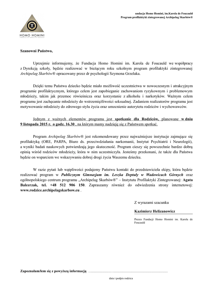 undacja Homo Homini, im.Karola de Foucauld Program profilaktyki zintegrowanej Archipelag Skarbów® Szanowni Państwo, Uprzejmie informujemy, że Fundacja Homo Homini im. Karola de Foucauld we współpracy z Dyrekcją szkoły, będzie realizować w bieżącym roku szkolnym program profilaktyki zintegrowanej Archipelag Skarbów® opracowany przez dr psychologii Szymona Grzelaka. Dzięki temu Państwa dziecko będzie miało możliwość uczestnictwa w nowoczesnym i atrakcyjnym programie profilaktycznym, którego celem jest zapobieganie zachowaniom ryzykownym i problemowym młodzieży, takim jak przemoc rówieśnicza oraz korzystanie z alkoholu i narkotyków. Ważnym celem programu jest zachęcanie młodzieży do wstrzemięźliwości seksualnej. Zadaniem realizatorów programu jest motywowanie młodzieży do zdrowego stylu życia oraz umocnienie autorytetu rodziców i wychowawców. Jednym z ważnych elementów programu jest spotkanie dla Rodziców, planowane w dniu 9 listopada 2015 r. o godz. 16.30 , na którym mamy nadzieję się z Państwem spotkać. Program Archipelag Skarbów® jest rekomendowany przez najważniejsze instytucje zajmujące się profilaktyką (ORE, PARPA, Biuro ds. przeciwdziałania narkomanii, Instytut Psychiatrii i Neurologii), a wyniki badań naukowych potwierdzają jego skuteczność. Program cieszy się powszechnie bardzo dobrą opinią wśród rodziców młodzieży, która w nim uczestniczyła. Jesteśmy przekonani, że także dla Państwa będzie on wsparciem we wskazywaniu dobrej drogi życia Waszemu dziecku. W razie pytań lub wątpliwości podajemy Państwu kontakt do przedstawiciela ekipy, która będzie realizować program w Publicznym Gimnazjum im. Leszka Deptuły w Wadowicach Górnych oraz ogólnopolskiego centrum programu „Archipelag Skarbów®” – Instytutu Profilaktyki Zintegrowanej: Agata Balcerzak, tel. +48 512 906 150. Zapraszamy również do odwiedzenia strony internetowej: www.rodzice.archipelagskarbow.eu . Z wyrazami szacunku Kazimierz Helizanowicz Prezes Fundacji Homo Homini im. Karola de Foucauld Zapoznałam/łem się z powyższą informacją …...........................…............................................................................ data i podpis rodzica