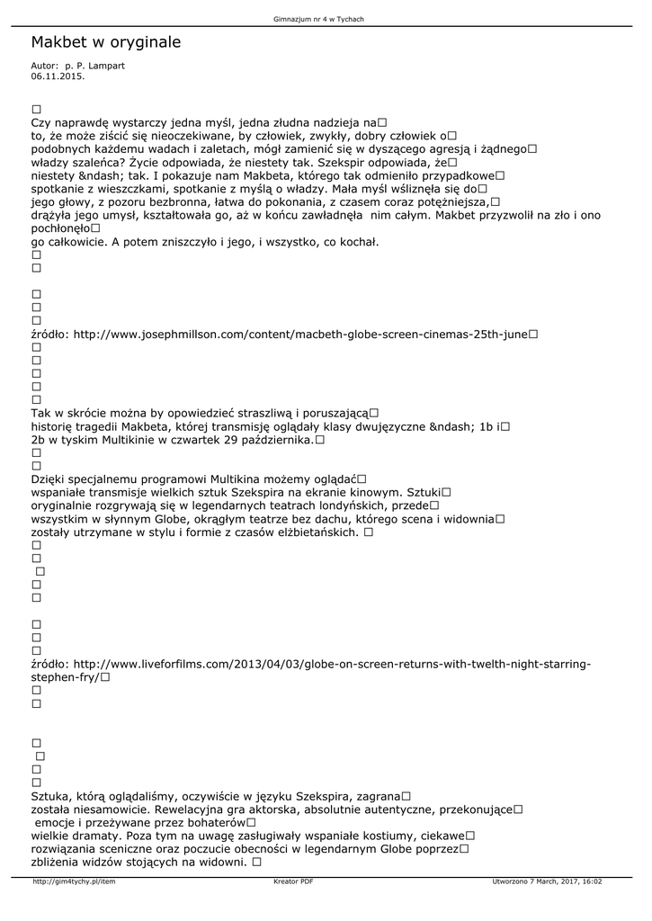 Gimnazjum nr 4 w Tychach Makbet w oryginale Autor: p. P. Lampart 06.11.2015. Czy naprawdę wystarczy jedna myśl, jedna złudna nadzieja na to, że może ziścić się nieoczekiwane, by człowiek, zwykły, dobry człowiek o podobnych każdemu wadach i zaletach, mógł zamienić się w dyszącego agresją i żądnego władzy szaleńca? Życie odpowiada, że niestety tak. Szekspir odpowiada, że niestety – tak. I pokazuje nam Makbeta, którego tak odmieniło przypadkowe spotkanie z wieszczkami, spotkanie z myślą o władzy. Mała myśl wśliznęła się do jego głowy, z pozoru bezbronna, łatwa do pokonania, z czasem coraz potężniejsza, drążyła jego umysł, kształtowała go, aż w końcu zawładnęła nim całym. Makbet przyzwolił na zło i ono pochłonęło go całkowicie. A potem zniszczyło i jego, i wszystko, co kochał. źródło: http://www.josephmillson.com/content/macbeth-globe-screen-cinemas-25th-june Tak w skrócie można by opowiedzieć straszliwą i poruszającą historię tragedii Makbeta, której transmisję oglądały klasy dwujęzyczne – 1b i 2b w tyskim Multikinie w czwartek 29 października. Dzięki specjalnemu programowi Multikina możemy oglądać wspaniałe transmisje wielkich sztuk Szekspira na ekranie kinowym. Sztuki oryginalnie rozgrywają się w legendarnych teatrach londyńskich, przede wszystkim w słynnym Globe, okrągłym teatrze bez dachu, którego scena i widownia zostały utrzymane w stylu i formie z czasów elżbietańskich. źródło: http://www.liveforfilms.com/2013/04/03/globe-on-screen-returns-with-twelth-night-starringstephen-fry/ Sztuka, którą oglądaliśmy, oczywiście w języku Szekspira, zagrana została niesamowicie. Rewelacyjna gra aktorska, absolutnie autentyczne, przekonujące emocje i przeżywane przez bohaterów wielkie dramaty. Poza tym na uwagę zasługiwały wspaniałe kostiumy, ciekawe rozwiązania sceniczne oraz poczucie obecności w legendarnym Globe poprzez zbliżenia widzów stojących na widowni. http://gim4tychy.pl/item Kreator PDF Utworzono 7 March, 2017, 16:02 Gimnazjum nr 4 w Tychach źródło: http://www.josephmillson.com/content/macbeth-globe-casting-updates Każdy z nas wyszedł z przedstawienia z własnymi przemyśleniami, nie sposób ich przedstawić w tej krótkiej relacji, można jednak z całą pewnością powiedzieć, że trudno oprzeć się refleksji wobec tak sugestywnej historii przekazanej nam tak autentycznie. źródło: http://www.officiallondontheatre.co.uk/news/latest-news/article/item171534/spiro-announced-asmillsons-lady/ http://gim4tychy.pl/item Kreator PDF Utworzono 7 March, 2017, 16:02