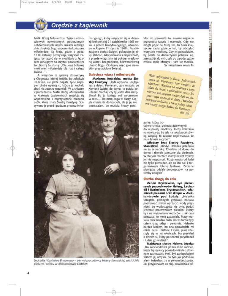 faustyna kowalska 8/2/02 20:01 Page 4 Or´dzie z ¸agiewnik Matki Bo˝ej Mi∏osierdzia. Tysiàce uzdrowionych, nawróconych, pocieszonych i obdarowanych innymi ∏askami ka˝dego dnia dzi´kuje Bogu za jego nieskoƒczone mi∏osierdzie. Sà kraje, gdzie o godz. 15.00 katolicy przerywajà wszystkie zaj´cia, by ∏aczyç si´ w modlitwie z Jezusem konajàcym na krzy˝u i powtarzaç za Êw. Siostrà Faustynà: „Dla Jego bolesnej m´ki miej mi∏osierdzie dla nas i ca∏ego Êwiata...”. A wszystko za sprawà dziewczyny z G∏ogowca, której krótkie, bo zaledwie 33-letnie, ale jak˝e bogate ˝ycie najlepiej chyba opisujà ci, którzy jà kochali, choç nie zawsze rozumieli. W archiwum Zgromadzenia Matki Bo˝ej Mi∏osierdzia w Krakowie ¸agiewnikach znajdujà si´ wspomnienia i zaprzysi´˝one zeznania osób, które zna∏y Siostr´ Faustyn´. Spisywano je przed i podczas procesu infor- macyjnego, który rozpoczà∏ si´ w diecezji krakowskiej 21 paêdziernika 1965 roku, a potem beatyfikacyjnego, otwartego w Rzymie 31 stycznia 1968 r. Przybli˝ajà one postaç Âwi´tej, pokazujàc jej si∏´ i s∏aboÊci, zdecydowanie i niepewnoÊç, a przede wszystkim jej pokor´, niez∏omnà wiar´ i bezgranicznà, bezwarunkowà ufnoÊç Bogu. Oddajmy wi´c g∏os ziemskim przyjacio∏om Âwi´tej. Dzieci´ca wiara i mi∏osierdzie Marianna Kowalska, matka Siostry Faustyny: „By∏a wybrana i najlepsza z dzieci. Pami´tam, gdy wraca∏a po Komunii Êwi´tej do domu, to pyta∏a kole˝anki: S∏uchaj, czy ty jesteÊ dziÊ szcz´Êliwa? Bo ja takiego coÊ wyczuwam w sercu..., bo mam Boga w duszy. Ciàgle chcia∏a iÊç do koÊcio∏a, ale ja jej nie pozwala∏am, bo musia∏a krowy paÊç. Idàc do spowiedzi Êw. zawsze najpierw przeprosi∏a tatusia i mamusi´. Gdy nie mog∏a pójÊç na Msz´ Êw., to bra∏a ksià˝eczk´ i sz∏a gdzie w kàt, by odczytaç wszystkie modlitwy. Gdy jej pozwala∏am, by posz∏a do dziewczynek pobawiç si´, zamiast iÊç do nich, sz∏a do ogrodu, gdzie zrobi∏a sobie o∏tarzyk i tam si´ modli∏a. W mieszkaniu mia∏a fi- Wtem us∏y sza∏am te s∏owa: „Jed miast do ê naty Wa klasztoru”. rszawy, tam wstàp chisz do Wst sz∏am do d a∏am od modlitwy i om przynieczne. Ja u, i za∏atwi∏am rzec k mog∏am, zy kozwierzy∏am strze z tego si´ sio, co po˝egnaç ro zasz∏o w duszy, i ka z a∏am dziców, i ta k w jednej bez niczeg o przyjecha sukni, ∏am do Wa rszawy... (Dz. 10) gurk´, którà troskliwie stroi∏a i zbiera∏a dziewczynki do wspólnej modlitwy. Kiedy kole˝anki namawia∏y jà, by sz∏a na jakàÊ potaƒcówk´ wiejskà, to zawsze odpowiada∏a, ˝e musi tatusia zapytaç”. M∏odszy brat Siostry Faustyny, Stanis∏aw: „KiedyÊ Helenka przebra∏a si´ za ˝ebraczk´. Chodzi∏a od domu do domu i zbiera∏a ja∏mu˝n´ dla biednych. W starych rzeczach mamy nawet myÊmy jej nie rozpoznali. Przyjmowa∏a od ludzi nie tylko pieniàdze, ale co kto da∏, i zorganizowa∏a loteri´ fantowà. Zebrane pieniàdze odda∏a proboszczowi na potrzeby ubogich”. S∏u˝ba drogà do celu Leokadia i Kazimierz Bryszewscy – pierwsi pracodawcy Heleny Kowalskiej, w∏aÊciciele piekarni i sklepu w Aleksandrowie ¸ódzkim 4 Zenon Bryszewski, syn pierwszych pracodawców Heleny, Leokadii i Kazimierza Bryszewskich, w∏aÊcicieli piekarni oraz sklepu w Aleksandrowie pod ¸odzià: „Helenka sprzàta∏a, pomaga∏a gotowaç, musia∏a pozmywaç, Êmieci wyrzuciç, wody przynieÊç, bo wodociàgów nie by∏o, podaç jedzenie pracownikom piekarni, którzy byli na wy˝ywieniu rodziców i jak czas pozwala∏, to mnie zabawia∏a. Pracy musia∏a mieç bardzo du˝o, bo w domu by∏y cztery izby, sklep i piekarnia. Helenk´ bardzo lubi∏em, bo ona opowiada∏a mi ró˝ne bajki i historie z ˝ycia, jakie zdarzy∏y si´ w jej okolicach. Na przyk∏ad o dziedzicu, który po Êmierci przychodzi∏ i ludzie go widzieli”. Najstarsza siostra Heleny, Józefa: „Do Aleksandrowa pos∏ali mnie rodzice, kiedy Bryszewscy powiadomili ich o dziwnym zachowaniu Heli. Byli zaniepokojeni stanem jej umys∏u, po tym jak podnios∏a alarm twierdzàc, ˝e w piekarni jest po˝ar. Jak przyjecha∏am do niej, powiedzia∏a tyl-