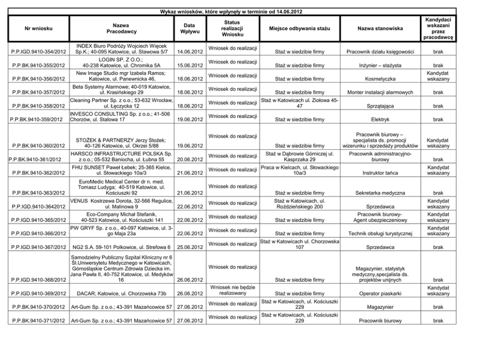 Wykaz wniosków, które wpłynęły w terminie od 14.06.2012 Nazwa Pracodawcy Data Wpływu P.P.IGD.9410-354/2012 INDEX Biuro Podróży Wojciech Więcek Sp.K.; 40-095 Katowice, ul. Stawowa 5/7 14.06.2012 P.P.BK.9410-355/2012 LOGIN SP. Z O.O.; 40-238 Katowice, ul. Chromika 5A 15.06.2012 P.P.BK.9410-356/2012 New Image Studio mgr Izabela Ramos; Katowice, ul. Panewnicka 46, 18.06.2012 P.P.BK.9410-357/2012 Beta Systemy Alarmowe; 40-019 Katowice, ul. Krasińskiego 29 18.06.2012 Nr wniosku P.P.BK.9410-358/2012 P.P.BK.9410-359/2012 P.P.BK.9410-360/2012 Status realizacji Wniosku Wniosek do realizacji Wniosek do realizacji Wniosek do realizacji Wniosek do realizacji Miejsce odbywania stażu Nazwa stanowiska Kandydaci wskazani przez pracodawcę Staż w siedzibie firmy Pracownik działu księgowości brak Staż w siedzibie firmy Inżynier – stażysta brak Staż w siedzibie firmy Kosmetyczka Kandydat wskazany Staż w siedzibie firmy Monter instalacji alarmowych brak Sprzątająca brak Staż w siedzibie firmy Elektryk brak Staż w siedzibie firmy Pracownik biurowy – specjalista ds. promocji wizerunku i sprzedaży produktów Kandydat wskazany Staż w Dąbrowie Górniczej ul. Kasprzaka 29 Pracownik administracyjnobiurowy brak Instruktor tańca Kandydat wskazany Cleaning Partner Sp. z o.o.; 53-632 Wrocław, ul. Łęczycka 12 18.06.2012 Wniosek do realizacji Staż w Katowicach ul. Ziołowa 4547 INVESCO CONSULTING Sp. z o.o.; 41-506 Chorzów, ul. Stalowa 17 Wniosek do realizacji STOŻEK & PARTNERZY Jerzy Stożek; 40-126 Katowice, ul. Okrzei 5/88 19.06.2012 Wniosek do realizacji 19.06.2012 HARSCO INFRASTRUCTURE POLSKA Sp. z o.o.; 05-532 Baniocha, ul. Łubna 55 20.06.2012 Wniosek do realizacji P.P.BK.9410-362/2012 FHU SUNSET Paweł Łebek; 25-365 Kielce, ul. Słowackiego 10a/3 21.06.2012 Wniosek do realizacji Praca w Kielcach, ul. Słowackiego 10a/3 P.P.BK.9410-363/2012 EuroMedic Medical Center dr n. med. Tomasz Ludyga; 40-519 Katowice, ul. Kościuszki 92 21.06.2012 Staż w siedzibie firmy Sekretarka medyczna brak VENUS Kostrzewa Dorota, 32-566 Regulice, P.P.IGD.9410-3642012 ul. Malinowa 9 22.06.2012 Staż w Katowicach, ul. Roździeńskiego 200 Sprzedawca Kandydat wskazany Staż w siedzibie firmy Pracownik biurowyAgent ubezpieczeniowy Kandydat wskazany Staż w siedzibie firmy Technik obsługi turystycznej Kandydat wskazany Sprzedawca brak P.P.BK.9410-361/2012 P.P.IGD.9410-365/2012 P.P.IGD.9410-366/2012 P.P.IGD.9410-367/2012 Eco-Company Michał Stefanik, 40-523 Katowice, ul. Kościuszki 141 Wniosek do realizacji 22.06.2012 PW GRYF Sp. z o.o., 40-097 Katowice, ul. 3go Maja 23a 22.06.2012 NG2 S.A. 59-101 Polkowice, ul. Strefowa 6 25.06.2012 Samodzielny Publiczny Szpital Kliniczny nr 6 Śl.Uniwersytetu Medycznego w Katowicach, Górnośląskie Centrum Zdrowia Dziecka im. Jana Pawła II, 40-752 Katowice, ul. Medyków P.P.IGD.9410-368/2012 16 26.06.2012 P.P.IGD.9410-369/2012 P.P.BK.9410-370/2012 P.P.BK.9410-371/2012 DACAR; Katowice, ul. Chorzowska 73b Art-Gum Sp. z o.o.; 43-391 Mazańcowice 57 Art-Gum Sp. z o.o.; 43-391 Mazańcowice 57 Wniosek do realizacji Wniosek do realizacji Wniosek do realizacji Wniosek do realizacji Staż w Katowicach ul. Chorzowska 107 Wniosek do realizacji Staż w siedzibie firmy Wniosek nie będzie realizowany Magazynier, statystyk medyczny,specjalista ds. projektów unijnych brak Operator piaskarki Kandydat wskazany 27.06.2012 Wniosek do realizacji Staż w Katowicach, ul. Kościuszki 229 Magazynier brak 27.06.2012 Wniosek do realizacji Staż w Katowicach, ul. Kościuszki 229 Pracownik biurowy brak 26.06.2012 Staż w siedzibie firmy P.P.BK.9410-372/2012 Deltex Sp. z o.o.; 40-541 Katowice, ul. Rzepakowa 1A 27.06.2012 P.P.BK.9410-373/2012 Dentim Clinic Wojciech Fąferko; 40-084 Katowice, ul. Opolska 7/3 28.06.2012 P.P.BK.9410-374/2012 Rodsilver925 Andrzej Wieczorek; 40-173 Katowice, ul. Katowicka 37A/9 28.06.2012 P.P.BK.9410-375/2012 Salutaris Sp. z o.o.; 40-273 Katowice, ul. Pułaskiego 9 29.06.2012 P.P.BK.9410-378/2012 P.H.U.P. PANORAMA S.C.; ul. Wietnamska 61 F, 40-765 Katowice Star-Typ Sport Zakłady Wzajemne Sp. z o.o.; ul. Porcelanowa 8, 40-246 Katowice F.H.U. OLIWIA Barbara Słowińska; ul. Obr. Westerplatte 18, 40-336 Katowice P.P.BK.9410-379/2012 Hair Majesty Łukasz Dąbek; ul. Modrzejowska 45, 41-200 Sosnowiec 4.07.2012 P.P.BK.9410-380/2012 P.P.H.U. Silplast Sp. z o.o.; ul. M. Reja 6a, 40-224 Katowice 5.07.2012 P.P.BK.9410-381/2012 P.P.H.U. Silplast Sp. z o.o.; ul. M. Reja 6a, 40-224 Katowice 5.07.2012 P.P.BK.9410-382/2012 DOMATOR W. Kozerski i S-ka Spółka Jawna; 43-100 Tychy, ul. Skalna 161 C 5.07.2012 P.P.BK.9410-383/2012 Związek Zagłębiowski, 41-200 Sosnowiec; ul. Będzińska 65 6.07.2012 P.P.BK.9410-384/2012 Glikol.Com Tadeusz Pytko; 40-203 Katowice, al. Roździeńskiego 188 B 6.07.2012 P.P.BK.9410-385/2012 Glikol.Com Tadeusz Pytko; 40-203 Katowice, al. Roździeńskiego 188 B 6.07.2012 P.P.BK.9410-386/2012 Kancelaria Radców Prawnych KozaNessmann-Tajak-Mura Sp.P.; ul. Matejki 2, 40-077 Katowice 9.07.2012 P.P.BK.9410-387/2012 Energocenter Sp. z o.o.; ul. Sienna 7, 40-544 Katowice 9.07.2012 P.P.BK.9410-388/2012 INSEL – Marcin Żekoński; ul. Wyspiańskiego 2/14 , 87-800 Włocławek 9.07.2012 P.P.BK.9410-389/2012 For5 Jan Kulig; ul. Kresowa 4, 41-200 Sosnowiec P.P.IGD.9410-390/2012 MOTO-TECH Bogumiła Stachelek, ul. Ludwika 35 40-176 Katowice 10.07.2012 P.P.IGD.9410-391/2012 Info-Lider Spółka z o.o. ul. Gnieźnieńska 12 40-142 Katowice 10.07.2012 P.P.IGD.9410-392/2012 P.U.H.”ANIEW” Sp. J. Wojciech Anielski, Łukasz Anielski ul. Floriańska9 41-200 Sosnowiec 10.07.2012 P.P.IGD.9410-393/2012 Śląski Urząd Wojewódzki w Katowicach ul. Jagiellońska 25 40-032 Katowice 11.07.2012 P.P.BK.9410-376/2012 P.P.BK.9410-377/2012 2.07.2012 3.07.2012 4.07.2012 Wniosek do realizacji Wniosek do realizacji Wniosek do realizacji Wniosek do realizacji Wniosek do realizacji Wniosek do realizacji Wniosek do realizacji Staż w siedzibie firmy Doradca klienta brak Staż w siedzibie fo
