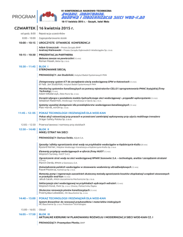 PROGRAM CZWARTEK 16 kwietnia 2015 r. od godz. 8:00 8:00 – 10:00 10:00 – 10:15 Rejestracja uczestników Zagospodarowanie stoisk UROCZYSTE OTWARCIE KONFERENCJI Adam Grzeszczuk – Prezes Zarządu BMP Andrzej Malinowski – Prezes Zarządu Dąbrowskich Wodociągów Sp. z o.o. 10:15 – 10:30 PREZENTACJA PARTNERA Belzona zawsze na powierzchni (15 min) Roman Masek, Belse Sp. z o.o. 10:30 – 11:45 BLOK I STEROWANIE SIECIĄ PROWADZĄCY: Jan Studziński, Instytut Badań Systemowych PAN Zintegrowany system ICT do zarządzania siecią wodociągową GPW w Katowicach (15 min) dr hab. Jan Studziński, Instytut Badań Systemowych PAN Monitoring systemów kanalizacyjnych za pomocą rejestratorów CELLO i oprogramowania PMAC brytyjskiej firmy Technolog (15 min) Adam Włodarczyk, Złote Runo Sp. z o.o. Korzyści płynące z posiadania modelu hydraulicznego sieci wodociągowej – przypadki wykorzystania (15 min) Sebastian Radzimski, Wodociągi i Kanalizacja w Opolu Sp. z o.o. Systemy wysokiej dostępności dla przedsiębiorstw wodociągowo-kanalizacyjnych (15 min) Piotr Hornik, ASTOR Sp. z o.o. 11:45 – 12: 05 POKAZ TECHNOLOGII I ROZWIĄZAŃ DLA WOD-KAN Pokaz akcji ratowniczej przy pracach w przestrzeni zamkniętej wykonywany przy użyciu mobilnego trenażera Dräger Safety Polska Sp. z.o.o. 12:05 – 12:50 12:50 – 14:40 Przerwa kawowa i rozmowy przy stoiskach BLOK II MNIEJ STRAT NA SIECI PROWADZĄCY: Dariusz Dzida, AQUA S.A. Sposoby i efekty ograniczania strat wody na przykładzie wodociągów w Kędzierzynie-Koźlu (20 min) Ryszard Kerner, Miejskie Wodociągi i Kanalizacja w Kędzierzynie-Koźlu Sp. z o.o. Elementy przyłączy wodociągowych w ofercie firmy HUOT (15 min) Wojciech Surowy, HUOT S.A.S. Ograniczenie strat wody na sieci wodociągowej RPWiK Sosnowiec S.A. – technologie, analiza i zarządzanie stratami (15 min) Marcin Derda, RPWiK w Sosnowcu S.A. Doświadczenia polskich wodociągów w stosowaniu wodomierzy ultradźwiękowych (15 min) Paweł Powierza, Kamstrup Sp. z o.o. Remonty pomp i regeneracja uszczelnień skuteczną metodą ograniczania kosztów eksploatacji urządzeń stosowanych w przemyśle wod-kan (15 min) Jakub Gacek, ANGA Uszczelnienia Mechaniczne Sp. z o.o. Sektoryzacja sieci wodociągowej na przykładach wybranych wdrożeń (15 min) Wojciech Koral, PWiK Sp. z o.o. Gliwice, Politechnika Śląska Skuteczna renowacja pionów kanalizacyjnych (15 min) Przemysław Łobodziec, MC-Bauchemie Sp. z o.o. 14:40 – 15:00 POKAZ TECHNOLOGII I ROZWIĄZAŃ DLA WOD-KAN System Brawoliner do renowacji przykanalików i materiałów iniekcyjnych MC-Bauchemie Sp. z o.o. Protection Technologies 15:00 – 16:05 16:05 – 17:50 Obiad BLOK III AKTUALNE KIERUNKI W PLANOWANIU ROZWOJU I MODERNIZACJI SIECI WOD-KAN CZ. I PROWADZĄCY: Przemysław Płonka, BMP Inwestycje modernizacyjne w Łódzkiej Spółce Infrastrukturalnej (15 min) Konrad Kulawiak, Łódzka Spółka Infrastrukturalna Sp. z o.o. BaSYS – Zmniejszenie ilości awarii sieci przy wykorzystaniu systemu do zarządzania przedsiębiorstwem (15 min) Dominik Sladek, P.A. NOVA S.A. Budowa, naprawa zbiorników i sieci wodno-kanalizacyjnych (15 min) Grzegorz Szczepanik, Heisslufttechnik Flocke Sp. z o.o. Doświadczenia z przebudowy magistrali Ø 800 w Lublinie (15 min) Jerzy Karkuć, MPWiK w Lublinie Sp. z o.o. Nowoczesne systemy wodociągowe Saint-Gobain PAM (15 min) Tomasz Fusek, Saint-Gobain Construction Products Polska Sp. z o.o. Zasuwy AEON – Zastosowanie w modernizacji sieci wod-kan (15 min) Grzegorz Dąbek, AEON International (Europe) Sp. z o.o. Analiza ekonomiczna kosztów awarii na systemie dystrybucji (15 min) Tadeusz Żaba, MPWiK S.A. Kraków 17:50 – 18:05 POKAZ TECHNOLOGII I ROZWIĄZAŃ DLA WOD-KAN Pokaz możliwości rozładunku i załadunku metodami podciśnieniowymi z wykorzystaniem ładowarki próżniowej Climbex S.A. 20:00 – 24:00 KOLACJA, SPOTKANIE INTEGRACYJNE PIĄTEK 17 kwietnia 2015 r. 8:00 – 9:00 9:00 – 10:30 Śniadanie w miejscu zakwaterowania, wykwaterowanie BLOK IV AKTUALNE KIERUNKI W PLANOWANIU ROZWOJU I MODERNIZACJI SIECI WOD-KAN CZ. II PROWADZĄCY: Iwona Piszczatowska, Wodociągi Białostockie Sp. z o.o. Metodyka planowania rozwoju i modernizacji układów dystrybucji wody na przykładzie doświadczeń PWiK O.Cz. S.A. w Częstochowie (15 min) Tomasz Herczyk, PWiK Okręgu Częstochowskiego S.A. w Częstochowie Modernizacje sieci kanalizacyjnych (15 min) Sebastian Kasparek, PER Aarsleff Polska Sp. z o.o. Dobór wodomierzy oraz kontrola sieci wodociągowej na przykładzie rozwiązań firmy Itron (15 min) Wiesław Celiński, Itron Polska Sp. z o.o. Wrocławska Płyta Drogowa (15 min) Czesław Machelski, Politechnika Wrocławska; Piotr Korczowski, MPWiK S.A. Wrocław Wpływ doboru pompy na awaryjność sieci wodociągowej (15 min) Jakub Franczak, Hydro-Vacuum S.A. Zastosowanie wybranych benchmarkingowych wskaźników eksploatacyjnych sieci wod-kan, na przykładzie Wodociągów Białostockich (15 min) Iwona Piszczatowska, Wodociągi Białostockie Sp. z o.o. 10:30 – 11:00 10:30 – 10:50 Przerwa kawowa i rozmowy przy stoiskach POKAZ TECHNOLOGII I ROZWIĄZAŃ DLA WOD-KAN „Gdzie beton nie może tam Belzona pomoże” – Belzona 4111 w podstawowych naprawach uszkodzeń betonu Belse Sp z o.o. 11:00 – 12:30 DEBATA AWARIE SIECI – PRZYCZYNY, DZIAŁANIA, WNIOSKI MODERATOR: Tadeusz Żaba – Dyrektor ds. Produkcji, MPWiK S.A. Kraków - dostęp do terenu, na którym miała miejsce awaria - lokalizacja – sposoby lokalizacji - odtworzenie nawierzchni po zakończeniu prac - kwestie związane z odszkodowaniami Zaproszeni do udziału w debacie: Danuta Brymerska – Dyrektor ds. Techniczno-Eksploatacyjnych, Wodociągi Kieleckie Sp. z o.o.; Dariusz Dzida – Zastępca Kierownika Działu Gospodarki Wodą, AQUA S.A.; Jan Gruner – Kierownik Działu Eksploatacji Sieci, PWiK Sp. z o.o. Tarnowskie Góry; Jacek Grzegorzek – Kierownik Działu Sieci Wodociągowej, MPWiK Sp. z o.o. w Żywcu; Ewelina Kilian – Kierownik Działu 