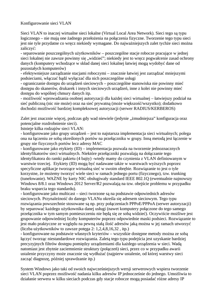 Konfigurowanie sieci VLAN Sieci VLAN to inaczej wirtualne sieci lokalne (Virtual Local Area Network). Sieci tego są typu logicznego – nie mają one żadnego przełożenia na połączenia fizyczne. Tworzenie tego typu sieci jest nie tyle przydatne co wręcz niekiedy wymagane. Do najważniejszych zalet tychże sieci można zaliczyć: - separowanie poszczególnych użytkowników – poszczególne stacje robocze pracujące w jednej sieci lokalnej nie zawsze powinny się „widzieć”; niekiedy jest to wręcz pogwałcenie zasad ochrony danych (komputery wchodzące w skład danej sieci lokalnej łatwiej mogą wydobyć dane od pozostałych komputerów) - efektywniejsze zarządzanie stacjami roboczymi – znacznie łatwiej jest zarządzać mniejszymi podsieciami, włączać bądź wyłączać dla nich poszczególne usługi - ograniczanie dostępu do urządzeń sieciowych – poszczególne stanowiska nie powinny mieć dostępu do skanerów, drukarek i innych sieciowych urządzeń, inne z kolei nie powinny mieć dostępu do wspólnej chmury danych itp. - możliwość wprowadzania osobnej autoryzacji dla każdej sieci wirtualnej – łatwiejszy podział na sieć publiczną (nic nie może) oraz na sieć prywatną (może większość/wszystko); dodatkowo dochodzi możliwość bardziej kompleksowej autoryzacji (serwer RADIUS/KERBEROS) Zalet jest znacznie więcej, podczas gdy wad niewiele (jedynie „żmudniejsza” konfiguracja oraz potencjalne rozdrobnienie sieci). Istnieje kilka rodzajów sieci VLAN: - konfigurowane jako grupy urządzeń – jest to najstarsza implementacja sieci wirtualnych; polega ona na łączeniu ze sobą określonych portów na przełączniku w grupy. Inną metodą jest łączenie w grupy nie fizycznych portów lecz adresy MAC - konfigurowane jako etykiety (ID) – implementacja pozwala na tworzenie jednoznacznych identyfikatorów sieci wirtualnych. Niektóre przełączniki pozwalają na dołączanie tego identyfikatora do ramki pakietu (4 bajty) -wtedy mamy do czynienia z VLAN definiowanym w warstwie trzeciej. Etykiety (ID) mogą być nadawane także w warstwach wyższych poprzez specyficzne aplikacje tworzące wirtualną sieć w swoim obrębie. Rozwiązanie to jest o tyle korzystne, że możemy tworzyć wiele sieci w ramach jednego portu (fizycznego), tzw. trunking (tunelowanie). WAŻNE by karty NIC obsługiwały standard IEEE 802.1Q (ewentualnie najnowszy Windows 8/8.1 oraz Windows 2012 Server/R2 pozwalają na tzw. obejście problemu w przypadku braku wsparcia tego standardu). - konfigurowane jako multicast – sieci tworzone są na podstawie odpowiednich adresów sieciowych. Przynależność do danego VLANu określa się adresem sieciowym. Tego typu rozwiązania powszechnie stosowane są np. przy połączeniach PPPoE/PPPoA (serwer autoryzacji) by separować każdego użytkownika danej usługi (nawet komputery połączone do tego samego przełącznika w tym samym pomieszczeniu nie będą się ze sobą widzieć). Oczywiście możliwe jest grupowanie odpowiedniej liczby komputerów poprzez odpowiednie maski podsieci. Rozwiązanie to jest mało praktyczne ze względu na pewną stałą ilość adresów jaką można w jej ramach utworzyć (liczba użytkowników to zawsze potęga 2: 1,2,4,8,16,32 , itp.) - konfigurowane na podstawie własnych kryteriów – wszystkie dostępne metody można ze sobą łączyć tworząc niestandardowe rozwiązania. Zaletą tego typu podejścia jest uzyskanie bardziej precyzyjnych filtrów dostępu pomiędzy urządzeniami dla każdego urządzenia w sieci. Wadą natomiast jest zbytnie zaciemnienie struktury (połączeń) sieci, przez co w przypadku awarii ustalenie przyczyny może znacznie się wydłużać (najpierw ustalenie, od której warstwy sieci zacząć diagnozę, później sprawdzanie itp.) System Windows jako taki od swoich najwcześniejszych wersji serwerowych wspiera tworzenie sieci VLAN poprzez możliwość nadania kilku adresów IP jednocześnie do jednego. Umożliwia to działanie serwera w kilku sieciach podczas gdy stacje robocze mogą posiadać różne adresy IP (ustawione w ramach interfejsu sieciowego serwera). Dzięki temu poszczególne komputery nie będą widzieć komputerów z innymi adresami IP. Stosując odpowiednie polityki zabezpieczeń użytkownicy nie będą mogli modyfikować ustawień sieci, a to z kolei nie pozwoli im na przełączanie się. Nie jest to jednak w pełni wsparte rozwiązanie, a tak zwany półśrodek (bolączka szczególnie systemów serwerowych). Innym rozwiązaniem jest ustawienie dodatkowego serwera autoryzacji RADIUS/KERBEROS dzięki czemu każdy komputer mógłby mieć dostęp do podstawowych usług sieciowych (dostęp do internetu) jednak dopiero w przypadku wyższej autoryzacji dana stacja zyskiwałaby możliwość pozyskiwania dostępu np. do drukarek. Niestety tego typu rozwiązanie również jest „oszukiwanym” VLANem – prawdziwy VLAN udostępnia użytkownikom izolację sieciową w ramach tej samej puli adresowej, tj. komputery znajdują się w tej samej puli (np. 192.168.1.0/24), a to urządzenie (router, serwer) zapewnia separację poszczególnych jednostek (jest to izolacja w trzeciej warstwie sieciowej). Firma Microsoft zaimplementowała obsługę pełnego VLAN w Windows 2012 Server. Dodano go z myślą o maszynach wirtualnych uruchamianych w ramach technologii Hyper-V. VLAN (Microsoft nazywa to PVLAN – Private Virtual Local Area Network) może działać w trzech trybach: - tryb promiscuous (przeważnie słowo to nie jest tłumaczone, ewentualnie używa się zwrotu trybu mieszanego) – port ten w zamierzeniu ma udostępniać komunikację ze światem zewnętrznym – zewnętrzne routery, nadrzędne serwery domenowe itp. - izolowane porty - zapewnia pełną izolację na 2 poziomie warstwy; wszystkie pakiety broadcast są ignorowane (chyba, że dotyczą komunikacji z portem promiscuous). - port komunikacyjny – porty służą do komunikacji pomiędzy sobą oraz pomiędzy portami pr