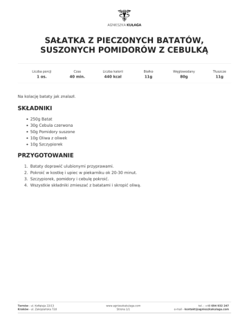 SAŁATKA Z PIECZONYCH BATATÓW, SUSZONYCH POMIDORÓW Z CEBULKĄ Liczba porcji Czas Liczba kalorii Białko Węglowodany Tłuszcze 1 os. 40 min. 440 kcal 11g 80g 11g Na kolację bataty jak znalazł. SKŁADNIKI 250g Batat 30g Cebula czerwona 50g Pomidory suszone 10g Oliwa z oliwek 10g Szczypiorek PRZYGOTOWANIE 1. Bataty doprawić ulubionymi przyprawami. 2. Pokroić w kostkę i upiec w piekarniku ok 20-30 minut. 3. Szczypiorek, pomidory i cebulę pokroić. 4. Wszystkie składniki zmieszać z batatami i skropić oliwą. Tarnów - ul. Kołłątaja 22/13 Kraków - ul. Zakopiańska 72d www.agnieszkakulaga.com Strona 1/1 tel. - +48 694 932 247 e-mail - [email protected]