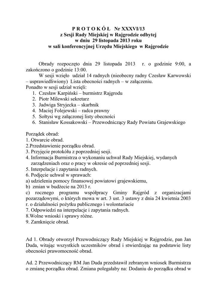 PROTOKÓŁ Nr XXXVI_13 z Sesji Rady Miejskiej w Rajgrodzie