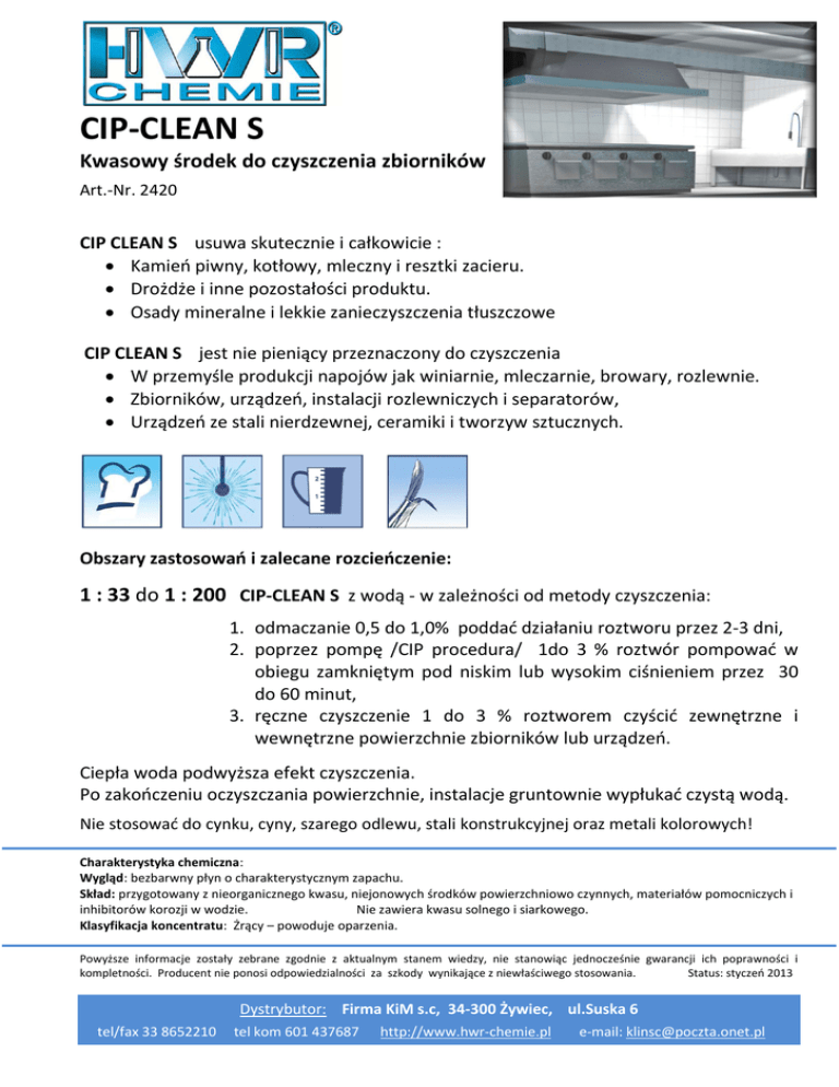 CIP-CLEAN S Kwasowy środek do czyszczenia zbiorników Art.-Nr. 2420 CIP CLEAN S usuwa skutecznie i całkowicie : Kamieo piwny, kotłowy, mleczny i resztki zacieru. Drożdże i inne pozostałości produktu. Osady mineralne i lekkie zanieczyszczenia tłuszczowe CIP CLEAN S jest nie pieniący przeznaczony do czyszczenia W przemyśle produkcji napojów jak winiarnie, mleczarnie, browary, rozlewnie. Zbiorników, urządzeo, instalacji rozlewniczych i separatorów, Urządzeo ze stali nierdzewnej, ceramiki i tworzyw sztucznych. Obszary zastosowań i zalecane rozcieńczenie: 1 : 33 do 1 : 200 CIP-CLEAN S z wodą - w zależności od metody czyszczenia: 1. odmaczanie 0,5 do 1,0% poddad działaniu roztworu przez 2-3 dni, 2. poprzez pompę /CIP procedura/ 1do 3 % roztwór pompowad w obiegu zamkniętym pod niskim lub wysokim ciśnieniem przez 30 do 60 minut, 3. ręczne czyszczenie 1 do 3 % roztworem czyścid zewnętrzne i wewnętrzne powierzchnie zbiorników lub urządzeo. Ciepła woda podwyższa efekt czyszczenia. Po zakooczeniu oczyszczania powierzchnie, instalacje gruntownie wypłukad czystą wodą. Nie stosowad do cynku, cyny, szarego odlewu, stali konstrukcyjnej oraz metali kolorowych! Charakterystyka chemiczna: Wygląd: bezbarwny płyn o charakterystycznym zapachu. Skład: przygotowany z nieorganicznego kwasu, niejonowych środków powierzchniowo czynnych, materiałów pomocniczych i inhibitorów korozji w wodzie. Nie zawiera kwasu solnego i siarkowego. Klasyfikacja koncentratu: Żrący – powoduje oparzenia. Powyższe informacje zostały zebrane zgodnie z aktualnym stanem wiedzy, nie stanowiąc jednocześnie gwarancji ich poprawności i kompletności. Producent nie ponosi odpowiedzialności za szkody wynikające z niewłaściwego stosowania. Status: styczeo 2013 Dystrybutor: Firma KiM s.c, 34-300 Żywiec, ul.Suska 6 tel/fax 33 8652210 tel kom 601 437687 http://www.hwr-chemie.pl e-mail: [email protected]
