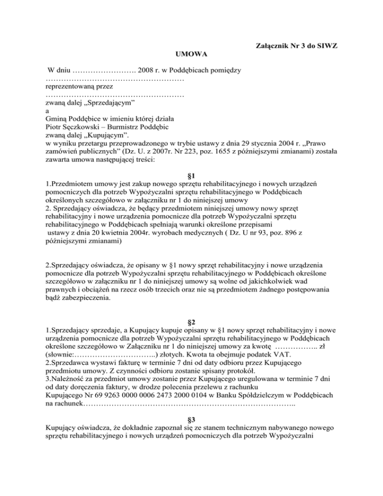 Załącznik Nr 3 do SIWZ UMOWA W dniu ……………………. 2008 r. w Poddębicach pomiędzy ……………………………………………… reprezentowaną przez ……………………………………………… zwaną dalej „Sprzedającym” a Gminą Poddębice w imieniu której działa Piotr Sęczkowski – Burmistrz Poddębic zwaną dalej „Kupującym”. w wyniku przetargu przeprowadzonego w trybie ustawy z dnia 29 stycznia 2004 r. „Prawo zamówień publicznych” (Dz. U. z 2007r. Nr 223, poz. 1655 z późniejszymi zmianami) została zawarta umowa następującej treści: §1 1.Przedmiotem umowy jest zakup nowego sprzętu rehabilitacyjnego i nowych urządzeń pomocniczych dla potrzeb WypoŜyczalni sprzętu rehabilitacyjnego w Poddębicach określonych szczegółowo w załączniku nr 1 do niniejszej umowy 2. Sprzedający oświadcza, Ŝe będący przedmiotem niniejszej umowy nowy sprzęt rehabilitacyjny i nowe urządzenia pomocnicze dla potrzeb WypoŜyczalni sprzętu rehabilitacyjnego w Poddębicach spełniają warunki określone przepisami ustawy z dnia 20 kwietnia 2004r. wyrobach medycznych ( Dz. U nr 93, poz. 896 z późniejszymi zmianami) 2.Sprzedający oświadcza, Ŝe opisany w §1 nowy sprzęt rehabilitacyjny i nowe urządzenia pomocnicze dla potrzeb WypoŜyczalni sprzętu rehabilitacyjnego w Poddębicach określone szczegółowo w załączniku nr 1 do niniejszej umowy są wolne od jakichkolwiek wad prawnych i obciąŜeń na rzecz osób trzecich oraz nie są przedmiotem Ŝadnego postępowania bądź zabezpieczenia. §2 1.Sprzedający sprzedaje, a Kupujący kupuje opisany w §1 nowy sprzęt rehabilitacyjny i nowe urządzenia pomocnicze dla potrzeb WypoŜyczalni sprzętu rehabilitacyjnego w Poddębicach określone szczegółowo w Załączniku nr 1 do niniejszej umowy za kwotę …………….. zł (słownie:…………………………..) złotych. Kwota ta obejmuje podatek VAT. 2.Sprzedawca wystawi fakturę w terminie 7 dni od daty odbioru przez Kupującego przedmiotu umowy. Z czynności odbioru zostanie spisany protokół. 3.NaleŜność za przedmiot umowy zostanie przez Kupującego uregulowana w terminie 7 dni od daty doręczenia faktury, w drodze polecenia przelewu z rachunku Kupującego Nr 69 9263 0000 0006 2473 2000 0104 w Banku Spółdzielczym w Poddębicach na rachunek……………………………………………………………………….. §3 Kupujący oświadcza, Ŝe dokładnie zapoznał się ze stanem technicznym nabywanego nowego sprzętu rehabilitacyjnego i nowych urządzeń pomocniczych dla potrzeb WypoŜyczalni sprzętu rehabilitacyjnego w Poddębicach określonych szczegółowo w załączniku nr 1 do niniejszej umowy. §4 Sprzedający udziela Kupującemu gwarancji na przedmiot umowy na warunkach określonych w załączniku nr 2 do umowy §5 W sprawach nie uregulowanych w umowie zastosowanie mają odpowiednie przepisy Kodeksu cywilnego oraz ustawy Prawo zamówień publicznych. §6 Wszelkie zmiany umowy wymagają zachowania formy pisemnej pod rygorem niewaŜności. §7 Umowę sporządzono w czterech jednobrzmiących egzemplarzach, po dwa dla kaŜdej ze stron. ………………………………………. Sprzedający …………………………………… Kupujący Załącznik nr 1 do Umowy z dnia …………..2008r Nowy sprzęt rehabilitacyjny i nowe urządzenia pomocnicze dla potrzeb WypoŜyczalni sprzętu rehabilitacyjnego w Poddębicach Lp 1 2 3 4 5 6 7 Nazwa Stabilizator barku – odciąŜający z materiału oddychającego Stabilizator kolanowy – z szynami bocznymi i zegarem Stabilizator na kostkę – z panelami bocznymi Stabilizator na łokieć – z regulacją kąta zgięcia i zegarem Balkonik na dwóch kółkach – aluminiowy z regulacją wysokości Balkonik na 4 kółkach – z koszykiem, siedziskiem, hamulcami Deska do przesiadania się (33x60) – z uchwytami Deska do przesiadania się (33x75) – z uchwytami ze wzmocnieniem Rower rehabilitacyjny – magnetyczny, z licznikiem 9 pomiaru ciśnienia i pomiarem spalania kalorii Wózek kąpielowy – 10 prysznicowo – kąpielowy na kółkach Monitor oddechu dla dzieci – 11 przenośny do 40 gram 8 Ilość sztuk 3 6 3 3 20 20 4 4 4 3 3 12 Inhalator dyszowy 4 13 NawilŜacz powietrza 3 Fotelik dla dzieci – na kółkach 14 z zagłówkami i stolikiem 2 15 Kule z uchylną obejmą 23 Laska inwalidzka – aluminiowa z drewnianą 16 rączką, drewnianą wysokością Lasko-krzesło- laska z 17 siedziskiem 20 10 Cena jednostkowa Wartość netto Wartość brutto Kołnierz ortopedyczny – 18 Kampa z cienkiego tworzywa 10 z otworem 19 Piłka rehabilitacyjna – z ABS 10 Kula łokciowa prawa i lewa – 20 aluminiowa z uchwytem 21 22 23 24 anatomicznym Kula pachowa prawa i lewa – aluminiowa z miękką wyściółką Rotor kończyn dolnych – elektryczny Rotor kończyn górnych – elektryczny, wyprofilowane uchwyty na ręce Siedzisko do wanny – obrotowe z powłoką antypoślizgową 25 Krzesło toaletowe Laska dla niewidomych – 11 13 5 5 7 4 26 składana, aluminiowa 5 27 BieŜnia elektryczna 3 Krzesło rehabilitacyjne dla dzieci – z moŜliwością 28 wychylenia w przestrzeni, regulacja długości i kąta siedzenia, stolik 5 29 Tor do nauki chodzenia 2 Parapodium statyczne dla dzieci – miękkie obejmy z 30 podwójnym systemem bezpieczeństwa Siedzisko uniwersalne – 31 Sakwa rehabilitacyjna skórzana Rowerek trójkołowy dla dorosłych z zachwianym 32 poczuciem równowagi – składany z pochylonymi kołami Rowerek trójkołowy dla dzieci z poraŜeniem mózgowym 33 oraz z zachwianym poczuciem równowagi – ze stabilizatorem na nogi Sprzęt rehabilitacyjny – 34 masaŜer do ciała z podczerwienią Materac – rehabilitacyjny, trzy 35 częściowy, składany 2 7 1 1 3 5 36 Lampy sollux – z trzema nakładkami leczniczymi 37 Lampy Bioptrom 3 3 240 Załącznik nr 2 do Umowy z dnia ………. 2008r. Sprzedający udziela kupującemu gwarancji na przedmiot umowy : Lp. 1 2 3 