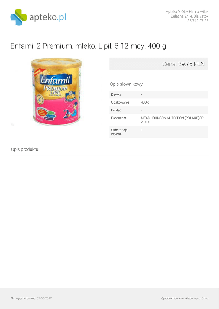 Apteka VIOLA Halina wiluk Żelazna 9/14, Białystok 85 742 27 35 Enfamil 2 Premium, mleko, Lipil, 6-12 mcy, 400 g Cena: 29,75 PLN Opis słownikowy Dawka - Opakowanie 400 g Postać - Producent MEAD JOHNSON NUTRITION (POLAND)SP. Z O.O. Substancja czynna - Opis produktu Plik wygenerowano: 07-03-2017 Powered by TCPDF (www.tcpdf.org) Oprogramowanie sklepu: AptusShop
