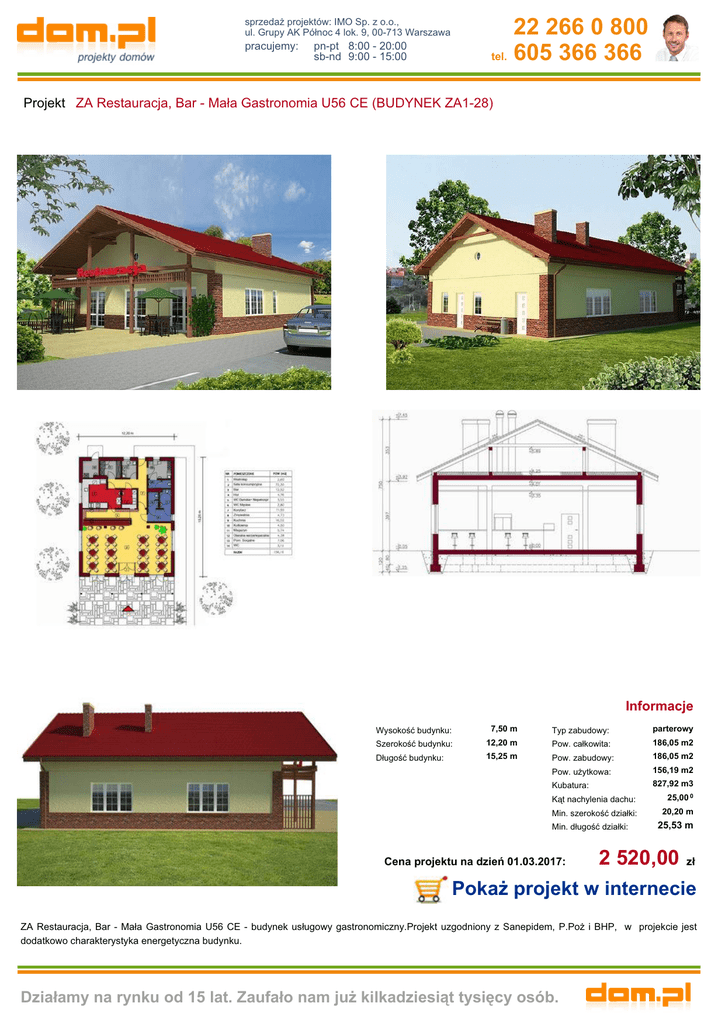 22 266 0 800 tel. 605 366 366 sprzedaż projektów: IMO Sp. z o.o., ul. Grupy AK Północ 4 lok. 9, 00-713 Warszawa pracujemy: pn-pt 8:00 - 20:00 sb-nd 9:00 - 15:00 Projekt ZA Restauracja, Bar - Mała Gastronomia U56 CE (BUDYNEK ZA1-28) Informacje Wysokość budynku: 7,50 m Typ zabudowy: parterowy Szerokość budynku: 12,20 m Pow. całkowita: 186,05 m2 Długość budynku: 15,25 m Pow. zabudowy: 186,05 m2 Pow. użytkowa: 156,19 m2 Kubatura: 827,92 m3 Kąt nachylenia dachu: 25,00 0 Min. szerokość działki: 20,20 m Min. długość działki: Cena projektu na dzień 01.03.2017: 25,53 m 2 520,00 zł Pokaż projekt w internecie ZA Restauracja, Bar - Mała Gastronomia U56 CE - budynek usługowy gastronomiczny.Projekt uzgodniony z Sanepidem, P.Poż i BHP, w projekcie jest dodatkowo charakterystyka energetyczna budynku. Działamy na rynku od 15 lat. Zaufało nam już kilkadziesiąt tysięcy osób.