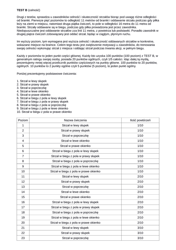 TEST B (celność) Drugi z testów, sprawdza u zawodników celność i skuteczność strzałów biorąc pod uwagę różne odległości od bramki. Pierwsze pięć poziomów to odległość 11 metrów od bramki i oddawanie strzału podczas gdy piłka leży na ziemi w miejscu, natomiast druga piątka ćwiczeń, to pole w odległości 16 metra do 11 metra od bramki. Strzały oddawane są w biegu, podczas gdy piłka prowadzona jest przez zawodnika. Niedopuszczalne jest oddawanie strzałów zza linii 11 metra, z powietrza lub podstawki. Ponadto zawodnik w drugiej piątce ćwiczeń zobowiązany jest oddać strzał, będąc w ciągłym, płynnym ruchu. Im wyższy poziom, tym wymagana jest wyższa celność i skuteczność oddawanych strzałów w konkretne, wskazane miejsce na bramce. Celem tego testu jest zwiększenie motywacji u zawodników, do trenowania swojej celności wykonując strzał z miejsca i oddając strzał podczas trwania akcji, w pełnym biegu. Każdy z poziomów to jeden punkt części głównej. Każdy kto uzyska 100 punktów (100 poziom) z TEST B, w generalnym ratingu swojej osoby, posiada 20 punktów ogólnych, czyli 1/5 całości. Idąc dalej tą myślą, prezentujemy mniej więcej przelicznik punktów częściowych na punkty główne. 100 punktów to 20 punktów, ogólnych. 10 punktów to 2 punkty ogólne czyli 5 punktów (5 poziom), to jeden punkt ogólny. Poniżej prezentujemy podstawowe ćwiczenia: 1. Strzał w lewy słupek 2. Strzał w prawy słupek 3. Strzał w poprzeczkę 4. Strzał w lewe okienko 5. Strzał w prawe okienko 6. Strzał w biegu z pola w lewy słupek 7. Strzał w biegu z pola w prawy słupek 8. Strzał w biegu z pola w poprzeczkę 9. Strzał w biegu z pola w lewe okienko 10. Strzał w biegu z pola w prawe okienko Poziom Nazwa ćwiczenia Ilość powtórzeń 1 Strzał w lewy słupek 1/10 2 Strzał w prawy słupek 1/10 3 Strzał w poprzeczkę 1/10 4 Strzał w lewe okienko 1/10 5 Strzał w prawe okienko 1/10 6 Strzał w biegu z pola w lewy słupek 1/10 7 Strzał w biegu z pola w prawy słupek 1/10 8 Strzał w biegu z pola w poprzeczkę 1/10 9 Strzał w biegu z pola w lewe okienko 1/10 10 Strzał w biegu z pola w prawe okienko 1/10 11 Strzał w lewy słupek 2/10 12 Strzał w prawy słupek 2/10 13 Strzał w poprzeczkę 2/10 14 Strzał w lewe okienko 2/10 15 Strzał w prawe okienko 2/10 16 Strzał w biegu z pola w lewy słupek 2/10 17 Strzał w biegu z pola w prawy słupek 2/10 18 Strzał w biegu z pola w poprzeczkę 2/10 19 Strzał w biegu z pola w lewe okienko 2/10 20 Strzał w biegu z pola w prawe okienko 2/10 21 Strzał w lewy słupek 3/10 22 Strzał w prawy słupek 3/10 23 Strzał w poprzeczkę 3/10 24 Strzał w lewe okienko 3/10 25 Strzał w prawe okienko 3/10 26 Strzał w biegu z pola w lewy słupek 3/10 27 Strzał w biegu z pola w prawy słupek 3/10 28 Strzał w biegu z pola w poprzeczkę 3/10 29 Strzał w biegu z pola w lewe okienko 3/10 30 Strzał w biegu z pola w prawe okienko 3/10 31 Strzał w lewy słupek 4/10 32 Strzał w prawy słupek 4/10 33 Strzał w poprzeczkę 4/10 34 Strzał w lewe okienko 4/10 35 Strzał w prawe okienko 4/10 36 Strzał w biegu z pola w lewy słupek 4/10 37 Strzał w biegu z pola w prawy słupek 4/10 38 Strzał w biegu z pola w poprzeczkę 4/10 39 Strzał w biegu z pola w lewe okienko 4/10 40 Strzał w biegu z pola w prawe okienko 4/10 41 Strzał w lewy słupek 5/10 42 Strzał w prawy słupek 5/10 43 Strzał w poprzeczkę 5/10 44 Strzał w lewe okienko 5/10 45 Strzał w prawe okienko 5/10 46 Strzał w biegu z pola w lewy słupek 5/10 47 Strzał w biegu z pola w prawy słupek 5/10 48 Strzał w biegu z pola w poprzeczkę 5/10 49 Strzał w biegu z pola w lewe okienko 5/10 50 Strzał w biegu z pola w prawe okienko 5/10 51 Strzał w lewy słupek 6/10 52 Strzał w prawy słupek 6/10 53 Strzał w poprzeczkę 6/10 54 Strzał w lewe okienko 6/10 55 Strzał w prawe okienko 6/10 56 Strzał w biegu z pola w lewy słupek 6/10 57 Strzał w biegu z pola w prawy słupek 6/10 58 Strzał w biegu z pola w poprzeczkę 6/10 59 Strzał w biegu z pola w lewe okienko 6/10 60 Strzał w biegu z pola w prawe okienko 6/10 61 Strzał w lewy słupek 7/10 62 Strzał w prawy słupek 7/10 63 Strzał w poprzeczkę 7/10 64 Strzał w lewe okienko 7/10 65 Strzał w prawe okienko 7/10 66 Strzał w biegu z pola w lewy słupek 7/10 67 Strzał w biegu z pola w prawy słupek 7/10 68 Strzał w biegu z pola w poprzeczkę 7/10 69 Strzał w biegu z pola w lewe okienko 7/10 70 Strzał w biegu z pola w prawe okienko 7/10 71 Strzał w lewy słupek 8/10 72 Strzał w prawy słupek 8/10 73 Strzał w poprzeczkę 8/10 74 Strzał w lewe okienko 8/10 75 Strzał w prawe okienko 8/10 76 Strzał w biegu z pola w lewy słupek 8/10 77 Strzał w biegu z pola w prawy słupek 8/10 78 Strzał w biegu z pola w poprzeczkę 8/10 79 Strzał w biegu z pola w lewe okienko 8/10 80 Strzał w biegu z pola w prawe okienko 8/10 81 Strzał w lewy słupek 9/10 82 Strzał w prawy słupek 9/10 83 Strzał w poprzeczkę 9/10 84 Strzał w lewe okienko 9/10 85 Strzał w prawe okienko 9/10 86 Strzał w biegu z pola w lewy słupek 9/10 87 Strzał w biegu z pola w prawy słupek 9/10 88 Strzał w biegu z pola w poprzeczkę 9/10 89 Strzał w biegu z pola w lewe okienko 9/10 90 Strzał w biegu z pola w prawe okienko 9/10 91 Strzał w lewy słupek 10/10 92 Strzał w prawy słupek 10/10 93 Strzał w poprzeczkę 10/10 94 Strzał w lewe okienko 10/10 95 Strzał w prawe okienko 10/10 96 Strzał w biegu z pola w lewy słupek 10/10 97 Strzał w biegu z pola w prawy słupek 10/10 98 Strzał w biegu z pola w poprzeczkę 10/10 99 Strzał w biegu z pola w lewe okienko 10/10 100 Strzał w biegu z pola w prawe okienko 10/10