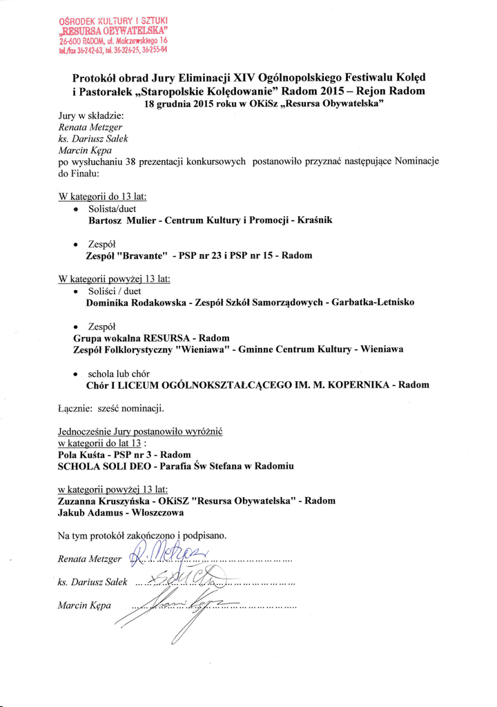 Protokół obrad Jury Eliminacji XIV Ogólnopolskiego Festiwalu Kolęd