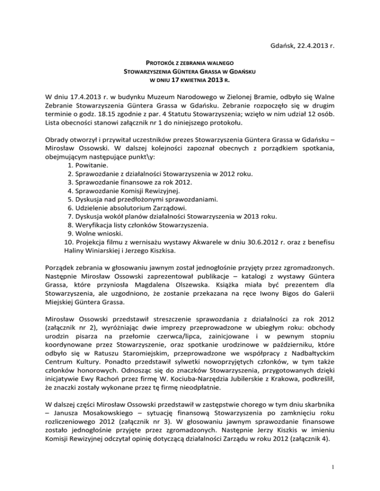 Gdańsk, 22.4.2013 r. PROTOKÓŁ Z ZEBRANIA WALNEGO STOWARZYSZENIA GÜNTERA GRASSA W GDAŃSKU W DNIU 17 KWIETNIA 2013 R. W dniu 17.4.2013 r. w budynku Muzeum Narodowego w Zielonej Bramie, odbyło się Walne Zebranie Stowarzyszenia Güntera Grassa w Gdańsku. Zebranie rozpoczęło się w drugim terminie o godz. 18.15 zgodnie z par. 4 Statutu Stowarzyszenia; wzięło w nim udział 12 osób. Lista obecności stanowi załącznik nr 1 do niniejszego protokołu. Obrady otworzył i przywitał uczestników prezes Stowarzyszenia Güntera Grassa w Gdańsku – Mirosław Ossowski. W dalszej kolejności zapoznał obecnych z porządkiem spotkania, obejmującym następujące punkt\y: 1. Powitanie. 2. Sprawozdanie z działalności Stowarzyszenia w 2012 roku. 3. Sprawozdanie finansowe za rok 2012. 4. Sprawozdanie Komisji Rewizyjnej. 5. Dyskusja nad przedłożonymi sprawozdaniami. 6. Udzielenie absolutorium Zarządowi. 7. Dyskusja wokół planów działalności Stowarzyszenia w 2013 roku. 8. Weryfikacja listy członków Stowarzyszenia. 9. Wolne wnioski. 10. Projekcja filmu z wernisażu wystawy Akwarele w dniu 30.6.2012 r. oraz z benefisu Haliny Winiarskiej i Jerzego Kiszkisa. Porządek zebrania w głosowaniu jawnym został jednogłośnie przyjęty przez zgromadzonych. Następnie Mirosław Ossowski zaprezentował publikacje – katalogi z wystawy Güntera Grassa, które przyniosła Magdalena Olszewska. Książka miała być prezentem dla Stowarzyszenia, ale uzgodniono, że zostanie przekazana na ręce Iwony Bigos do Galerii Miejskiej Güntera Grassa. Mirosław Ossowski przedstawił streszczenie sprawozdania z działalności za rok 2012 (załącznik nr 2), wyróżniając dwie imprezy przeprowadzone w ubiegłym roku: obchody urodzin pisarza na przełomie czerwca/lipca, zainicjowane i w pewnym stopniu koordynowane przez Stowarzyszenie, oraz spotkanie urodzinowe w październiku, które odbyło się w Ratuszu Staromiejskim, przeprowadzone we współpracy z Nadbałtyckim Centrum Kultury. Ponadto przedstawił sylwetki nowoprzyjętych członków, w tym także członków honorowych. Odnosząc się do znaczków Stowarzyszenia, przygotowanych dzięki inicjatywie Ewy Rachoń przez firmę W. Kociuba-Narzędzia Jubilerskie z Krakowa, podkreślił, że znaczki zostały wykonane przez tę firmę nieodpłatnie. W dalszej części Mirosław Ossowski przedstawił w zastępstwie chorego w tym dniu skarbnika – Janusza Mosakowskiego – sytuację finansową Stowarzyszenia po zamknięciu roku rozliczeniowego 2012 (załącznik nr 3). W głosowaniu jawnym sprawozdanie finansowe zostało jednogłośnie przyjęte przez zgromadzonych. Następnie Jerzy Kiszkis w imieniu Komisji Rewizyjnej odczytał opinię dotyczącą działalności Zarządu w roku 2012 (załącznik 4). 1 Uzupełniając relację Prezesa odnośnie spektaklu Idąc rakiem, zrealizowanego przez Krzysztofa Babickiego w Teatrze Miejskim w Gdyni, Maciej Kraiński i Ewa Rachoń przypomnieli okoliczności narodzenia się idei inscenizacji tego utworu dziesięć lat temu, oraz podkreślili sens tworzenia dalekosiężnych planów i snucia wizji. Przywołano przy tej okazji wcześniejsze gdańskie realizacje teatralne na podstawie twórczości pisarza, tzn. Wróżby kumaka, Było sobie miasto i Blaszany bębenek. W wyniku głosowania jawnego jednogłośnie udzielono Zarządowi absolutorium. Następnie Prezes otworzył dyskusję. Maciej Kraiński i Mieczysław Abramowicz przedstawili propozycję przygotowania spektaklu lalkowego na podstawie powieści Blaszany bębenek. Spektakl zaproponowano wystawić w perspektywie dwóch najbliższych lat na przedprożu Galerii Miejskiej we współpracy z gospodarzem kamienicy – Galerią Miejską. Stwierdzono, że w roku 2013 mija 10 lat od założenia Stowarzyszenia, jednocześnie przypominając okoliczności zebrania założycielskiego. Wojciech Charkin zaproponował, aby stworzyć projekt wizytówki członków Stowarzyszenia, pod warunkiem, że istnieje wektorowy projekt znaczka. Jednocześnie wskazał na Mirosława Rekowskiego jako potencjalnego grafika-wykonawcę. Ewa Rachoń zgłosiła natomiast propozycję opracowania legitymacji członkowskiej. Po przedyskutowaniu obydwu pomysłów stwierdzono, że można przygotować wizytówki wg jednolitego logotypu imienne dla członków Zarządu i projekt ogólnej członkowskiej. Postanowiono powrócić do pomysłu na kolejnych zebraniach Zarządu po wcześniejszym omówieniu go z Mirosławem Rekowskim. Następnie Prezes przedstawił propozycję, przygotowaną wspólnie z Magdaleną Olszewską. Dotyczyła spotkania w dniu 16 października 2013 r. (urodziny pisarza) w Muzeum Narodowym, oddziale w Pałacu Opatów w Oliwie. Spotkanie poświęcone miałoby być grafikom Güntera Grassa i objąć: wykład, prezentację grafik, teatr gotowania i ewentualnie koncert, np. Mikołaja Trzaski. Magdalena Olszewska zaproponowała, iż mogłaby przygotować prelekcję dotyczącą twórczości wizualnej artysty, jednocześnie poddając pod rozwagę pomysł, aby drugi prelegent przedstawił tematykę dotyczącą np. związków pomiędzy tekstem literackim a wizualnym. Ewa Rachoń zaproponowała wystąpienie do Urzędu Miejskiego o mały grant – do 10 tysięcy PLN na „urodziny Grassa” w 2013 r., a następnie ustalono kolejne etapy przygotowania spotkania. Kolejny wątek dotyczył Grassomanii, zaplanowanej w dniach 3-5 października. Iwona Bigos poinformowała, że w dniu 27 września ma mieć miejsce otwarcie w Galerii Miejskiej wystawy Herberta Zangsa, prototypu postaci Herberta Lanke z Blaszanego bębenka. Zapewniła o gotowości Galerii Miejskiej do współpracy, oferując zaplecze techniczne dla realizacji pomysłów Stowarzyszenia. Wskazała na możliwość przygotowania wieczoru wokół poezji Güntera Grassa. Ewa Rachoń zaproponowała opracowanie założeń konkursu dla młodzieży i studentów, który mogłoby opracować Stowarzyszenie we współpracy z uczelnią wyższą. Konkurs miałby być d