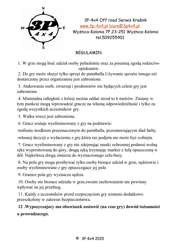 3P-4x4 Off road Serwis Kraśnik www.3p-4x4.pl [email protected] Wyżnica-Kolonia 7F,23-251 Wyżnica-Kolonia tel.509255401 REGULAMIN: 1. W grze mogą brać udział osoby pełnoletnie oraz za pisemną zgodą rodzicówopiekunów. 2. Do gry może słuzyć tylko sprzęt do paintballa.Używanie sprzetu innego niż dostarczony przez organizatora jest zabronione. 3. Atakowanie osób, zwierząt i przdmiotów nie będących celem gry jest zabronione. 4. Minimalna odległość z której można oddać strzał to 6 metrów. Zmiany w tym punkcie mogą wprowadzić gracze na własną odpowiedzielność i tylko za zgodą wszystkich uczestników gry. 5. Walka wrecz jest zabroniona. 6. Gracz zostaje wyeliminowany z gry na podstawie: -trafienie środkiem przeznaczonym do paintballa, pozostawiającym ślad farby. -własnej decyzji o wyłaczeniu z gry,która raz podjeta nie może być cofnięta. 7. Gracz wyeliminowany z gry nie zdejmując maski ochronnej podnosi wolną ręke wyprostowaną do góry, drugą ręką trzymając marker z lufą opuszczoną w dół. Najkrótsza drogą zmierza do wyznaczonego celu-bazy. 8. Na polu gry moga przebywać tylko osoby biorące udział w grze, sędziowie i osoby wyeliminowane z gry opuszcząjace jej pole. 9. Granice pola gry wyznacza sędzia. 10. Osoby nie biorace udziału w grze,swoim zachowaniem nie powinny wpływać na jej przebieg. 11. Każdy z uczestników przed rozpoczęciem gry zostanie dodatkowo przeszkolony w zakresie bezpieczeństwa. 12 .Wypozyczajacy ma obowiazek zostawić (na czas gry) dowód tożsamości u prowadzacego. © 3P 4x4 2015 3P-4x4 Off road Serwis Kraśnik www.3p-4x4.pl [email protected] Wyżnica-Kolonia 7F,23-251 Wyżnica-Kolonia tel.509255401 © 3P 4x4 2015