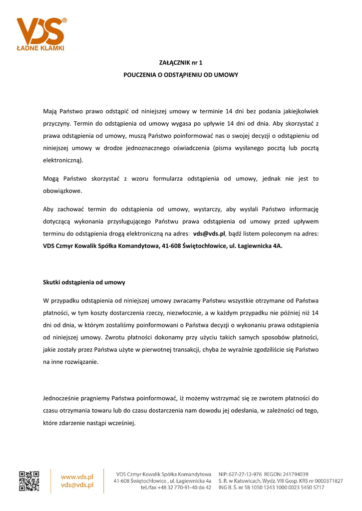 ZAŁĄCZNIK nr 1 POUCZENIA O ODSTĄPIENIU OD UMOWY Mają Państwo prawo odstąpić od niniejszej umowy w terminie 14 dni bez podania jakiejkolwiek przyczyny. Termin do odstąpienia od umowy wygasa po upływie 14 dni od dnia. Aby skorzystać z prawa odstąpienia od umowy, muszą Państwo poinformować nas o swojej decyzji o odstąpieniu od niniejszej umowy w drodze jednoznacznego oświadczenia (pisma wysłanego pocztą lub pocztą elektroniczną). Mogą Państwo skorzystać z wzoru formularza odstąpienia od umowy, jednak nie jest to obowiązkowe. Aby zachować termin do odstąpienia od umowy, wystarczy, aby wysłali Państwo informację dotyczącą wykonania przysługującego Państwu prawa odstąpienia od umowy przed upływem terminu do odstąpienia drogą elektroniczną na adres: [email protected], bądź listem poleconym na adres: VDS Czmyr Kowalik Spółka Komandytowa, 41-608 Świętochłowice, ul. Łagiewnicka 4A. Skutki odstąpienia od umowy W przypadku odstąpienia od niniejszej umowy zwracamy Państwu wszystkie otrzymane od Państwa płatności, w tym koszty dostarczenia rzeczy, niezwłocznie, a w każdym przypadku nie później niż 14 dni od dnia, w którym zostaliśmy poinformowani o Państwa decyzji o wykonaniu prawa odstąpienia od niniejszej umowy. Zwrotu płatności dokonamy przy użyciu takich samych sposobów płatności, jakie zostały przez Państwa użyte w pierwotnej transakcji, chyba że wyraźnie zgodziliście się Państwo na inne rozwiązanie. Jednocześnie pragniemy Państwa poinformować, iż możemy wstrzymać się ze zwrotem płatności do czasu otrzymania towaru lub do czasu dostarczenia nam dowodu jej odesłania, w zależności od tego, które zdarzenie nastąpi wcześniej. Proszę odesłać lub przekazać nam odsyłany towar [proszę tutaj wpisać nazwę i pełny adres pocztowy], niezwłocznie, a w każdym razie nie później niż 14 dni od dnia, w którym poinformowali nas Państwo o odstąpieniu od niniejszej umowy. Termin jest zachowany, jeżeli odeślą Państwo towar przed upływem terminu 14 dni. UWAGA! Prawo odstąpienia od umowy nie przysługuje w odniesieniu do umów: 1. o świadczenie usług, jeżeli wykonaliśmy w pełni usługę za Twoją wyraźną zgodą; 2. w której cena Towaru zależy od wahań na rynku finansowym, nad którymi nie sprawujemy kontroli, i które mogą wystąpić przed upływem terminu do odstąpienia od umowy; 3. w której przedmiotem świadczenia jest rzecz nieprefabrykowana, wyprodukowana według Twojej specyfikacji lub służąca zaspokojeniu Twoich zindywidualizowanych potrzeb; 4. w której przedmiotem świadczenia jest rzecz dostarczana w zapieczętowanym opakowaniu, której po otwarciu opakowania nie można zwrócić ze względu na ochronę zdrowia lub ze względów higienicznych, jeżeli opakowanie zostało otwarte po dostarczeniu; 5. w której przedmiotem świadczenia są rzeczy, które po dostarczeniu, ze względu na swój charakter, zostają nierozłącznie połączone z innymi rzeczami;