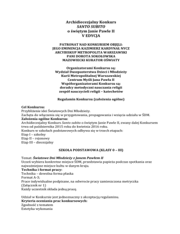 Archidiecezjalny Konkurs SANTO SUBITO o świętym Janie Pawle II V EDYCJA PATRONAT NAD KONKURSEM OBJĘLI: JEGO EMINENCJA KAZIMIERZ KARDYNAŁ NYCZ ARCYBISKUP METROPOLITA WARSZAWSKI PANI DOROTA SOKOŁOWSKA MAZOWIECKI KURATOR OŚWIATY Organizatorami Konkursu są: Wydział Duszpasterstwa Dzieci i Młodzieży Kurii Metropolitalnej Warszawskiej Centrum Myśli Jana Pawła II Współorganizatorami Konkursu są: doradcy metodyczni nauczania religii zespół nauczycieli religii – katechetów Regulamin Konkursu (założenia ogólne) Cel Konkursu: Przybliżenie idei Światowych Dni Młodzieży. Zachęta do włączenia się w przygotowania, propagowania i wzięcia udziału w ŚDM. Założenia ogólne Konkursu: Archidiecezjalny Konkurs Santo subito o świętym Janie Pawle II, zwany dalej Konkursem trwa od października 2015 roku do kwietnia 2016 roku. Konkurs w szkołach podstawowych odbywa się w trzech etapach: Etap I – szkolny Etap II – rejonowy Etap III – diecezjalny SZKOŁA PODSTAWOWA (KLASY 0 – III) Temat: Światowe Dni Młodzieży z Janem Pawłem II Uczeń wybiera konkretne miejsce ŚDM, przedstawia papieża podczas spotkania oraz najważniejsze miejsce kultu w danym kraju. Technika i format pracy: Technika – dowolna forma płaska Format A-3; Prace indywidualne podpisane, na odwrocie pracy zamieszczona metryczka (Załącznik nr 1) Każdy uczestnik składa jedną pracę. Udział w Konkursie jest jednoznaczny z akceptacją regulaminu. Kryteria oceniania prac konkursowych: Zgodność z tematem Estetyka wykonania Pomysłowość i oryginalność Walory artystyczne Kompozycja Samodzielność wykonania. Uwaga! Prace stają się własnością Organizatora, który zastrzega sobie prawo do ich bezpłatnego wykorzystywania jako materiał wystawowy oraz do ich publikowania. Terminy realizacji Konkursu: I etap – szkolny - prace należy złożyć do 18 grudnia 2015 roku do Katechetów Prace zdobywców I miejsca na etapie szkolnym z każdej kategorii wiekowej (kl. 0- III) Katecheci przekazują do rejonowego wizytatora nauczania religii – do 19 lutego 2016 roku wraz z wypełnionym protokołem z przebiegu etapu szkolnego (Załącznik nr 2) 5-osobową Komisję Konkursową na tym etapie powołuje dyrektor szkoły II etap – rejonowy Rozstrzygnięcie Konkursu na etapie rejonowym odbędzie się do 11 marca 2016 roku w parafii rejonowego wizytatora nauczania religii. Komisję Konkursową oceniającą prace na tym etapie powołuje rejonowy wizytator nauczania religii. W skład Komisji Konkursowej wchodzą: – rejonowy wizytatorzy nauczania religii – jako przewodniczący Komisji, – 2 katechetów z rejonu, – 2 nauczycieli z rejonu. Wizytator rejonowy przesyła listę laureatów Rejonu do Koordynatora Konkursu drogą elektroniczną. [email protected] Prace laureatów wraz z protokołem etapu rejonowego (Załącznik nr 3) przewodniczący Komisji Konkursowej przekazuje do 8 kwietnia 2016 roku do Wydziału Duszpasterstwa Dzieci i Młodzieży Kurii Metropolitalnej Warszawskiej. Lista osób zakwalifikowanych do etapu diecezjalnego zostanie opublikowana do końca marca 2016 roku na stronie internetowej Archidiecezji Warszawskiej: www.archidiecezja.warszawa.pl. III etap – diecezjalny Rozstrzygnięcie Konkursu na etapie diecezjalnym odbędzie się 8 kwietnia 2016 roku. Komisję Konkursową na tym etapie powołuje Dyrektor Wydziału Duszpasterstwa Dzieci i Młodzieży Kurii Metropolitalnej Warszawskiej (WDDiM KMW). W skład Komisji Konkursowej wchodzą: – Dyrektor WDDiM KMW – ks. dr Marek Przybylski – jako przewodniczący Komisji, – Koordynator Konkursu – ks. Paweł Sobstyl, – doradcy metodyczni, – nauczyciele religii. Wyniki Konkursu zostaną podane podczas Gali Finałowej 14 kwietnia 2016 roku, po zakończeniu Gali Finałowej, na stronie internetowej Kurii Metropolitalnej Warszawskiej: www.archidiecezja.warszawa.pl . Podsumowanie konkursu, oraz uroczyste wręczenie nagród odbędzie się w czwartek – 14 kwietnia 2016 roku podczas Gali Finałowej. Opiekunowie poziomu: dr Marzanna Dubińska – tel. 604 805 123; e-mail: [email protected] dr Beata Zielińska – tel. 509 936 774; e-mail: [email protected] SZKOŁA PODSTAWOWA (KLASY IV – VI) Temat: Światowe Dni Młodzieży 2016 Uczeń wykonuje plakat zachęcający do wzięcia udziału w ŚDM w Archidiecezji Warszawskiej Technika i format pracy: Technika – kolaż Formy płaskie Format A3 Prace indywidualne podpisane, na odwrocie pracy zamieszczona metryczka (Załącznik nr 1) Każdy uczestnik składa jedną pracę. Udział w Konkursie jest jednoznaczny z akceptacją regulaminu. Kryteria oceniania prac konkursowych: Zgodność z tematem Oryginalność wykonania Estetyka Samodzielność wykonania Wykorzystanie formatu Uwagi dla Komisji Konkursowych: Każdą z prac poszczególni członkowie Jury oceniają w skali od 0 do 10 pkt.; ich suma wskazuje najlepsze prace W przypadku takiej samej liczby punktów Komisja podejmuje decyzję przez głosowanie Jeżeli praca nie spełnia któregoś z wyżej wymienionych warunków pracę należy odrzucić Uwaga! Prace stają się własnością Organizatora, który zastrzega sobie prawo do ich bezpłatnego wykorzystywania jako materiał wystawowy oraz do ich publikowania. Terminy realizacji Konkursu: I etap – szkolny – prace należy złożyć do 18 grudnia 2015 roku do Katechetów Prace zdobywców I, II i III miejsca na etapie szkolnym Katecheci przekazują do rejonowego wizytatora nauczania religii – do 19 lutego 2016 roku wraz z wypełnionym protokołem z przebiegu etapu szkolnego (Załącznik nr 2) 5-osobową Komisję Konkursową na tym etapie powołuje dyrektor szkoły. II etap – rejonowy Rozstrzygnięcie Konkursu na etapie rejonowym odbędzie się do 11 marca 2016 roku w parafii rejonowego wizytatora nauczania religii. Komisję Konkursową oceniającą prace na tym etapie powołuje rejonowy wizytator nauczania religii. W skład Komisji Konkursowej wchodzą: – rejonowy wizytatorzy nauczania 