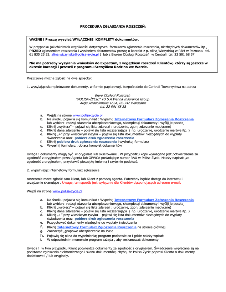 PROCEDURA ZGŁASZANIA ROSZCZEŃ: WAŻNE ! Proszę wysyłać WYŁĄCZNIE KOMPLETY dokumentów. W przypadku jakichkolwiek wątpliwości dotyczących formularza zgłoszenia roszczenia, niezbędnych dokumentów itp , PRZED zgłoszeniem roszczenia i wysłaniem dokumentów proszę o kontakt z p. Aliną Wiczyńską w RBH w Poznaniu tel. 61 835 25 33, [email protected] ) lub z Biurem Obsługi Roszczeń w Centrali tel. 22 501 68 57 Nie ma potrzeby wysyłania wniosków do Expectum, z wyjątkiem roszczeń Klientów, którzy są jeszcze w okresie karencji i przeszli z programu Szczęśliwa Rodzina we Warcie. Roszczenie można zgłosić na dwa sposoby: 1. wysyłając skompletowane dokumenty, w formie papierowej, bezpośrednio do Centrali Towarzystwa na adres: Biuro Obsługi Roszczeń "POLISA-ŻYCIE" TU S.A.Vienna Insurance Group Aleje Jerozolimskie 162A, 02-342 Warszawa tel. 22 501 68 88 a. b. c. d. e. f. g. Wejdź na stronę www.polisa-zycie.pl Na środku pojawia się komunikat : Wypełnij Internetowy Formularz Zgłoszenia Roszczenia lub wybierz rodzaj zdarzenia ubezpieczeniowego, skompletuj dokumenty i wyślij je pocztą Kliknij „wybierz” – pojawi się lista zdarzeń : urodzenie, zgon, zdarzenie medyczne) Kliknij dane zdarzenie – pojawi się lista rozszerzająca ( np. urodzenie, urodzenie martwe itp. ) Kliknij „+” przy właściwym ryzyku – pojawi się lista dokumentów niezbędnych do wypłaty świadczenia oraz pobierz druk zgłoszenia roszczenia Kliknij pobierz druk zgłoszenia roszczenia i wydrukuj formularz Wypełnij formularz , dołącz komplet dokumentów Uwaga ! dokumenty mogą być w oryginale lub skserowane . W przypadku kopii wymagane jest potwierdzenie za zgodność z oryginałem przez Agenta lub OFWCA posiadające numer RAU w Polisa-Życie. Należy napisać „za zgodność z oryginałem, przystawić pieczątkę imienną i czytelnie podpisać. 2. wypełniając internetowy formularz zgłoszenia roszczenie może zgłosić sam klient, lub Klient z pomocą agenta. Potrzebny będzie dostęp do internetu i urządzenie skanujące . Uwaga, ten sposób jest wyłącznie dla Klientów dysponujących adresem e-mail. Wejdź na stronę www.polisa-zycie.pl a. b. c. d. e. f. g. h. i. Na środku pojawia się komunikat : Wypełnij Internetowy Formularz Zgłoszenia Roszczenia lub wybierz rodzaj zdarzenia ubezpieczeniowego, skompletuj dokumenty i wyślij je pocztą Kliknij „wybierz” – pojawi się lista zdarzeń : urodzenie, zgon, zdarzenie medyczne) Kliknij dane zdarzenie – pojawi się lista rozszerzająca ( np. urodzenie, urodzenie martwe itp. ) Kliknij „+” przy właściwym ryzyku – pojawi się lista dokumentów niezbędnych do wypłaty świadczenia oraz pobierz druk zgłoszenia roszczenia Przygotować dokumenty niezbędne do wypłaty świadczenia Kliknij Internetowy Formularz Zgłoszenia Roszczenia na stronie głównej Zaznaczyć „grupowe ubezpieczenie na życie Pojawią się okna do wypełnienia; program podpowie co i gdzie należy wpisać W odpowiednim momencie program zażąda , aby zeskanować dokumenty Uwaga ! w tym przypadku Klient potwierdza dokumenty za zgodność z oryginałem. Świadczenia wypłacane są na podstawie zgłoszenia elektronicznego i skanu dokumentów, chyba, że Polisa-Życie poprosi Klienta o dokumenty dodatkowe i / lub oryginaly.