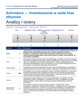 Materiał przeznaczony wyłącznie dla doradców i inwestorów profesjonalnych Schroders Inwestowanie w wiele klas aktywów Schroders — Inwestowanie w wiele klas aktywów Analizy i oceny Oceny miesięczne - sierpień 2016 r. Akcje Obligacje skarbowe Obligacje korporacyjne Obligacje high yield o ratingu inwestycyjnym 0 Kategoria 0 Ocena 0 0 Surowce + Komentarze 0 Utrzymujemy naszą dotychczasową neutralną ocenę i podtrzymujemy zdanie, że globalne rynki akcji będą poruszały się w wąskim trendzie bocznym w horyzoncie 12 miesięcy. Przy konserwatywnych założeniach co do tempa wzrostu globalnej gospodarki nasza ocena premii za ryzyko akcji sugeruje, że ich wyceny są godziwe. USA 0 Utrzymujemy neutralną ocenę rynku amerykańskiego. Uważamy, że wyceny rynkowe nie odzwierciedlają podwyższonego ryzyka wynikającego z niepewności co do działań FED oraz zbliżających się wyborów prezydenckich. Jednak bardziej defensywny charakter amerykańskiego rynku w porównaniu z innymi rynkami akcyjnymi sprawia, że pozostaje on atrakcyjną propozycją dla inwestorów. Wielka Brytania + Pozostajemy pozytywnie nastawieni do rynku akcji w Wielkiej Brytanii ze względu na poprawę prognoz dla zysków dużych spółek, wynikającą z deprecjacji funta w 2016 r. 0 Podnieśliśmy naszą ocenę europejskich akcji do neutralnej. Większość z cyklicznych wskaźników gospodarczych osiągnęła już swoje minima, podczas gdy ogłoszenie wyników stress-testów dla banków doprowadziło do większej przejrzystości sektora oraz poprawiło postrzeganie ryzyka systemowego. Akcje Europa Japonia Kraje Pacyfiku (bez Japonii) - Utrzymujemy naszą negatywną ocenę rynku japońskiego, ze względu na niskie perspektywy zysków, wynikające z wysokiego kursu jena. Przyglądamy się bliżej działaniom Banku Japonii (BoJ) wypatrując sygnałów dodatkowego luzowania ilościowego. 0 Utrzymujemy neutralną ocenę dla krajów Pacyfiku, z wyłączeniem Japonii. Pozostajemy negatywnie nastawieni do Singapuru, wyrażając obawy o wewnętrzne i zewnętrzne przeciwności, z którymi muszą się mierzyć tamtejsze przedsiębiorstwa. Jest to równoważone pozytywną oceną Australii, gdzie rynek oferuje atrakcyjne wyceny, wysokie stopy dywidendy, zaś bank centralny prowadzi łagodną politykę pieniężną. Schroders Inwestowanie w wiele klas aktywów Rynki wschodzące Kategoria Obligacje skarbowe USA Wielka Brytania Niemcy Japonia Obligacje amerykańskie powiązane z inflacją Rynki wschodzące Kategoria Obligacje korporacyjne na poziomie inwestycyjnym USA Europa 0 Ocena Materiał przeznaczony wyłącznie dla doradców i inwestorów profesjonalnych Po ponad 5 latach relatywnie słabszych wyników, sądzimy że wskaźniki wyceny dla rynków wschodzących są na niskich poziomach i dostosowane do ograniczonych perspektyw światowej gospodarki. Pozostają one jednak bardzo ryzykowną inwestycją w obliczu kondycji globalnej gospodarki. Zmiana naszej oceny na pozytywną wymaga solidnej poprawy w ramach cyklu koniunkturalnego. Komentarze 0 Pozostajemy neutralni wobec ryzyka stopy procentowej, gdyż mniej atrakcyjne poziomy wycen rekompensowane są ponownym stymulowaniem gospodarki oraz pozytywnym trendem. Wskaźniki inflacji oraz wzrostu gospodarczego nie zaskakują na plus, a zatem premia czasowa pozostanie prawdopodobnie ograniczona. 0 Utrzymujemy nasze neutralne nastawienie do ryzyka stopy procentowej w USA. Krótki koniec krzywej może ulec przesunięciu w górę wraz z bardziej jastrzębimi komunikatami ze strony członków Fed nakierowanymi na zapewnienie premii na rynku stopy procentowej. Obecnie rynek nie wycenia bowiem jakiegokolwiek prawdopodobieństwa podwyżek stóp procentowych w krótkim terminie. 0 Utrzymujemy nasze neutralne nastawienie do brytyjskich obligacji skarbowych. Niepewność polityczna i gospodarcza po decyzji o Brexicie wciąż ciąży perspektywom wzrostu. Jest to jednak równoważone wyższymi oczekiwaniami inflacyjnymi, wynikającymi z deprecjacji waluty. + Pozostajemy pozytywnie nastawieni do ryzyka stopy procentowej w Niemczech. Rentownościom obligacji o długim terminie zapadalności wciąż sprzyja akomodacyjna polityka Europejskiego Banku Centralnego, który pozostaje pod presją doprowadzenia do wzrostu inflacji. 0 Strukturalne ograniczenia wzrostu gospodarczego pozostają czynnikiem wspierającym japońskie obligacje skarbowe. Jednak przy wyśrubowanych wycenach oraz skoncentrowanej strukturze właścicielskiej oczekujemy częstszych gwałtownych ruchów na rentownościach. + Utrzymujemy naszą pozytywną ocenę rentowności tych instrumentów w ujęciu realnym, gdyż oczekujemy utrzymania się presji wynikającej z niepewności co do wzrostu i słabszego kursu dolara. 0 Pozostajemy neutralni wobec obligacji rynków wschodzących denominowanych w dolarze przy jednoczesnej preferencji papierów w lokalnej walucie. Dostrzegamy tam pozytywne rentowności w ujęciu realnym oraz stabilizującą się zmienność kursu walutowego. Ocena Komentarze 0 0 Utrzymujemy naszą neutralną ocenę wobec amerykańskiego rynku obligacji korporacyjnych o ratingu inwestycyjnym. Pomimo że wyceny nie są tak atrakcyjne jak kilka miesięcy wcześniej, popyt ze strony inwestorów pozostaje czynnikiem wspierającym tę klasę aktywów w środowisku niskich stóp procentowych. 0 Na skutek prowadzonego przez EBC programu skupu obligacji sektora korporacyjnego (ang. Corporate Sector Purchase Programme - CSPP), spready uległy zawężeniu, a wyceny nie prezentują się już atrakcyjnie. Jednak wprowadzenie podobnego programu w Wielkiej Brytanii będzie prawdopodobnie stanowiło wsparcie techniczne dla europejskich obligacji korporacyjnych. Schroders Inwestowanie w wiele klas aktywów Kategoria Ocena Materiał przeznaczony wyłącznie dla doradców i inwestorów profesjonalnych Komentarze Obligacje high yield USA 0 Utrzymujemy neutralną ocenę amerykańskich obligacji high yield. Wyceny uległy znacznemu 