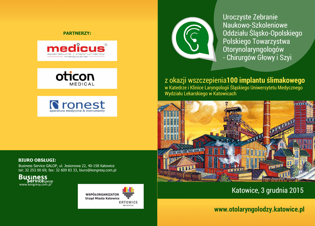 PARTNERZY: Uroczyste Zebranie Naukowo-Szkoleniowe Oddziału Śląsko-Opolskiego Polskiego Towarzystwa Otorynolaryngologów - Chirurgów Głowy i Szyi z okazji wszczepienia100 implantu ślimakowego w Katedrze i Klinice Laryngologii Śląskiego Uniwersytetu Medycznego Wydziału Lekarskiego w Katowicach BIURO OBSŁUGI: Business Service GALOP, ul. Jesionowa 22, 40-158 Katowice tel: 32 253 00 69; fax: 32 609 83 33, [email protected] Waldemar Pietzko „Pejzaż Śląski” Muzeum Śląskie www.kongresy.com.pl WSPÓŁORGANIZATOR Urząd Miasta Katowice Katowice, 3 grudnia 2015 www.otolaryngolodzy.katowice.pl Zarząd Oddziału Śląsko-Opolskiego Polskiego Towarzystwa Otolaryngologów-Chirurgó Głowy i Szyi: Przewodniczący: dr hab. med. Jarosław Markowski, Zastępca Przewodniczącego: dr med. J. Jakubiszyn, Skarbnik: dr Danuta Trybuś, Sekretarz: dr med. Małgorzata Witkowska, Członkowie: Prof. dr hab. n. med. Jan Pilch, dr med. Jadwiga Gorczyca-Tarnowska, dr med. Tomasz Rekucki, dr med. Zbigniew Świerczyński Program Naukowy Zebrania: 10:00-10:20 dr hab. n. med. Jarosław Markowski Otwarcie Konferencji i powitanie uczestników 10:20-10:40 Wykład „Niedosłuch i głuchota jako schorzenia społeczne XXI wieku” WYSTĄPIENIA ZAPROSZONYCH GOŚCI 10:40-10:50 Christoph Zimmer (Advanced Bionics) „The road to binaural hearing - Latest developments by Advanced Bionics (Droga do słyszenia obu usznego - ostatnie osiągnięcia Advanced Bionics)” 10:50-11:00 mgr inż. Magdalena Błaszczyk „Leczenie głuchoty przy zastosowaniu implantów ślimakowych. Kompleksowość i skuteczność 10-cio letniej współpracy pomiędzy firmą Medicus a Samodzielnym Publicznym Szpitalem Klinicznym im. Andrzeja Mielęckiego w Katowicach” 11:00-11:10 Robin Turek, Clinical Support Oticon „Nowe technologie i ich zastosowanie w systemie implantu ślimakowego Neuro firmy Oticon Medical” 11:10-11:30 dr n. med. Lucyna Klimczak-Gołąb „Współczesne kryteria kwalifikacji do wszczepów ślimakowych” 3 grudnia 2015 r. (czwartek) godz. 10:00 11:30-11:50 w Międzynarodowym Centrum Kongresowym Katowice, Aleja Korfantego 35 (wejście od strony Spodka) dr n. med. Aleksandra Ślaska-Kaspera „Implanty zakotwiczone w kości skroniowej” 11:50-12:10 Wystąpienia pacjentów zaimplantowanych z powodu całkowitej obustronnej głuchoty 12:10 Zakończenie Zebrania i obiad Katedra i Klinika Laryngologii Śląskiego Uniwersytetu Medycznego Wydziału Lekarskiego w Katowicach oraz Oddział Śląsko-Opolski Polskiego Towarzystwa Otorynolaryngologów - Chirurgów Głowy i Szyi mają zaszczyt zaprosić Państwa na zebranie naukowo-szkoleniowe które odbędzie Prosimy o potwierdzenie udziału w zebraniu przez stronę: www.otolaryngolodzy.katowice.pl Za udział w spotkaniu naukowym przysługują 3 punkty edukacyjne. Udział lekarzy w trakcie specjalizacji obowiązkowy.
