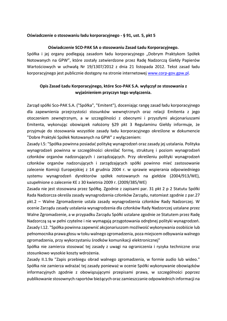 Oświadczenie SCO-PAK SA o stosowaniu Zasad Ładu Korporacyjnego.