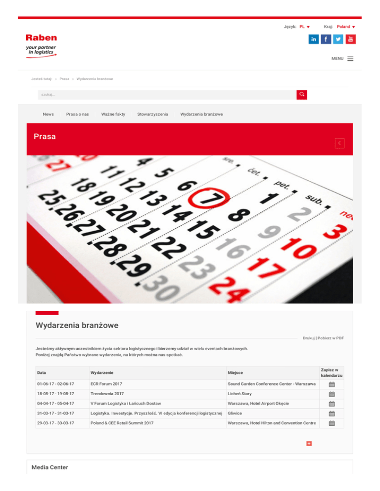 Język: PL Kraj: Poland MENU Jesteś tutaj: Prasa Wydarzenia branżowe szukaj... News Prasa o nas Ważne fakty Stowarzyszenia Wydarzenia branżowe Prasa Wydarzenia branżowe Drukuj | Pobierz w PDF Jesteśmy aktywnym uczestnikiem życia sektora logistycznego i bierzemy udział w wielu eventach branżowych. Poniżej znajdą Państwo wybrane wydarzenia, na których można nas spotkać. Data Wydarzenie Miejsce 01-06-17 - 02-06-17 ECR Forum 2017 Sound Garden Conference Center - Warszawa 18-05-17 - 19-05-17 Trendownia 2017 Licheń Stary 04-04-17 - 05-04-17 V Forum Logistyka i Łańcuch Dostaw Warszawa, Hotel Airport Okęcie 31-03-17 - 31-03-17 Logistyka. Inwestycje. Przyszłość. VI edycja konferencji logistycznej Gliwice 29-03-17 - 30-03-17 Poland & CEE Retail Summit 2017 Warszawa, Hotel Hilton and Convention Centre Media Center Zapisz w kalendarzu Filmy Zdjęcia Publikacje Logotypy Szybki kontakt Katarzyna Ostojska Marketing Manager Raben Logistics Polska +48 61 89 88 234 E-MAIL SUBSKRYBUJ INFORMACJE PRASOWE Pobierz aplikację RABENITY Poznaj nasze usługi Stopka redakcyjna Mapa strony Polityka prywatności Copyright © Raben Group