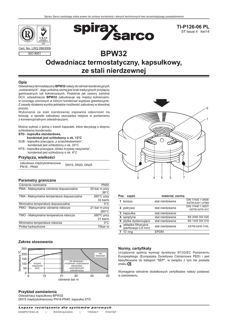 Spirax Sarco zastrzega sobie prawo do zmiany konstrukcji i danych technicznych bez wcześniejszego powiadomienia TI-P126-06 PL ST Issue 4 kwi14 Cert. No. LRQ 0963008 BPW32 ISO 9001 Odwadniacz termostatyczny, kapsułkowy, ze stali nierdzewnej Opis Odwadniacz termostatyczny BPW32 należy do odmian konstrukcyjnych „rozbieralnych”. Jego unikalną cechą jest brak tradycyjnych przyłączy gwintowanych lub kołnierzowych. Podobnie jak zawory zwrotne DCV, odwadniacze BPW32 zabudowuje się między kołnierzami, w rurociągu pionowym w którym kondensat wypływa grawitacyjnie. Z zasady działania wynika jednakże możliwość zabudowy w dowolnej pozycji. Wykonanie ze stali nierdzewnej zapewnia odporność na korozję, a sposób zabudowy oszczędza miejsce w porównaniu z konwencjonalnymi odwadniaczami. 6 1 Można wybrać z jedną z trzech kapsułek, które decydują o stopniu schłodzenia kondensatu: STD - kapsułka standardowa, kondensat jest schłodzony o ok. 13°C SUB - kapsułka pracująca „z przechłodzeniem”, kondensat jest schłodzony o ok. 24°C NTS - kapsułka pracująca „blisko krzywej nasycenia”, kondensat jest schłodzony o ok. 6°C Przyłącza, wielkości zabudowa międzykołnierzowa PN16 - PN40 DN15, DN20, DN25 2 Parametry graniczne Ciśnienie nominalne PMA - Maksymalne ciśnienie dopuszczalne PN50 50 bar m przy 38°C 260°C przy 33 barm 0°C 21 bar m przy 260°C 260°C przy 21 barm 0°C 75bar m TMA - Maksymalna temperatura dopuszczalna Minimalna temperatura dopuszczalna PMO - Maksymalne ciśnienie robocze TMO - Maksymalna temperatura robocza Minimalna temperatura robocza Próba hydrauliczna Poz. część 4 5 3 7 materiał, norma 1 korpus stal nierdzewna 2 pokrywa stal nierdzewna 3 kapsułka 4 sprężyna 5 płytka dystansująca filtracyjna 6 wkładka (perforacja 0,8 mm) 7 'O' ring stal nierdzewna stal nierdzewna stal nierdzewna stal nierdzewna DIN 17445 1.4408/ ASTM A351 CF8M DIN 17440 1.4057/ ASTM A276 431 BS 2056 302 S26 BS 1449 304 S16 ASTM A240 316L EPDM Zakres stosowania Normy, certyfikaty temperatura °C nie stosować możliwość uszkodzenia elementów wewnętrznych odwadniacza krzywa nasycenia pary Urządzenie spełnia wymogi dyrektywy 97/23/EC Parlamentu Europejskiego (Europejska Dyrektywa Ciśnieniowa PED) i jest klasyfikowane do kategorii "SEP", w związku z tym nie posiada znaku . nie stosować ciśnienie bar m Przykład zamówienia Odwadniacz kapsułkowy BPW32 DN15 międzykołnierzowy PN16-PN40, kapsułka STD. Lepsze rozwiązania dla systemów parow ych KO M P E T E N C J E | ROZ WIĄ Z ANIA | T R WA ŁY POSTĘP Wymagania odnośnie dodatkowych certyfikatów należy podawać w zamówieniu. strona 2/2 przepływ kodensatu [kg/h] Charakterystyki przepustowości Wielkości, wymiary [mm], masy [kg] Wielkość A B C masa DN15 53 53 25,5 0,30 DN20 63 63 31,5 0,57 DN25 72 72 35,5 0,83 B C ciśnienie różnicowe [bar] kondensat gorący A kondensat zimny Części zamienne Dostępne części zamienne pokazano ciągłą linią na rysunku poniżej. Dostępne części zamienne 3, 4, 5, 6, 7 2 komplet elementów wewnętrznych pokrywa Przy zamawianiu części prosimy używać określeń podanych wyżej, a także podać typ i wielkość urządzenia. Przykład: Pokrywa, BPW32 25mm. Instalacja, konserwacja Odwadniacz zalecamy zamontować na pionowym rurociągu, dla przepływu z góry na dół - kierunek przepływu wskazuje strzałka na korpusie. Jeżeli konieczny jest montaż odwadniacza na poziomym rurociągu, przed odwadniaczem należy zapewnić krótki odcinek pionowego rurociągu. Jeżeli wyrzut kondensatu następuje do atmosfery, spust należy poprowadzić do miejsca, w którym rozprężenie gorącego kondensatu nie spowoduje zagrożenia ani szkody. Ze względu na zasadę działania, nie wolno izolować odwadniacza. Wymiana elementów wewnętrznych Odkręć pokrywę (2) od korpusu (1), wyjmij płytkę dystansującą (5), kapsułkę (3), sprężynę (4) i wkład filtracyjny (6), włóż po kolei elementy zestawu naprawczego i wymień 'O' ring (7). Nałóż na gwint smar zapbiegający zatarciom. Dokręć pokrywę z zalecanym momentem siły (patrz tabela poniżej). 1 Podczas instalacji i konserwacji urządzeń, należy bezwzględnie przestrzegać przepisów BHP. Momenty siły zalecane przy dokręcaniu 6 4 poz 1i2 wielkość lub Nm mm DN15 M45 10 - 15 DN20 M51 15 - 20 DN25 M59 20 - 25 3 5 7 2 BPW32 Odwadniacz termostatyczny, kapsułkowy, ze stali nierdzewnej TI-P126-06 PL ST Issue 4 kwi14