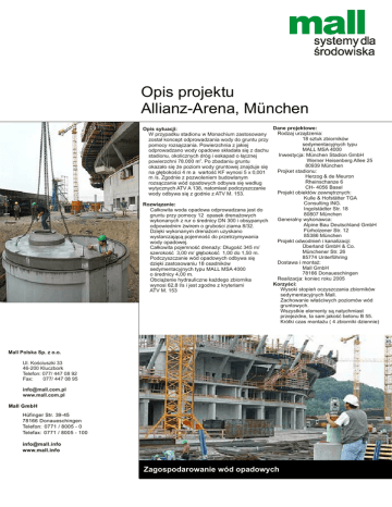 Opis projektu Allianz-Arena, München Dane projektowe: Opis sytuacji: Rodzaj urządzenia: W przypadku stadionu w Monachium zastosowany 18 sztuk zbiorników został koncept odprowadzania wody do gruntu przy sedymentacyjnych typu pomocy rozsączania. Powierzchnia z jakiej MALL MSA 4000 odprowadzano wody opadowe składała się z dachu Inwestycja: München Stadion GmbH stadionu, okolicznych dróg i eskapad o łącznej Werner Heisenberg Allee 25 powierzchni 78.000 m2. Po zbadaniu gruntu 80939 München okazało się że poziom wody gruntowej znajduje się Projket stadionu: na głębokości 4 m a wartość KF wynosi 5 x 0,001 Herzog & de Meuron m /s. Zgodnie z pozwoleniem budowlanym Rheinschanze 6 rozsączanie wód opadowych odbywa się według CH- 4056 Basel wytycznych ATV A 138, natomiast podczyszczanie Projekt obiektów zewnętrznych: wody odbywa się z godnie z ATV M. 153. Kulle & Hofstätter TGA Consulting ING. Rozwiązanie: Ingolstädter Str. 18 Całkowita woda opadowa odprowadzana jest do 80807 München gruntu przy pomocy 12 opasek drenażowych Generalny wykonawca: wykonanych z rur o średnicy DN 300 i obsypanych Alpine Bau Deutschland GmbH odpowiednim żwirem o grubości ziarna 8/32. Fürholzener Str. 12 Dzięki wykonanym drenażom uzyskano 85386 München wystarczającą pojemność do przetrzymywania Projekt odwodnień i kanalizacji: wody opadowej. Überland GmbH & Co. Całkowita pojemność drenaży: Długość 345 m/ Münchener Str. 26 szerokość 3,00 m/ głębokość 1,00 do 1,50 m. 85774 Unterföhring Podczyszczanie wód opadowych odbywa się Dostawa i montaż: dzięki zastosowaniu 18 osadników Mall GmbH sedymentacyjnych typu MALL MSA 4000 78166 Donaueschingen o średnicy 4,00 m. Realizacja: koniec roku 2005 Obciążenie hydrauliczne każdego zbiornika Korzyści: wynosi 62,8 l/s i jest zgodne z kryteriami Wysoki stopień oczyszczania zbiorników ATV M. 153 sedymentacyjnych Mall. Zachowanie właściwych poziomów wód Re gruntowych. Wszystkie elementy są natychmiast przejezdne, ta sam jakość betonu B 55. Krótki czas montażu ( 4 zbiorniki dziennie) Mall Polska Sp. z o.o. Ul. Kościuszki 33 46-200 Kluczbork Telefon: 077/ 447 08 92 Fax: 077/ 447 08 95 [email protected] www.mall.com.pl Mall GmbH Hüfinger Str. 39-45 78166 Donaueschingen Telefon: 0771 / 8005 - 0 Telefax: 0771 / 8005 - 100 [email protected] www.mall.info Zagospodarowanie wód opadowych