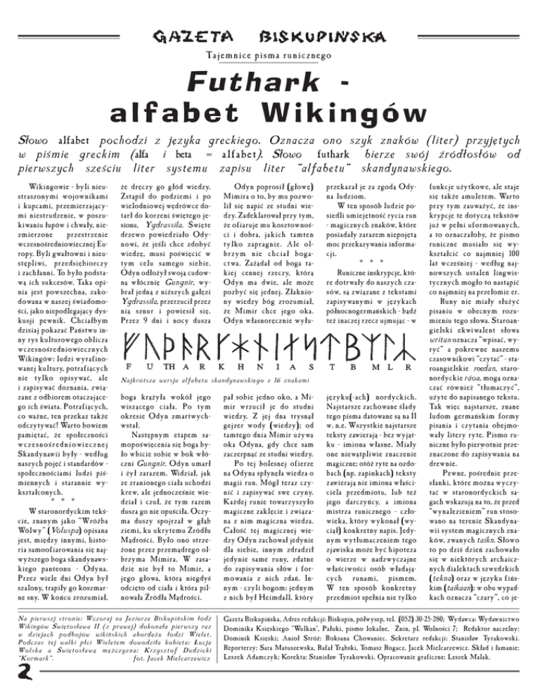 Tajemnice pisma runicznego Futhark alfabet Wikingów S³owo alfabet pochodzi z jêzyka greckiego. Oznacza ono szyk znaków (liter) przyjêtych w pimie greckim (alfa i beta = alfabet). S³owo futhark bierze swój ród³os³ów od pierwszych szeciu liter systemu zapisu liter alfabetu skandynawskiego. Wikingowie - byli nieustraszonymi wojownikami i kupcami, przemierzaj¹cymi niestrudzenie, w poszukiwaniu ³upów i chwa³y, niezmierzone przestrzenie wczesnoredniowiecznej Europy. Byli gwa³towni i nieustêpliwi, przedsiêbiorczy i zach³anni. To by³o podstaw¹ ich sukcesów. Taka opinia jest powszechna, zakodowana w naszej wiadomoci, jako niepodlegaj¹cy dyskusji pewnik. Chcia³bym dzisiaj pokazaæ Pañstwu inny rys kulturowego oblicza wczesnoredniowiecznych Wikingów: ludzi wyrafinowanej kultury, potrafi¹cych nie tylko opisywaæ, ale i zapisywaæ doznania, zwi¹zane z odbiorem otaczaj¹cego ich wiata. Potrafi¹cych, co wa¿ne, ten przekaz tak¿e odczytywaæ! Warto bowiem pamiêtaæ, ¿e spo³ecznoci wczesnoredniowiecznej Skandynawii by³y - wed³ug naszych pojêæ i standardów spo³ecznociami ludzi pimiennych i starannie wykszta³conych. * * * W staronordyckim tekcie, znanym jako Wró¿ba Wölwy (Völuspa) opisana jest, miêdzy innymi, historia samoofiarowania siê najwy¿szego boga skandynawskiego panteonu - Odyna. Przez wiele dni Odyn by³ szalony, trapi³y go koszmarne sny. W koñcu zrozumia³, ¿e drêczy go g³ód wiedzy. Zst¹pi³ do podziemi i po wielodniowej wêdrówce dotar³ do korzeni wiêtego jesionu, Ygdrassila. wiête drzewo powiedzia³o Odynowi, ¿e jeli chce zdobyæ wiedzê, musi powiêciæ w tym celu samego siebie. Odyn od³o¿y³ swoj¹ cudown¹ w³óczniê Gungnir, wybra³ jedn¹ z ni¿szych ga³êzi Ygdrassila, przerzuci³ przez ni¹ sznur i powiesi³ siê. Przez 9 dni i nocy dusza Odyn poprosi³ (g³owê) Mimira o to, by mu pozwoli³ siê napiæ ze studni wiedzy. Zadeklarowa³ przy tym, ¿e ofiaruje mu kosztownoci i dobra, jakich tamten tylko zapragnie. Ale olbrzym nie chcia³ bogactwa. Za¿¹da³ od boga takiej cennej rzeczy, któr¹ Odyn ma dwie, ale mo¿e pozbyæ siê jednej. Z³akniony wiedzy bóg zrozumia³, ¿e Mimir chce jego oka. Odyn w³asnorêcznie wy³u- przekaza³ je za zgod¹ Odyna ludziom. W ten sposób ludzie posiedli umiejêtnoæ rycia run - magicznych znaków, które posiada³y zarazem niepojêt¹ moc przekazywania informacji. * * * Runiczne inskrypcje, które dotrwa³y do naszych czasów, s¹ zwi¹zane z tekstami zapisywanymi w jêzykach pó³nocnogermañskich - b¹d te¿ inaczej rzecz ujmuj¹c - w Najkrótsza wersja alfabetu skandynawskiego z 16 znakami boga kr¹¿y³a wokó³ jego wisz¹cego cia³a. Po tym okresie Odyn zmartwychwsta³. Nastêpnym etapem samopowiêcenia siê boga by³o wbicie sobie w bok w³óczni Gungnir. Odyn umar³ i ¿y³ zarazem. Widzia³, jak ze zranionego cia³a uchodzi krew, ale jednoczenie wiedzia³ i czu³, ¿e tym razem dusza go nie opuci³a. Oczyma duszy spojrza³ w g³¹b ziemi, ku ukrytemu ród³u M¹droci. By³o ono strze¿one przez przem¹drego olbrzyma Mimira. W zasadzie nie by³ to Mimir, a jego g³owa, któr¹ niegdy odciêto od cia³a i która pilnowa³a ród³a M¹droci. Na pierwszj stronie: Wczoraj na Jeziorze Biskupiñskim ³ód Wikingów wiêtos³awa II (z prawej) dokona³a pierwszy raz w dziejach podbojów wikiñskich aborda¿u ³odzi Wielet. Podczas tej walki p³ci Wieletem dowodzi³a kobieta: £ucja Wolska a wiêtos³aw¹ mê¿czyzna: Krzysztof Dudzicki Kormark. fot. Jacek Mielcarzewicz pa³ sobie jedno oko, a Mimir wrzuci³ je do studni wiedzy. Z jej dna trysn¹³ gejzer wody (wiedzy); od tamtego dnia Mimir u¿ywa oka Odyna, gdy chce sam zaczerpn¹æ ze studni wiedzy. Po tej bolesnej ofierze na Odyna sp³ynê³a wiedza o magii run. Móg³ teraz czyniæ i zapisywaæ swe czyny. Ka¿dej runie towarzyszy³o magiczne zaklêcie i zwi¹zana z nim magiczna wiedza. Ca³oæ tej magicznej wiedzy Odyn zachowa³ jedynie dla siebie, innym zdradzi³ jedynie same runy, zdatne do zapisywania s³ów i formowania z nich zdañ. Innym - czyli bogom: jednym z nich by³ Heimdall, który jêzyku(-ach) nordyckich. Najstarsze zachowane lady tego pisma datowane s¹ na II w. n.e. Wszystkie najstarsze teksty zawieraj¹ - bez wyj¹tku - imiona w³asne. Mia³y one niew¹tpliwie znaczenie magiczne; otó¿ ryte na ozdobach (np. zapinkach) teksty zawieraj¹ nie imiona w³aciciela przedmiotu, lub te¿ jego darczyñcy, a imiona mistrza runicznego - cz³owieka, który wykona³ (wyci¹³) konkretny napis. Jedynym wyt³umaczeniem tego zjawiska mo¿e byæ hipoteza o wierze w nadzwyczajne w³aciwoci osób w³adaj¹cych runami, pismem. W ten sposób konkretny przedmiot spe³nia nie tylko funkcje u¿ytkowe, ale staje siê tak¿e amuletem. Warto przy tym zauwa¿yæ, ¿e inskrypcje te dotycz¹ tekstów ju¿ w pe³ni uformowanych, a to oznacza³oby, ¿e pismo runiczne musia³o siê wykszta³ciæ co najmniej 100 lat wczeniej - wed³ug najnowszych ustaleñ lingwistycznych mog³o to nast¹piæ co najmniej na prze³omie er. Runy nie mia³y s³u¿yæ pisaniu w obecnym rozumieniu tego s³owa. Staroangielski ekwiwalent s³owa writan oznacza wpisaæ, wyryæ a pokrewne naszemu czasownikowi czytaæ - staroangielskie roedan, staronordyckie ráoa, mog¹ oznaczaæ równie¿ t³umaczyæ, u¿yte do napisanego tekstu. Tak wiêc najstarsze, znane ludom germañskim formy pisania i czytania obejmowa³y litery ryte. Pismo runiczne by³o pierwotnie przeznaczone do zapisywania na drewnie. Pewne, porednie przes³anki, które mo¿na wyczytaæ w staronordyckich sagach wskazuj¹ na to, ¿e przed wynalezieniem run stosowano na terenie Skandynawii system magicznych znaków, zwanych taikn. S³owo to po dzi dzieñ zachowa³o siê w niektórych archaicznych dialektach szwedzkich (tekna) oraz w jêzyku fiñskim (taikaan): w obu wypadkach oznacza czary, co jeN Gazeta Biskupiñska, Adres redakcji: Biskupin, pó³wysep, tel. (052) 30-25-280; Wydawca: Wydawnictwo Dominika Ksiêskiego "