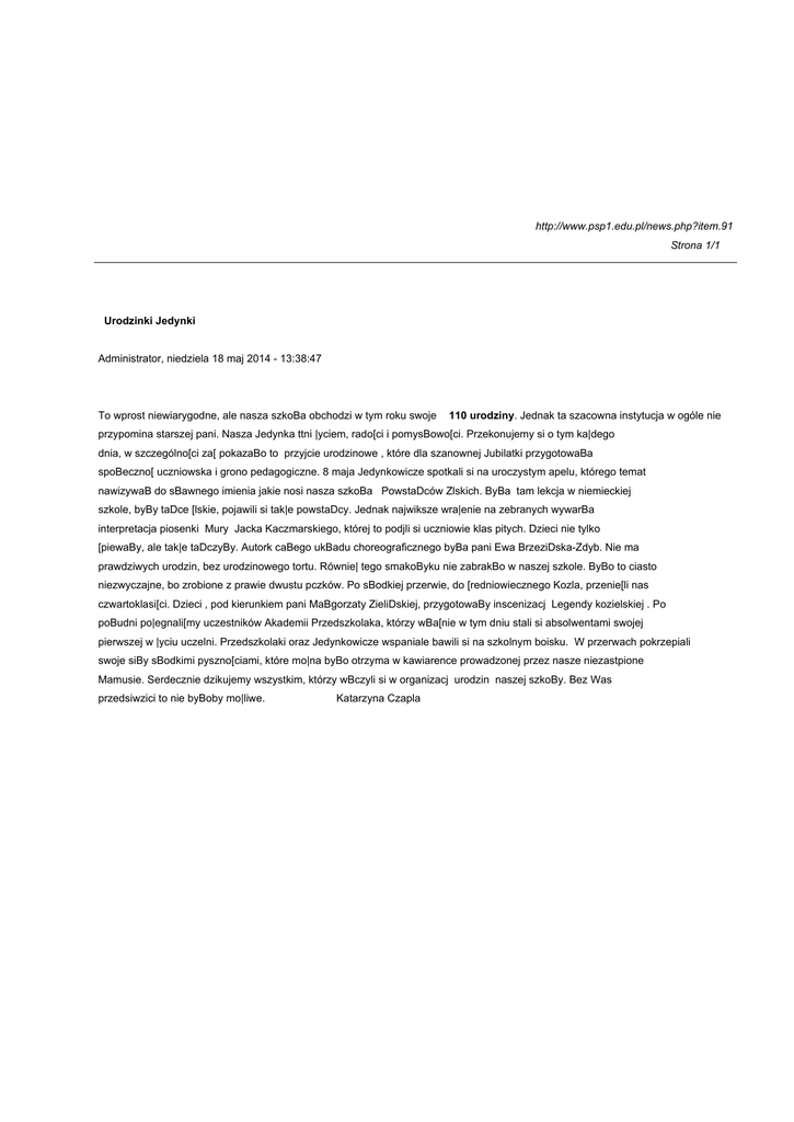 http://www.psp1.edu.pl/news.php?item.91 Strona 1/1 Urodzinki Jedynki Administrator, niedziela 18 maj 2014 - 13:38:47 To wprost niewiarygodne, ale nasza szkoBa obchodzi w tym roku swoje 110 urodziny. Jednak ta szacowna instytucja w ogóle nie przypomina starszej pani. Nasza Jedynka ttni |yciem, rado[ci i pomysBowo[ci. Przekonujemy si o tym ka|dego dnia, w szczególno[ci za[ pokazaBo to przyjcie urodzinowe , które dla szanownej Jubilatki przygotowaBa spoBeczno[ uczniowska i grono pedagogiczne. 8 maja Jedynkowicze spotkali si na uroczystym apelu, którego temat nawizywaB do sBawnego imienia jakie nosi nasza szkoBa PowstaDców Zlskich. ByBa tam lekcja w niemieckiej szkole, byBy taDce [lskie, pojawili si tak|e powstaDcy. Jednak najwiksze wra|enie na zebranych wywarBa interpretacja piosenki Mury Jacka Kaczmarskiego, której to podjli si uczniowie klas pitych. Dzieci nie tylko [piewaBy, ale tak|e taDczyBy. Autork caBego ukBadu choreograficznego byBa pani Ewa BrzeziDska-Zdyb. Nie ma prawdziwych urodzin, bez urodzinowego tortu. Równie| tego smakoByku nie zabrakBo w naszej szkole. ByBo to ciasto niezwyczajne, bo zrobione z prawie dwustu pczków. Po sBodkiej przerwie, do [redniowiecznego Kozla, przenie[li nas czwartoklasi[ci. Dzieci , pod kierunkiem pani MaBgorzaty ZieliDskiej, przygotowaBy inscenizacj Legendy kozielskiej . Po poBudni po|egnali[my uczestników Akademii Przedszkolaka, którzy wBa[nie w tym dniu stali si absolwentami swojej pierwszej w |yciu uczelni. Przedszkolaki oraz Jedynkowicze wspaniale bawili si na szkolnym boisku. W przerwach pokrzepiali swoje siBy sBodkimi pyszno[ciami, które mo|na byBo otrzyma w kawiarence prowadzonej przez nasze niezastpione Mamusie. Serdecznie dzikujemy wszystkim, którzy wBczyli si w organizacj urodzin naszej szkoBy. Bez Was przedsiwzici to nie byBoby mo|liwe. Katarzyna Czapla