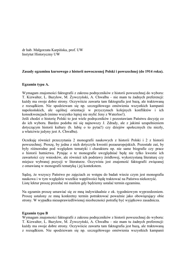 dr hab. Małgorzata Karpińska, prof. UW Instytut Historyczny UW Zasady egzaminu kursowego z historii nowoczesnej Polski i powszechnej (do 1914 roku). Egzamin typu A. Wymagam znajomości faktografii z zakresu podręczników z historii powszechnej do wyboru: T. Kizwalter, L. Bazylow, M. Żywczyński, A. Chwalba – nie mam tu żadnych preferencji: każdy ma swoje dobre strony. Oczywiście zawarta tam faktografia jest bazą, ale traktowaną z rozsądkiem. Nie spodziewam się np. szczegółowego omówienia wszystkich kampanii napoleońskich, ale ogólnej orientacji w przyczynach kolejnych konfliktów i ich konsekwencjach (mimo wszystko lepiej nie mylić Jeny z Waterloo!). Jeśli chodzi o historię Polski to jest wiele podręczników i pozostawiam Państwu decyzję co do ich wyboru. Bardzo podoba mi się najnowszy J. Zdrady, ale z jakimś uzupełnieniem dotyczącym historii kultury (b. lubię o to pytać!) czy dziejów społecznych (tu niezły, a właściwie jedyny jest A. Chwalba). Oczekuję również przeczytania 2 monografii naukowych z historii Polski i 2 z historii powszechnej. Proszę, by jedna z nich dotyczyła kwestii pozaeuropejskich. Pozostałe zaś, by były różnorodne pod względem tematyki i charakteru np. nie same biografie czy prace o historii hutnictwa. Pytając o te monografie uwzględniać będę nie tylko kwestie ich zawartości czy wniosków, ale również ich podstawy źródłowej, wykorzystaną literaturę czy miejsce wybranej pozycji w literaturze. Oczywista jest znajomość faktografii związanej z omawianą w monografii tematyką i jej kontekstem. Sądzę, że wszyscy Państwo po zajęciach ze wstępu do badań wiecie czym jest monografia naukowa i w tym względzie wszelkie wątpliwości będę traktować na Państwa niekorzyść. Listę lektur proszę przesłać mi mailem gdy będziemy ustalać termin egzaminu. Na egzamin proszę umawiać się ze mną indywidualnie z ok. tygodniowym wyprzedzeniem. Proszę ustalony ze mną konkretny termin potraktować poważnie jako obowiązujący obie strony. W wypadku nieusprawiedliwionej nieobecności potrafię być wyjątkowo zasadnicza. Egzamin typu B Wymagam znajomości faktografii z zakresu podręczników z historii powszechnej do wyboru: T. Kizwalter, L. Bazylow, M. Żywczyński, A. Chwalba – nie mam tu żadnych preferencji: każdy ma swoje dobre strony. Oczywiście zawarta tam faktografia jest bazą, ale traktowaną z rozsądkiem. Nie spodziewam się np. szczegółowego omówienia wszystkich kampanii napoleońskich, ale ogólnej orientacji w przyczynach kolejnych konfliktów i ich konsekwencjach (mimo wszystko lepiej nie mylić Jeny z Waterloo!). Jeśli chodzi o historię Polski to jest wiele podręczników i pozostawiam Państwu decyzję co do ich wyboru. Bardzo podoba mi się najnowszy J. Zdrady, ale z jakimś uzupełnieniem dotyczącym historii kultury (b. lubię o to pytać!) czy dziejów społecznych (tu niezły, a właściwie jedyny jest A. Chwalba). Wszystkim życzę miłej lektury i powodzenia na egzaminie