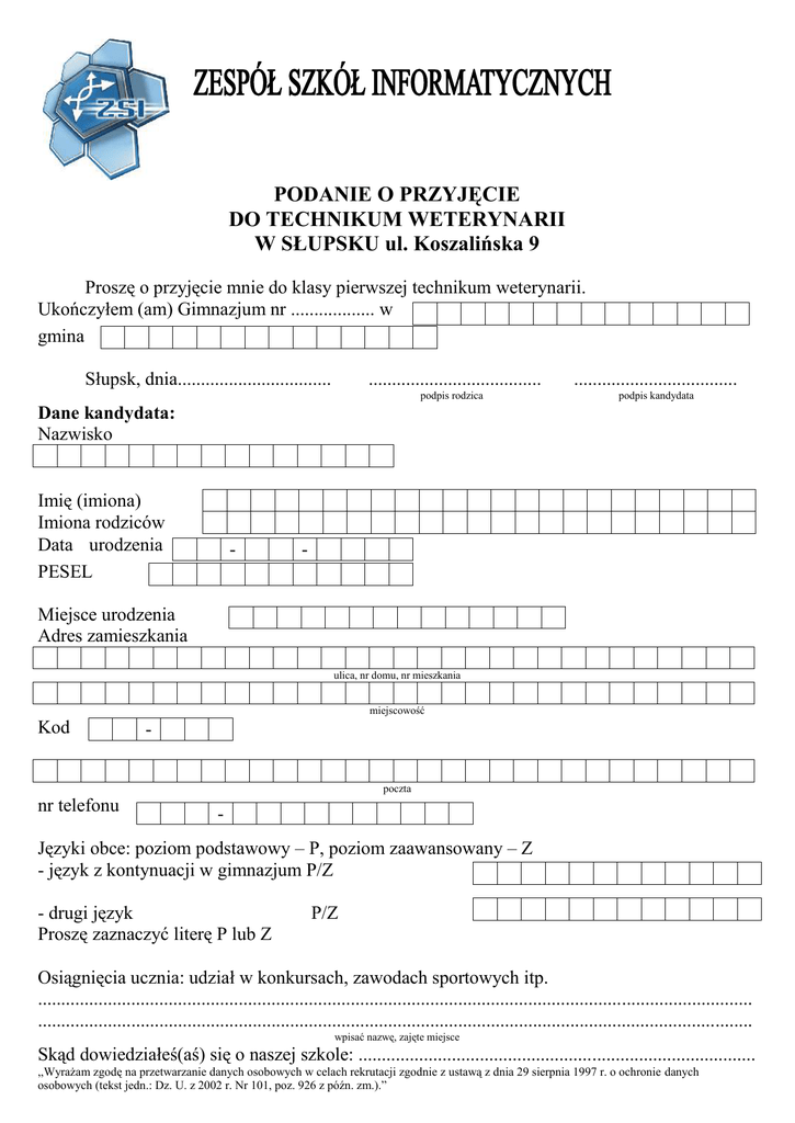 PODANIE O PRZYJĘCIE DO TECHNIKUM WETERYNARII W SŁUPSKU ul. Koszalińska 9 Proszę o przyjęcie mnie do klasy pierwszej technikum weterynarii. Ukończyłem (am) Gimnazjum nr .................. w gmina Słupsk, dnia................................. ..................................... ................................... podpis rodzica podpis kandydata Dane kandydata: Nazwisko Imię (imiona) Imiona rodziców Data urodzenia PESEL - - Miejsce urodzenia Adres zamieszkania ulica, nr domu, nr mieszkania miejscowość Kod poczta nr telefonu - Języki obce: poziom podstawowy – P, poziom zaawansowany – Z - język z kontynuacji w gimnazjum P/Z - drugi język Proszę zaznaczyć literę P lub Z P/Z Osiągnięcia ucznia: udział w konkursach, zawodach sportowych itp. ......................................................................................................................................................... ......................................................................................................................................................... wpisać nazwę, zajęte miejsce Skąd dowiedziałeś(aś) się o naszej szkole: ..................................................................................... ,,Wyrażam zgodę na przetwarzanie danych osobowych w celach rekrutacji zgodnie z ustawą z dnia 29 sierpnia 1997 r. o ochronie danych osobowych (tekst jedn.: Dz. U. z 2002 r. Nr 101, poz. 926 z późn. zm.).” OŚWIADCZENIE Ja niżej podpisany/a …………………………………………………………….. (imię i nazwisko rodzica/opiekuna) Zamieszkały/a …………………………………………………………..… (imię i nazwisko rodzica/opiekuna) legitymujący/a się dowodem osobistym wydanym przez …………………………………..…. …………………………………………………………….. świadomy/a odpowiedzialności karnej wynikającej z art. 233 § 1 kodeksu karnego przewidującego karę pozbawienia wolności do lat 3 za składanie fałszywych zeznań oświadczam - iż mój syn/córka nie był/a karany/a za przestępstwo, nie jest prowadzone przeciwko mojemu dziecku postępowanie o przestępstwie ścigane z oskarżenia publicznego, nie ma nadzoru kuratora sądowego. …………………………………… (podpis rodzica/opiekuna prawnego) Wyrażam zgodę na przetwarzanie danych osobowych oraz wizerunku dziecka na potrzeby szkoły na stronach internetowych oraz programach wykorzystywanych przez szkołę. Ustawa z dnia 29.08.1997r. o ochronie danych osobowych (Dz.U. nr 133, poz. 883). …………………………………… (miejscowość, data) …………………………………… (podpis rodzica/opiekuna prawnego)