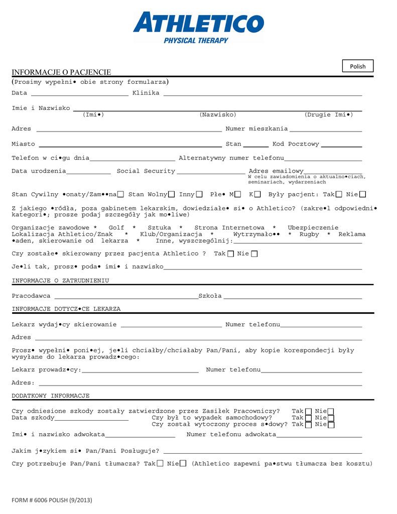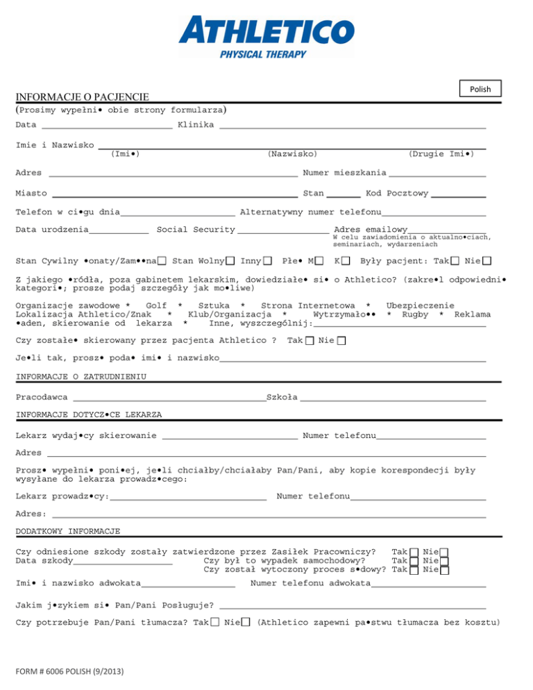 Polish INFORMACJE O PACJENCIE (Prosimy wypełni• obie strony formularza) Data Klinika Imie i Nazwisko (Imi•) (Nazwisko) (Drugie Imi•) Adres Numer mieszkania Miasto Stan Telefon w ci•gu dnia Data urodzenia Kod Pocztowy Alternatywny numer telefonu Social Security Adres emailowy W celu zawiadomienia o aktualno•ciach, seminariach, wydarzeniach Stan Cywilny •onaty/Zam••na Stan Wolny Inny Płe• M K Były pacjent: Tak Nie Z jakiego •ródła, poza gabinetem lekarskim, dowiedziałe• si• o Athletico? (zakre•l odpowiedni• kategori•; prosze podaj szczegóły jak mo•liwe) Organizacje zawodowe * Golf * Sztuka * Strona Internetowa * Lokalizacja Athletico/Znak * Klub/Organizacja * Wytrzymało•• •aden, skierowanie od lekarza * Inne, wyszczególnij: Czy zostałe• skierowany przez pacjenta Athletico ? Tak Ubezpieczenie * Rugby * Reklama Nie Je•li tak, prosz• poda• imi• i nazwisko INFORMACJE O ZATRUDNIENIU Pracodawca Szkoła INFORMACJE DOTYCZ•CE LEKARZA Lekarz wydaj•cy skierowanie Numer telefonu Adres Prosz• wypełni• poni•ej, je•li chciałby/chciałaby Pan/Pani, aby kopie korespondecji były wysyłane do lekarza prowadz•cego: Lekarz prowadz•cy: Numer telefonu Adres: DODATKOWY INFORMACJE Czy odniesione szkody zostały zatwierdzone przez Zasiłek Pracowniczy? Tak Data szkody Czy był to wypadek samochodowy? Tak Czy został wytoczony proces s•dowy? Tak Imi• i nazwisko adwokata Nie Nie Nie Numer telefonu adwokata Jakim j•zykiem si• Pan/Pani Posługuje? Czy potrzebuje Pan/Pani tłumacza? Tak FORM # 6006 POLISH (9/2013) Nie (Athletico zapewni pa•stwu tłumacza bez kosztu) INFORMACJE O UBEZPIECZENIU Główna Firma Ubezpieczeniowa Imi• i Nazwisko Posiadacza Ubezpieczenia Data urodzenia Numer identyfikacyjny Pokrewie•stwo Grupa Drugorz•dna Firma Ubezpieczeniowa Imi• i Nazwisko Posiadacza Ubezpieczenia Data urodzenia Numer identyfikacyjny Pokrewie•stwo Grupa Czy zweryfikowali•cie Pa•stwo swoje •wiadczenia terapeutyczne ze swoj• firm• ubezpieczeniow•? Tak___ Nie ___ Je•li nie, to bardzo Pa•stwa nakłaniamy do zrobienia tego. FORM # 6006 POLISH (9/2013) POLISH HISTORIA ZDROWIA PACJENTA LECZONEGO AMBULATORYJNIE Proszę dokładnie odpowiedzieć na wszystkie pytania. Imię i nazwisko pacjenta: Wiek: Wzrost: Waga: Z jakim problemem przyszedł Pan/Pani dzisiaj do przychodni? Proszę wpisać datę (w przybliżeniu) pojawienia się obecnych symptomów: W tej chwili Pana/Pani symptomy: ZMNIEJSZYŁY SIĘ POGORSZYŁY SIĘ NIE ZMIENIŁY SIĘ Jakiemu leczeniu poddał się Pan/Pani w związku z obecnym problemem (zakreśl): Chiropraktyka Akupunktura Zastrzyki Rehabilitacja/Terapia Zajęciowa Inne: Czy korzystał Pan/Pani z rehabilitacji/terapii zajęciowej w ciągu ostatniego roku kalendarzowego? TAK NIE Proszę podać przybliżoną liczbę zajęc terapeutycznych, którym był Pan/Pani poddany w tym roku kalendarzowym Badania specjalistyczne przeprowadzone w związku z problemem i ich wyniki (zakreśl): Prześwietlenie rentgenem Scyntygrafia (skan) kości Rezonans magnetyczny (MRI) Tomografia komputerowa Inne: Czynność wypełniająca Pana/Pani dzień pracy (zakreśl): Siedzenie Dźwiganie (CT) Stanie Chodzenie Inne Zalecenia lekarskie dotyczące ograniczenia pracy: Lekka praca Bez ograniczeń Zwolnienie ZAJĘCIA WYKONYWANE DLA PRZYJEMNOŚCI: włączając sporty: Proszę podać nazwy wszystkich obecnie przyjmowanych lekarstw (tabletki, zastrzyki i/oraz plastry medyczne): ALERGIE: Proszę podać listę lekarstw, na które jest Pan/Pani uczulony: Proszę wymienić choroby oraz wszelkie zabiegi/operacje, które Pan/Pani przeszedł (proszę zaznaczyć, czy dotyczyły obecnego problemu) Czy w ostatnim miesiącu dokuczały Panu/Pani uczucia chandry, depresji lub beznadziei? TAK NIE Czy w ostatnim miesiącu stracił Pan/Pani zainteresowanie lub przestał czerpać przyjemność z wykonywania różnych rzeczy? TAK NIE Czy chciałby Pan/Pani zasięgnąć w związku z tym pomocy? TAK TAK, ALE NIE DZISIAJ NIE Czy jest jeszcze coś istotnego, o czym powinniśmy wiedzieć w związku z leczeniem? Czego Pan/Pani oczekuje po terapii? 22. Wykres Ciała: Wykorzystując podane z boku symbole proszę zaznaczyć rejony na wykresie gdzie odczuwa Pan/Pani symptomy: Obecnie moje symptomy: PRZYCHODZĄ I ODCHODZĄ SĄ STAŁE Co sprawia, że czuje się Pan/Pani lepiej: Co sprawia, że czuje się Pan/Pani gorzej: Form # 6010 (09/2013) - POLISH ↓ O ║║ ≡ Ostry ból Tępy ból Drętwienie Mrowienie SĄ ODCZUWALNE, ALE ZMIENIAJĄ SIĘ W ZALEŻNOŚCI OD WYKONYWANEJ CZYNNOŚCI Zgoda i oświadczenie o odpowiedzialności finansowej 1. ZGODA NA LECZENIE. Wyrażam zgodę i upoważniam mojego fizykoterapeute , terapeute zajęciowego i innych pracowników służby zdrowia i asystentów , którzy mogą być zaangażowani w moją opieke , zapewnienie opieki i leczenia zaleconego przez i za konieczne lub wskazane przez mojego lekarza (y) . Przyjmuję do wiadomości , że nie otrzymalam gwarancji, o wynikach leczenia. 2. OBECNOŚĆ I ANULOWANIA. Rozumiem znaczenie mojego uczestniczenia na terapii regularnie i przybyciu na czas mojej wizyty. Przyjmuję do wiadomości, że moja wizyta moze zostać przełożona , jeśli spoznie sie ponad 15 minut na umowiona wizyte. Rozumiem jak wazne jest ustalenie i zaplanowanie spotkan wczesniej i rozumiem, że jesli mam ustalony czas na terapie w jednym tygodniu to nie znaczy ze są te wizyty automatycznie ustalone na nastepne kolejne tygodnie. Zgadzam się, ze poinformuje co najmniej 24 godziny przed, kiedy muszę odwołać lub przełożyć termin wizyty i że anulowanie mojej wizyty mniej niż 24 godzin lub jesli nie przybede na wizyte będzie prawdopodobnie prowadzić do anulowania wizyty / nieobecnosci, i opłata bedzie od 30 dolarów lub 60 dolarów w zależności od rodzaju wizyty. 3. ODPOWIEDZIALNOŚĆ PŁATNOŚI. Przyjmuję do wiadomości, że w zamian za usługi świadczone dla mnie przez Athletico, jestem finansowo odpowied