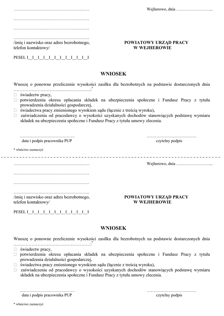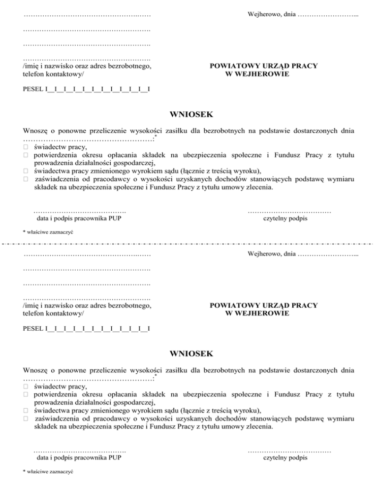 ………………………………………….…… Wejherowo, dnia ……………………... ………………………………………………. ………………………………………………. ………………………………………………. /imię i nazwisko oraz adres bezrobotnego, telefon kontaktowy/ POWIATOWY URZĄD PRACY W WEJHEROWIE PESEL I__I__I__I__I__I__I__I__I__I__I__I WNIOSEK Wnoszę o ponowne przeliczenie wysokości zasiłku dla bezrobotnych na podstawie dostarczonych dnia ……………………………………………:* świadectw pracy, potwierdzenia okresu opłacania składek na ubezpieczenia społeczne i Fundusz Pracy z tytułu prowadzenia działalności gospodarczej, świadectwa pracy zmienionego wyrokiem sądu (łącznie z treścią wyroku), zaświadczenia od pracodawcy o wysokości uzyskanych dochodów stanowiących podstawę wymiaru składek na ubezpieczenia społeczne i Fundusz Pracy z tytułu umowy zlecenia. …………………………………. data i podpis pracownika PUP ……………………………… czytelny podpis * właściwe zaznaczyć ………………………………………….…… Wejherowo, dnia ……………………... ………………………………………………. ………………………………………………. ………………………………………………. /imię i nazwisko oraz adres bezrobotnego, telefon kontaktowy/ POWIATOWY URZĄD PRACY W WEJHEROWIE PESEL I__I__I__I__I__I__I__I__I__I__I__I WNIOSEK Wnoszę o ponowne przeliczenie wysokości zasiłku dla bezrobotnych na podstawie dostarczonych dnia ……………………………………………:* świadectw pracy, potwierdzenia okresu opłacania składek na ubezpieczenia społeczne i Fundusz Pracy z tytułu prowadzenia działalności gospodarczej, świadectwa pracy zmienionego wyrokiem sądu (łącznie z treścią wyroku), zaświadczenia od pracodawcy o wysokości uzyskanych dochodów stanowiących podstawę wymiaru składek na ubezpieczenia społeczne i Fundusz Pracy z tytułu umowy zlecenia. …………………………………. data i podpis pracownika PUP * właściwe zaznaczyć ……………………………… czytelny podpis