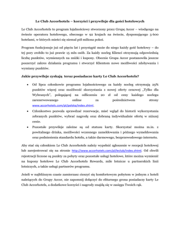 Le Club Accorhotels – korzyści i przywileje dla gości hotelowych Le Club Accorhotels to program lojalnościowy stworzony przez Grupę Accor – wiodącego na świecie operatora hotelowego, obecnego w 92 krajach na świecie, dysponującego 3 600 hotelami, w których mieści się niemal pół miliona pokoi. Program funkcjonuje już od pięciu lat i przystąpić może do niego każdy gość hotelowy – do tej pory zrobiło to już prawie 15 mln osób. Za każdy nocleg Klienci otrzymują odpowiednią liczbę punktów, wymiennych na zniżki i kupony. Obecnie Grupa Accor postanowiła jeszcze poszerzyć zakres działania programu i stworzyć Klientom nowe możliwości zdobywania i wymiany punktów. Jakie przywileje zyskają teraz posiadacze karty Le Club Accorhotels? Od lipca członkowie programu lojalnościowego za każdy nocleg otrzymają 25% punktów więcej oraz możliwość skorzystania z nowej oferty cenowej „Tylko dla Wybranych”, polegającej zarezerwowanego na odliczeniu online za 20 zł od ceny każdego pośrednictwem noclegu strony www.accorhotels.com/pl/polska/index.shtml. Członkostwo pozwala sprawdzać rezerwacje, mieć wgląd do historii wykorzystania zebranych punktów, wybrać nagrodę oraz dobraną indywidualnie ofertę w niższej cenie. Pozostałe przywileje zależne są od statusu karty. Skorzystać można m.in. z powitalnego drinka, możliwości wczesnego zameldowania i późnego wymeldowania oraz podniesienia standardu hotelu, a także darmowego, bezprzewodowego internetu. Aby stać się członkiem Le Club Accorhotels należy wypełnić zgłoszenie w recepcji hotelowej lub zarejestrować się na stronie http://www.accorhotels.com/pl/leclub/index.shtml. Od chwili rejestracji liczone są punkty za pobyty oraz pozostałe usługi hotelowe, które można wymienić na kupony hotelowe Le Club Accorhotels Rewards, mile lotnicze u partnerskich linii lotniczych, a także usługi partnerów programu. Jeżeli w najbliższym czasie zamierzasz cieszyć się komfortowym pobytem w jednym z hoteli należących do Grupy Accor, nie zapomnij dołączyć do elitarnego grona posiadaczy karty Le Club Accorhotels, a dodatkowe korzyści i nagrody znajdą się w zasięgu Twoich rąk.