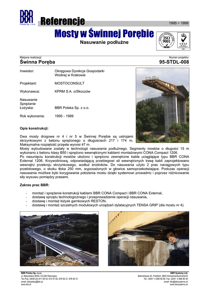Polska Sp. z o.o. Referencje Mosty w Świnnej Porębie 1995 ÷ 1999 Nasuwanie podłużne Miejsce realizacji: Numer projektu: Świnna Poręba Inwestor: Okręgowa Dyrekcja Gospodarki Wodnej w Krakowie Projektant: MOSTOCONSULT Wykonawca: KPRM S.A. o/Skoczów Nasuwanie Sprężanie Łożyska: BBR Polska Sp. z o.o. Rok wykonania: 1995 - 1999 95-STDL-008 Opis konstrukcji: Dwa mosty drogowe nr 4 i nr 5 w Świnnej Porębie są ustrojami skrzynkowymi z betonu sprężonego o długościach 217 i 174 m. Maksymalna rozpiętość przęsła wynosi 47 m. Mosty wybudowane zostały w technologii nasuwania podłużnego. Segmenty mostów o długości 15 m wykonano z betonu klasy B50 i sprężono wewnętrznymi kablami montażowymi CONA Compact 1206. Po nasunięciu konstrukcji mostów ułożono i sprężono zewnętrzne kable uciąglające typu BBR CONA External 1206. Krzywoliniową, odpowiadającą przebiegowi sił wewnętrznych trasę kabli zaprojektowano wewnątrz przekroju skrzynkowego, wzdłuż środników. Do nasuwania użyto 2 pras naciągowych typu przelotowego, o skoku tłoka 250 mm, wyposażonych w głowice samoprzekotwiające. Podczas operacji nasuwania możliwe było korygowanie położenia mostu dzięki systemowi prowadnic i poprzez różnicowanie siły wysuwu pomiędzy prasami. Zakres prac BBR: - montaż i sprężenie konstrukcji kablami BBR CONA Compact i BBR CONA External, dostawę sprzętu technologicznego i przeprowadzenie operacji nasuwania, dostawę i montaż łożysk garnkowych RESTON, dostawę i montaż szczelnych modułowych urządzeń dylatacyjnych TENSA GRIP (dla mostu nr 4). BBR Polska Sp. z o.o. ul. Marywilska 38/40, 03-228 Warszawa Tel./Fax: (0048 22) 811 50 53, 614 57 60, 676 92 21, 676 92 31 email: [email protected] www.bbr.pl BBR Systems Ltd. Bahnstrasse 23, Postfach, 8603 Schwerzenbach/Zürich Tel.: (0041 1) 806 80 60, Fax: (0041 1) 806 80 50 email: [email protected] www.bbrsystems.ch