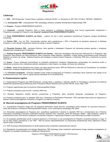 Regulamin I.Definicje 1.1. TER - TER Enterprises, Tomasz Rosa z siedzibą w Gdańsku 80-807, ul. Pohulanka 2, NIP: 583-110-59-51, REGON: 192006315. 1.1.a. Koordynator TER – przedstawiciel TER, posiadający aktualny certyfikat Koordynatora Regionalnego TER. 1.2. Program - Program PRZEZORNEGO KLIENTA. 1.3. Uczestnik - uczestnik Programu, który w trybie opisanym w niniejszym Regulaminie oraz innych regulaminach związanych z Programem przystąpił do Programu oraz otrzymał i podpisał Kartę PRZEZORNEGO KLIENTA. 1.4. Karta PRZEZORNEGO KLIENTA lub Karta – srebrna lub złot a karta wydawana Uczestnikowi Programu słuŜąca identyfikacji Uczestnika. 1.5. Partner TER - inny niŜ TER i Koordynator podmiot, który współpracuje z TER w Programie na zasadach opisanych w Katalogu Programu, w tym oferuje Uczestnikom towary lub usługi w ramach Programu. 1.6. Placówka Partnera TER - placówka Partnera, który zgodnie z Katalogiem Programu lub informacją podaną zgodnie z niniejszym Regulaminem współpracuje w Programie. 1.7. Katalog Programu PRZEZORNEGO KLIENTA lub Katalog - dokument określający listę Kuponów oferowanych w Programie, listę Partnerów, listę towarów lub usług Partnerów, które Uczestnicy mogą nabywać z Rabatem, a takŜe zasady przyznawania przez Partnerów Rabatów na towary lub usługi. Katalog Programu jest dostępny w czasie trwania Programu u Partnerów TER oraz w Internecie na stronie www.ter.pl. 1.8. Kupon - kupon wydawany Uczestnikowi na zasadach określonych niniejszym Regulaminem uprawniający do uzyskania zniŜki, w określonym procencie lub o określonej wartości wskazanej w treści Kuponu na usługę lub towar tam określony. 1.9. Rabat - kaŜda forma obniŜenia ceny towaru lub usług stosowana przez TER lub Partnerów w stosunku do Uczestników, na zasadach określonych niniejszym Regulaminem oraz Katalogiem Programu. 1.10. Formularz Uczestnika - formularz składany przez osobę przystępującą do Programu zawierający dane osobowe oraz zgodę na ich przetwarzanie przez TER, która to zgoda stanowi podstawę do ich przetwarzania. II. Postanowienia ogólne 2.1. Organizatorem Programu jest TER Enterprises, Tomasz Rosa z siedzibą w Gdańsku, 80-807 ul. Pohulanka 2, wpisanym do ewidencji działalności gospodarczej prowadzonej przez Prezydenta Miasta Gdańska pod numerem 89728, zwany dalej "TER". 2.2. Program organizowany jest na terytorium Rzeczpospolitej Polskiej. 2.3. Program prowadzony jest od dnia 1 sierpnia 2009 roku. 2.5. Niniejszy Regulamin określa warunki uczestnictwa w Programie, które Uczestnik akceptuje, przystępując do Programu. 2.6. Program prowadzony jest w siedzibie TER oraz u Partnerów (w Placówkach Partnerów). TER zastrzega sobie prawo do wyłączenia w kaŜdym czasie poszczególnych Partnerów z Programu na stałe lub czasowo. III. Warunki przystąpienia do Programu PRZEZORNEGO KLIENTA 3.1. Uczestnikami Programu mogą stać się wyłącznie pełnoletnie osoby fizyczne, posiadające pełną zdolność do czynności prawnych i adres dla doręczeń na terytorium Rzeczypospolitej Polskiej, w tym cudzoziemcy posiadający taki adres. 3.2. Warunkiem przystąpienia do Programu jest prawidłowe wypełnienie i złoŜenie w siedzibie TER lub u Koordynatora lub u Partnera Formularza Uczestnika. Formularz Uczestnika powinien zawierać imię i nazwisko, adres dla doręczeń, telefon, datę urodzenia, zgodę na przetwarzanie przez TER danych osobowych na potrzeby związane z organizacją Programu oraz własnoręczny podpis Uczestnika. 3.3. W przypadku jakichkolwiek zmian w danych podanych w Formularzu w celu przystąpienia do Programu Uczestnik powinien w ciągu 14 dni od daty zmiany powiadomić o tym TER. TER nie ponosi odpowiedzialności za ewentualne konsekwencje braku zgłoszenia zmiany danych przez Uczestnika. 3.4. TER nie ponosi odpowiedzialności za skutki podania przez Uczestnika nieprawdziwych danych. 3.5. NiezaleŜnie od postanowień nini ejszego Regulaminu TER zastrzega sobie moŜliwość ustanowienia innego sposobu przystąpienia do Programu na zasadach określonych w odrębnych regulaminach. Regulamin PROGRAMU PRZEZORNEGO KLIENTA TER Enterprises Strona 1 z 3 – WO 01.08.2009 3.6. Uczestnik przystępując do Programu, wyraŜa zgodę na przetwarzanie podanych danych na potrzeby realizacji Programu oraz akceptuje postanowienia niniejszego Regulaminu. 3.7. Udział w Programie i podanie związanych z udziałem danych jest dobrowolne. 3.8. Uczestnik moŜe przystąpić do Programu w dowolnym momencie jego trwania. 3.9. Administratorem danych osobowych Uczestnika zawartych w Formularzu Uczestnika jest TER. 3.10. TER będzie przetwarzać podane przez Uczestnika dane osobowe zawarte w Formularzu Uczestnika i objęte zgodą Uczestnika na przetwarzanie danych dla celów realizacji Programu , w tym moŜe udostępniać je Koordynatorom oraz Partnerom współpracującym z TER w Programie w celu realizacji ich uprawnień i obowiązków wynikających z organizacji Programu. TER moŜe przetwarzać dane osobowe takŜe w przyszłości dla celów marketingowych dotyczących własnych produktów i usług, a takŜe udostępniać je Koordynatorom, Partnerom, podmiotom współdziałającym z TER w organizowaniu akcji promocyjnych i marketingowych. 3.11. Uczestnikom przysługuje prawo dostępu do treści swoich danych osobowych oraz prawo ich poprawiania. 3.12. Podanie danych jest dobrowolne, lecz niezbędne dla wzięcia udziału w Programie. IV. Karty PRZEZORNEGO KLIENTA 4.1. Karta PRZEZORNEGO KLIENTA słuŜy do identyfikacji Uczestnika w Programie. KaŜda Karta posiada numer przypisany konkretnemu Uczestnikowi Programu. Uczestnik powinien niezwłocznie podpisać otrzymaną przy przystępowaniu do Programu Kartę. Niepodpisana Karta jest niewaŜna. 4.2. Uczestnik moŜe posiadać tylko jedną Kartę. 4.3. O wyborze dla Uczestnika rodzaju Karty (srebrnej lub złotej) decyduje wyłącznie TER. 4.4. Wydana Uczestnikowi Karta pozostaje własnością TER. 4.